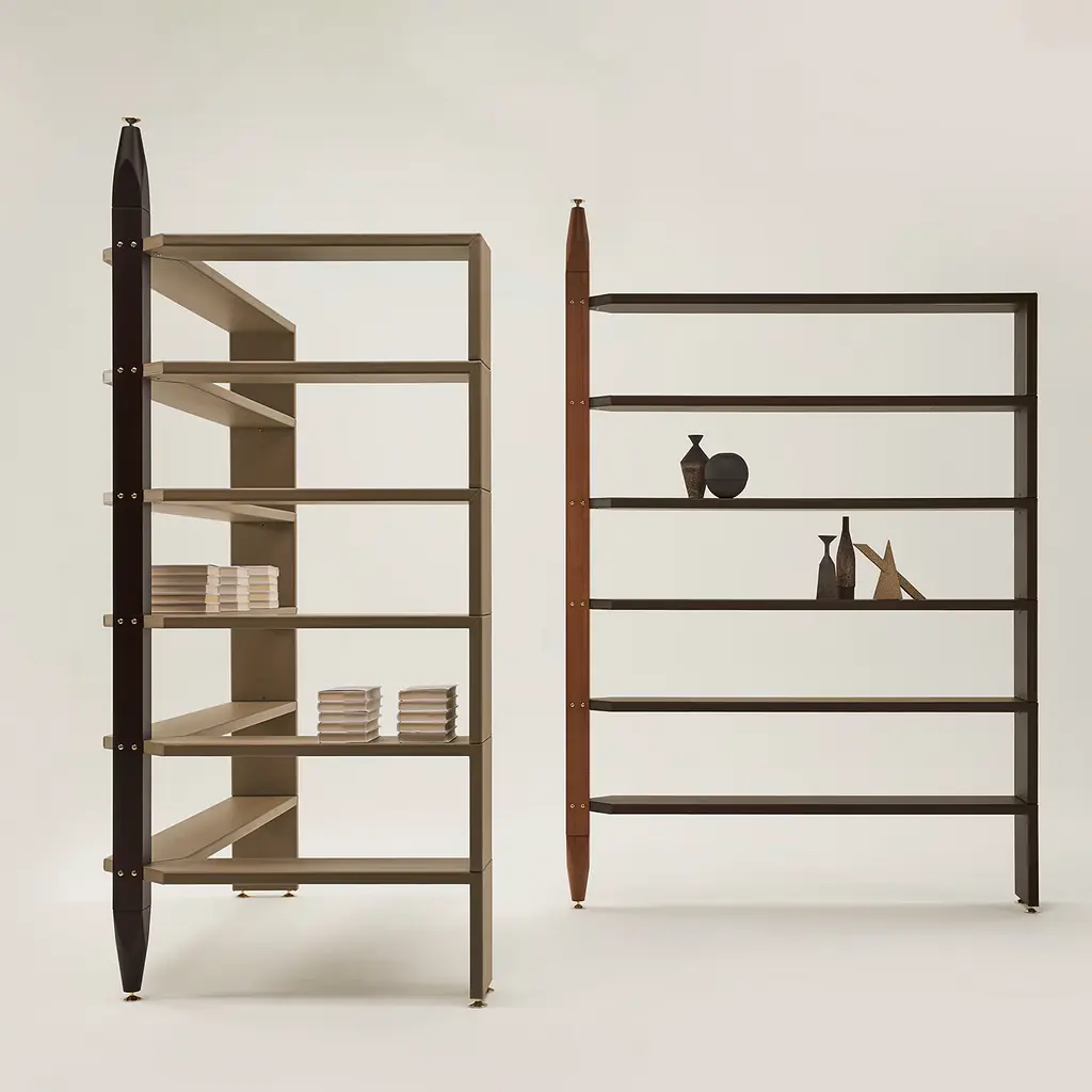 Here offered in a simple configuration with a single series of shelves, this freestanding modular bookcase boasts a clever design conceived for allowing a wide variety of configurations thanks to the central four-facet pillar. Brass leveling tips perfect the structure's functionality, while the indulgence in fine leather upholstering stats the design's distinctive sartorial elegance.