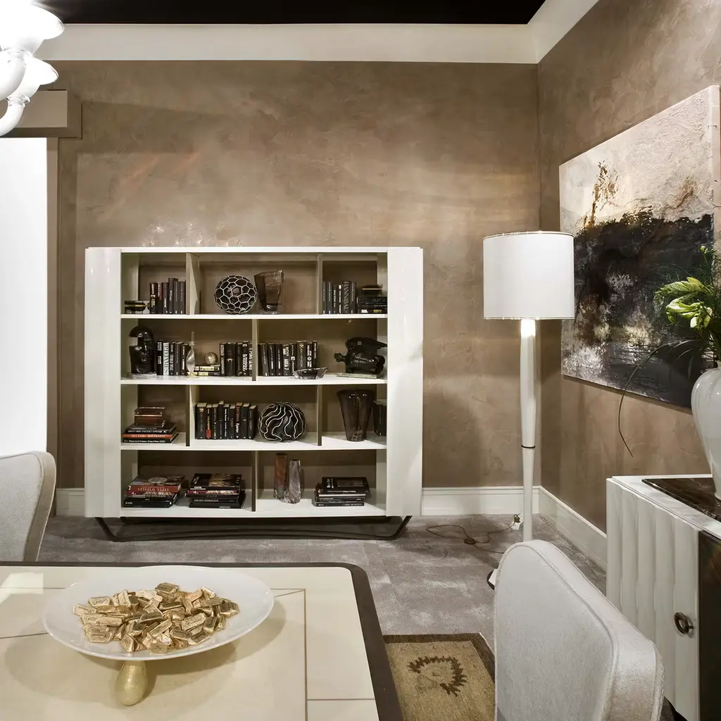 An architectural construction that evokes the classic grace of Corinthian columns, this bookcase has an open frame made of wood with white lacquered finish. Three horizontal shelves are interrupted by randomly placed vertical panels that create an irregular division of the space in an eye-catching pattern. The base is composed of two curved metal slats with a bronzed finish echoed in the front details of the vertical panels. A prominent element in any living room, this bookcase can be used freestanding to create a spatial and functional division in a loft.