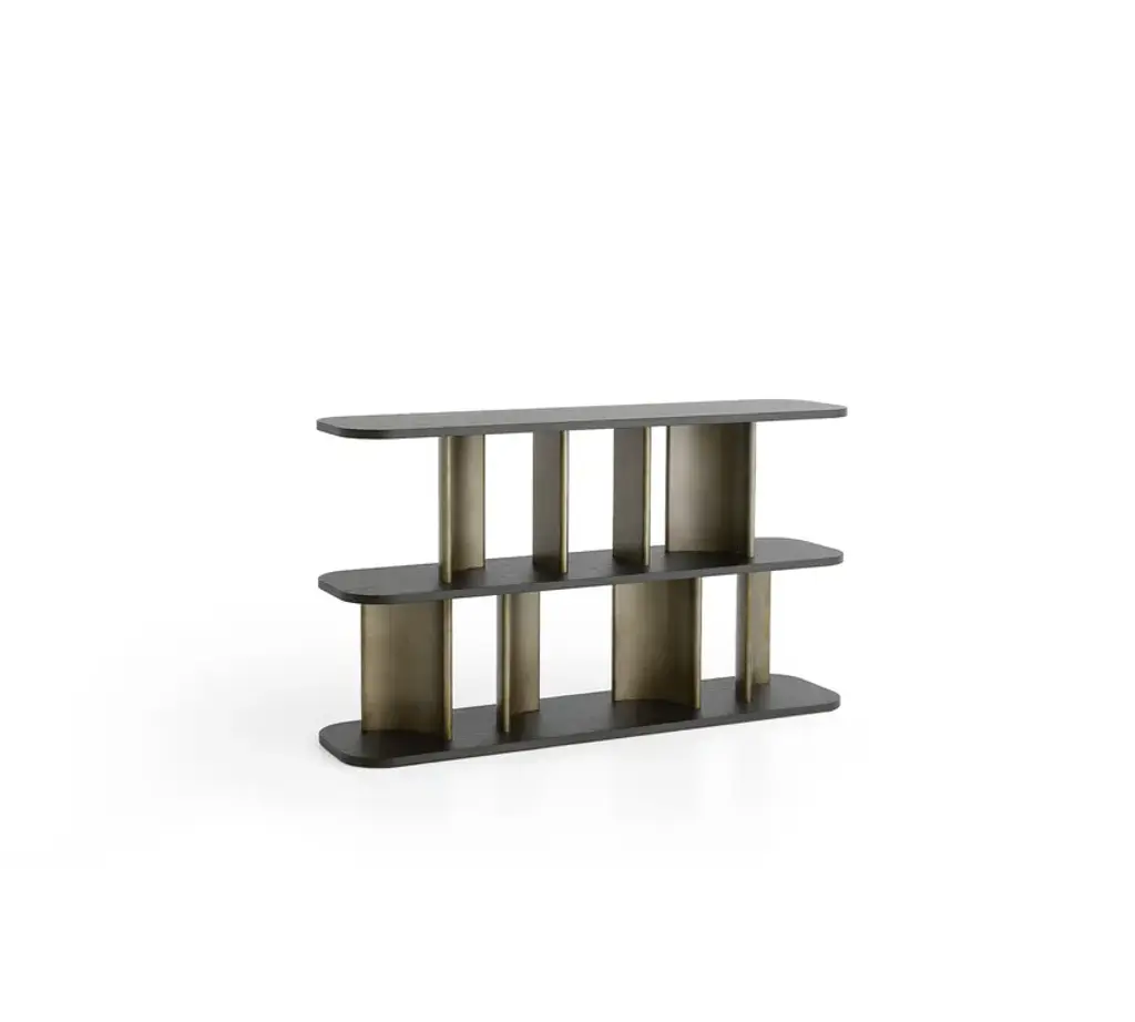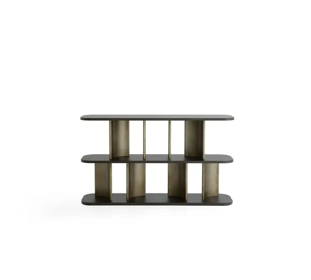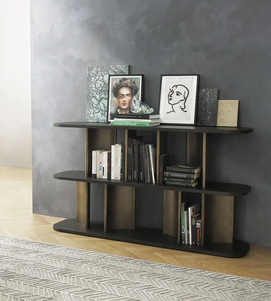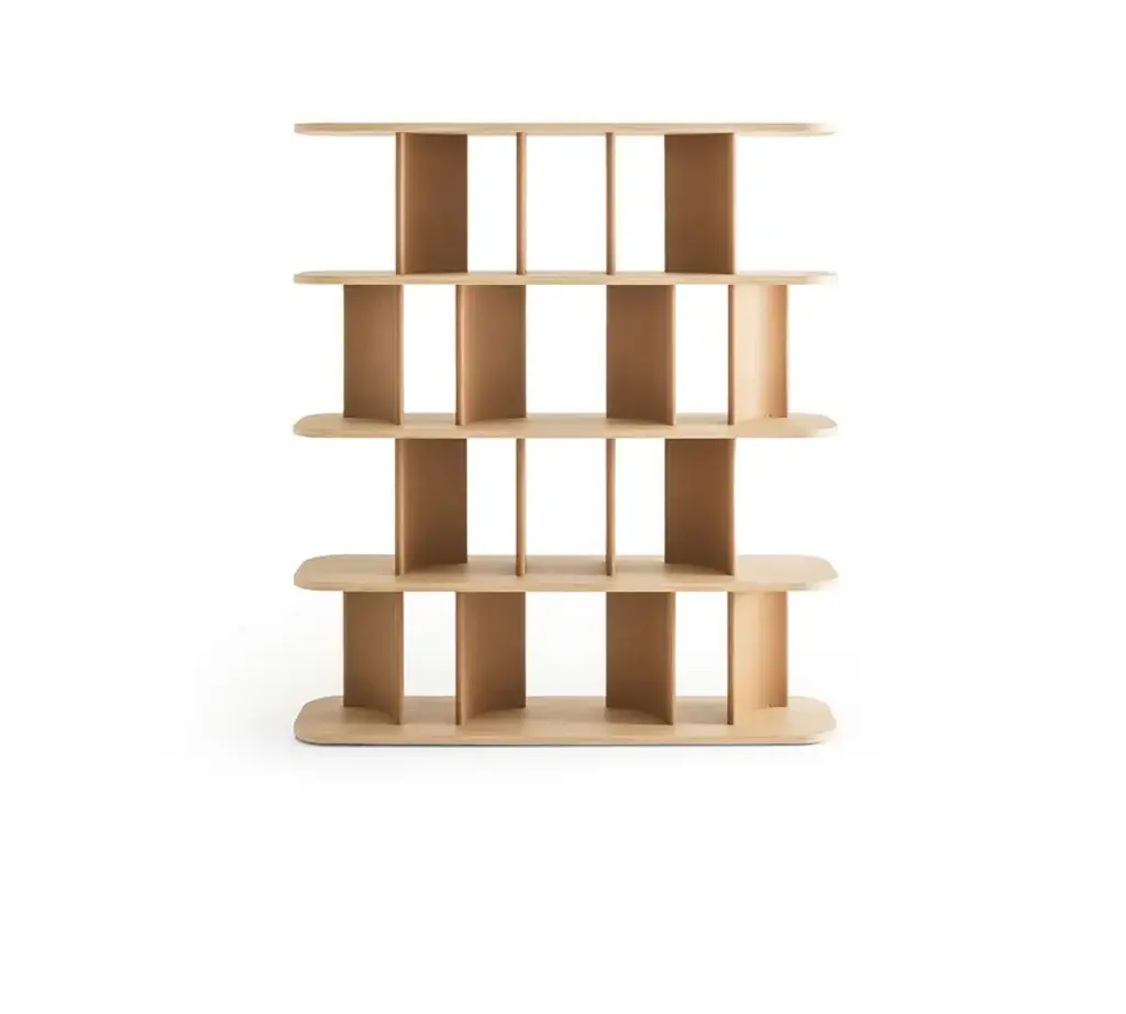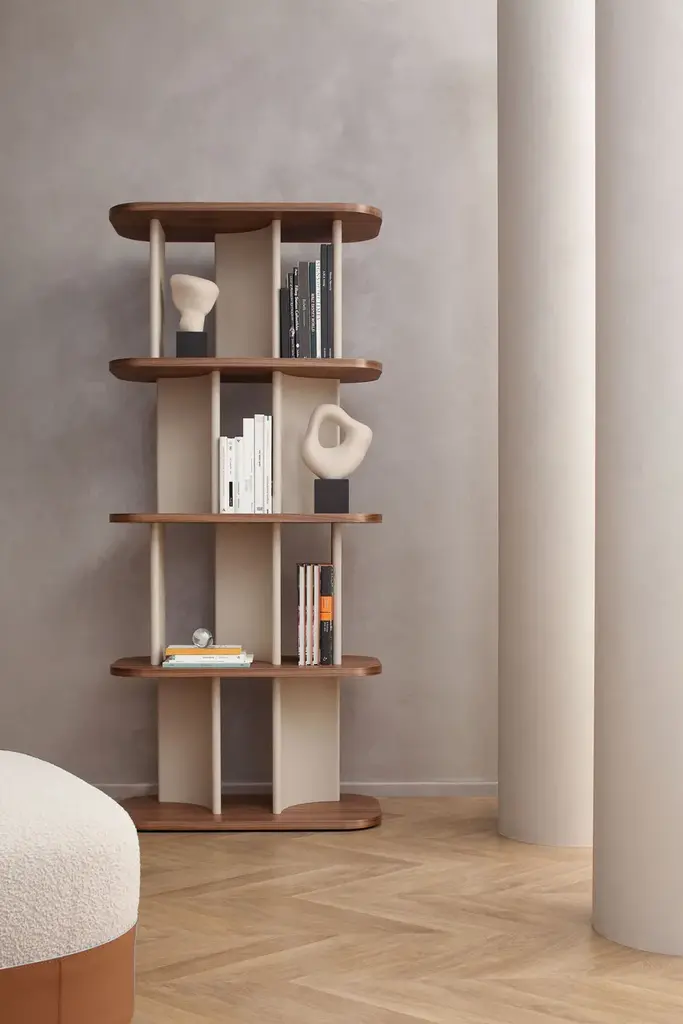 Parentesi is a double-sided bookcase with curved and rounded shapes: soft brackets in marmorino with concrete effect join the wood, giving life to a sculptural composition perfect for containing books and objects of all kinds.HM.PAR.DI.MT.RN: Double-sided bookcase with rounded shelves in real "Pure Wood" oak wood. Curved inserts in Marmorino lacquered wood in Terracotta colour water-based finish.HM.PAR.DM.MM.NC: Double-sided bookcase with rounded shelves in real Canaletto walnut wood veneer and natural oil finish. Curved inserts in Marmorino lacquered wood in Malva colour water-based finish.HM.PAR.DP.BO.RL: Double-sided bookcase with rounded shelves in real Laguna oak wood veneer and natural oil finish. Curved inserts in MDF with Oxidized Bronze water-based finish. The Enjoy Collection is Morica Design’s most sparkling, dynamic collection. The items are lively, inspired by nature, and find their soul in the pastel shades that blend and play with the wood in an original, fresh manner. The distinctive feature of Enjoy Collection is the use of color, declined in functional furnishings and contemporary mood. Modern and refined products made with high quality materials and handcrafted in Italy.