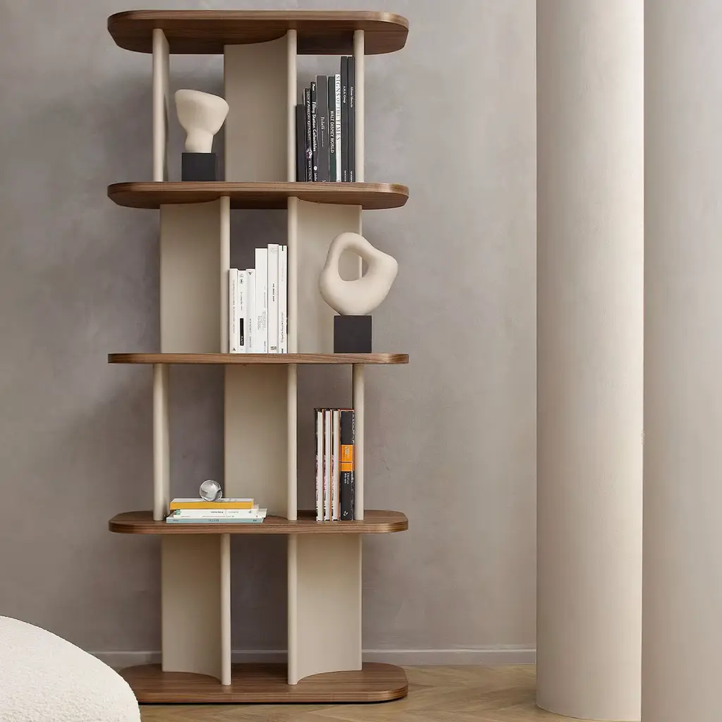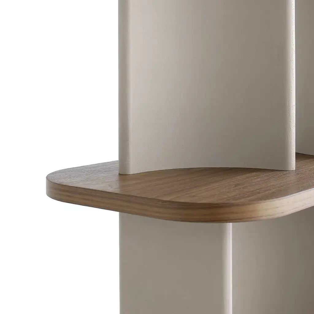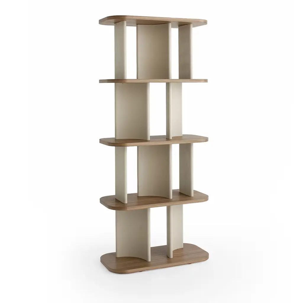 A double-sided bookcase of unmistakable modern flair, this piece effortlessly blends playfulness and elegance. Rounded-corner Canaletto walnut shelves, finished with a water-based treatment, are interspersed with curved wooden inserts lacquered in a marmorino-effect mauve, subtly evoking the shape of brackets, an inspiration behind its artful name. A low variant is available in the Artemest catalog.