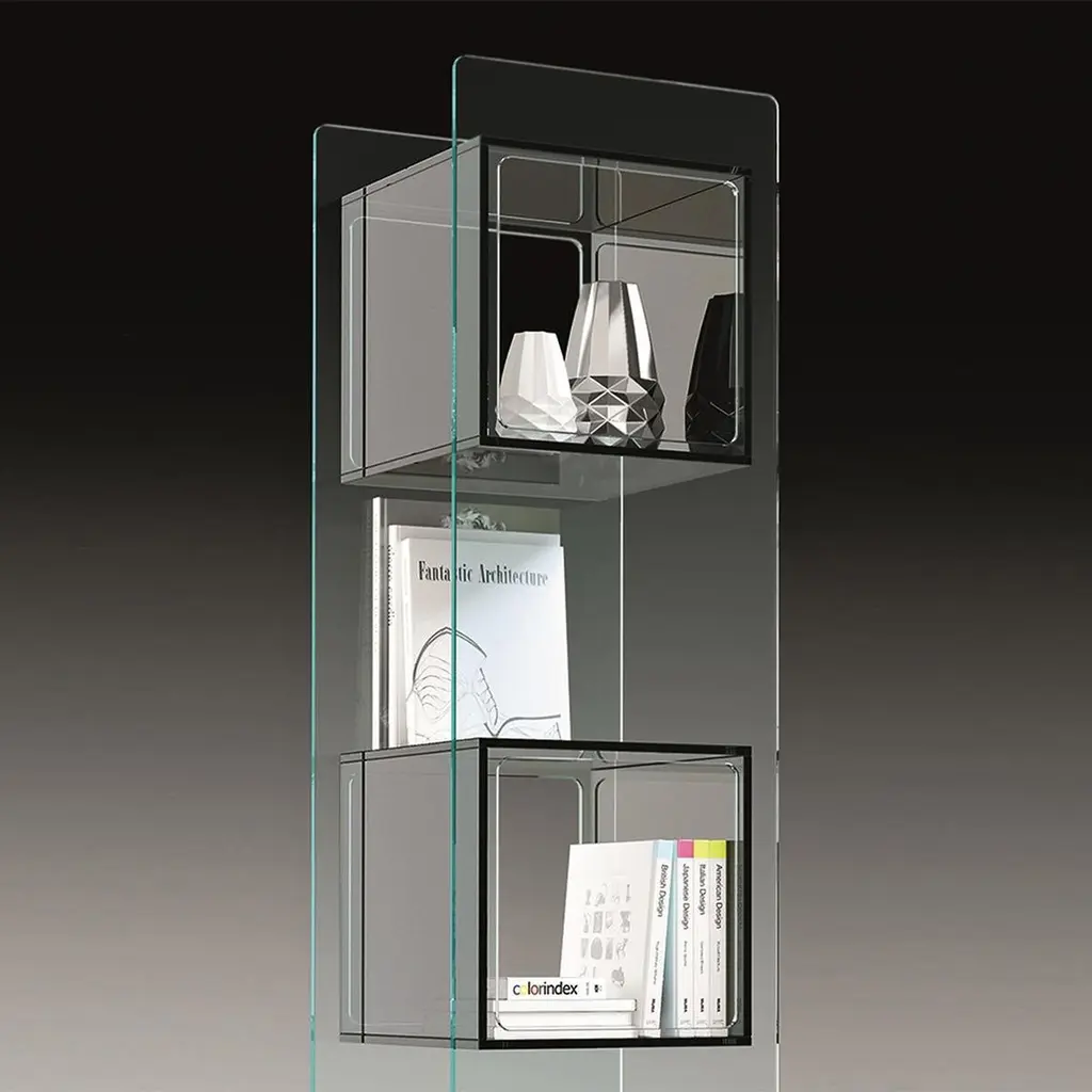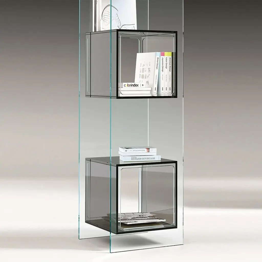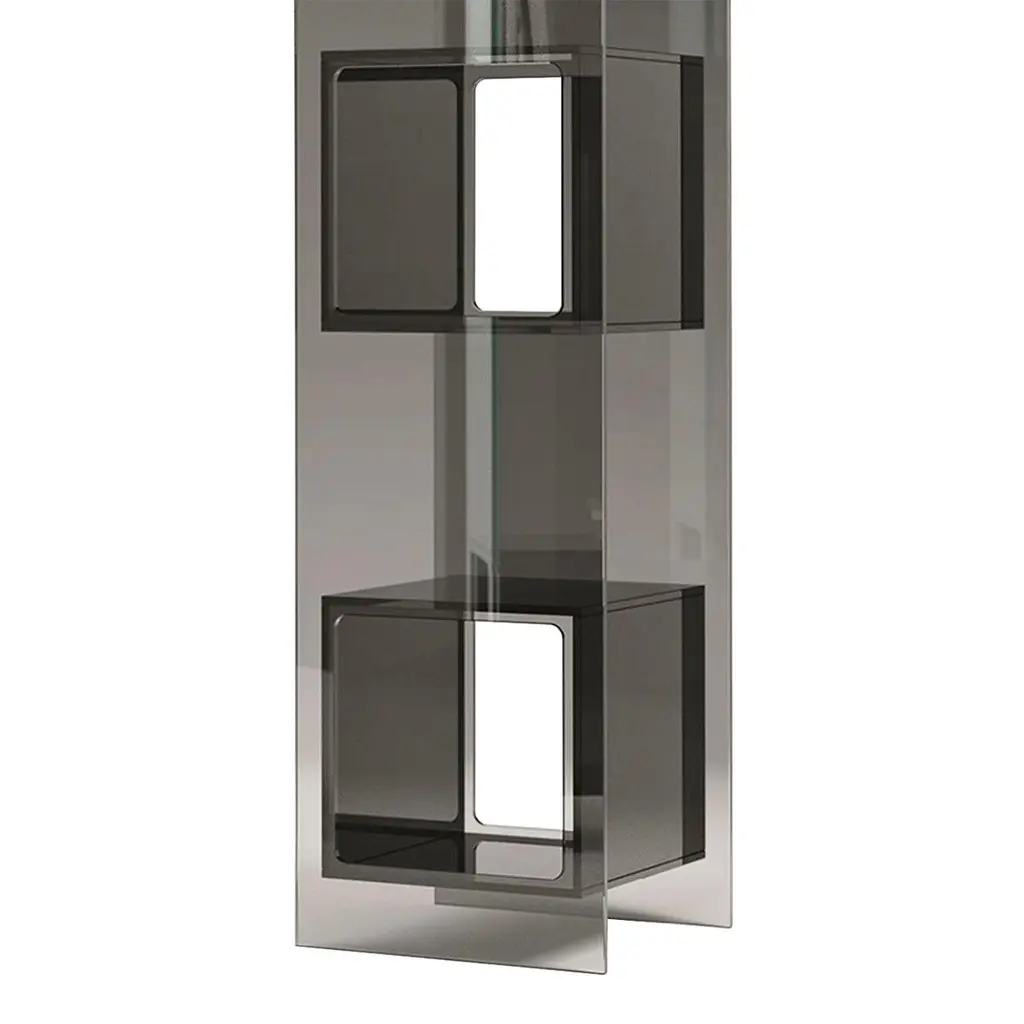 Bookcase Parts square glass with structure in welded smokedglass, 10mm thickness. With 3 cubes in welded blackened glass,10mm thickness.Also available with welded clear glass structure, 10mm thickness.With 3 cubes in welded smocked glass, 10mm thickness.