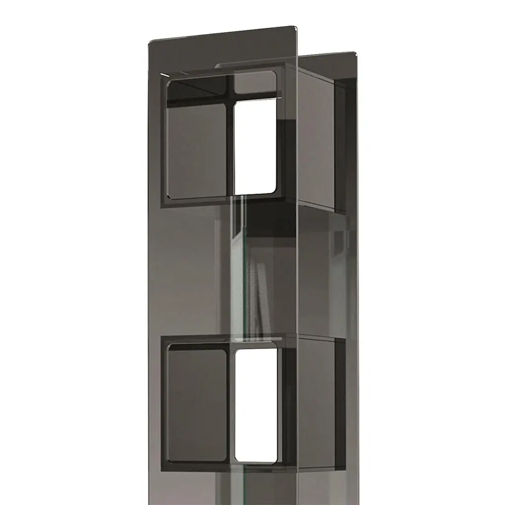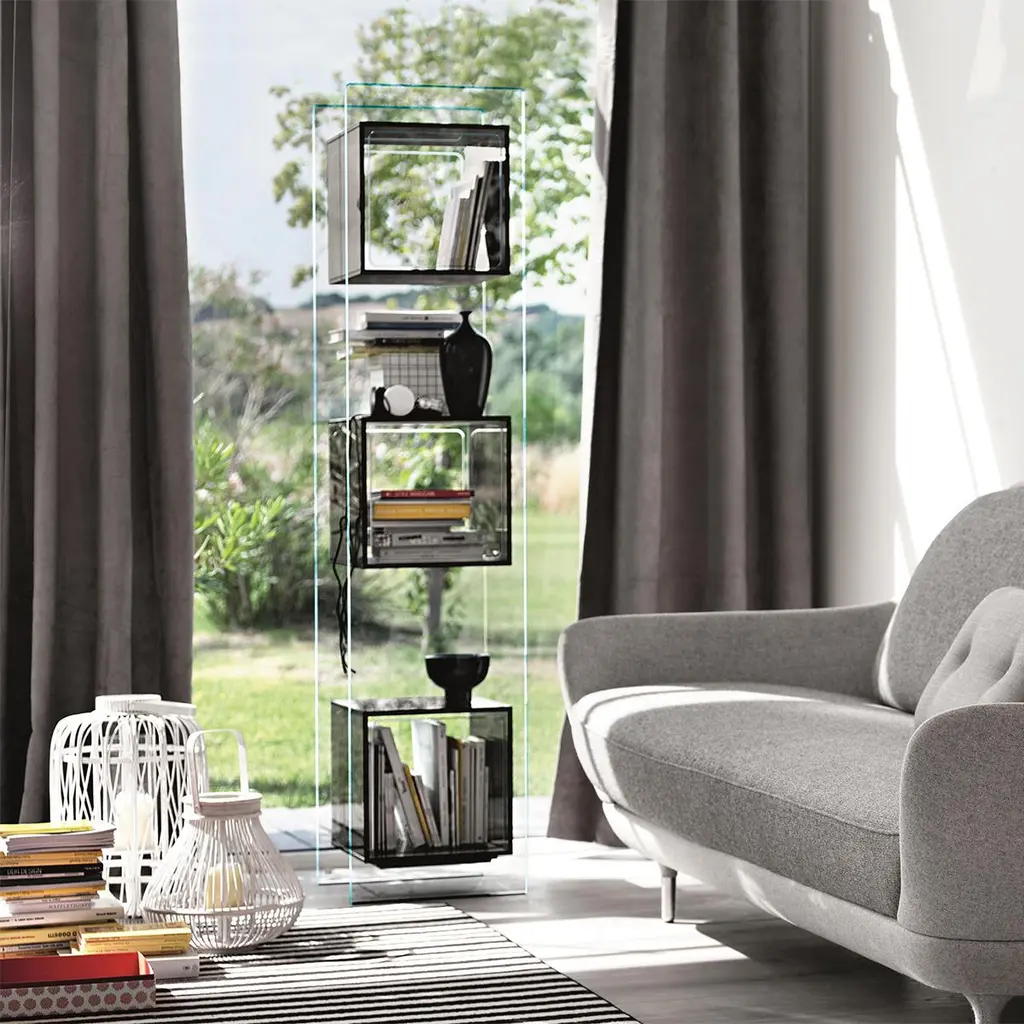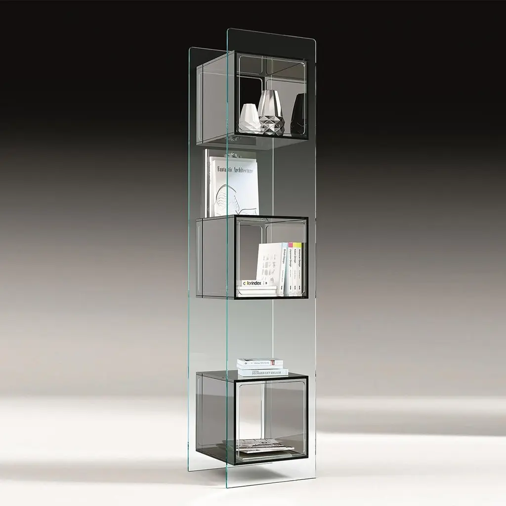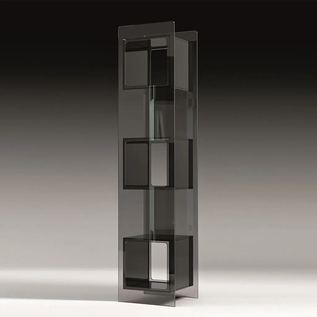 Bookcase Parts square glass with structure in welded smokedglass, 10mm thickness. With 3 cubes in welded blackened glass,10mm thickness.Also available with welded clear glass structure, 10mm thickness.With 3 cubes in welded smocked glass, 10mm thickness.