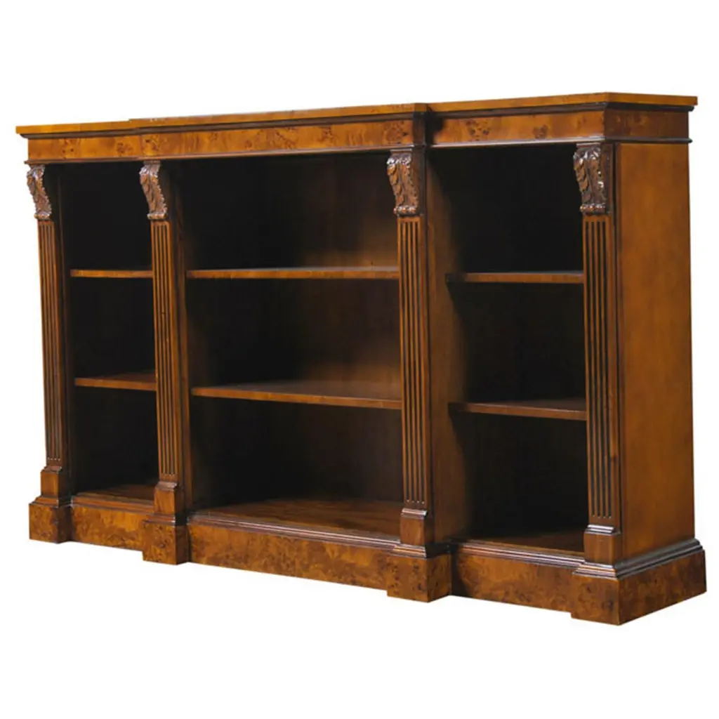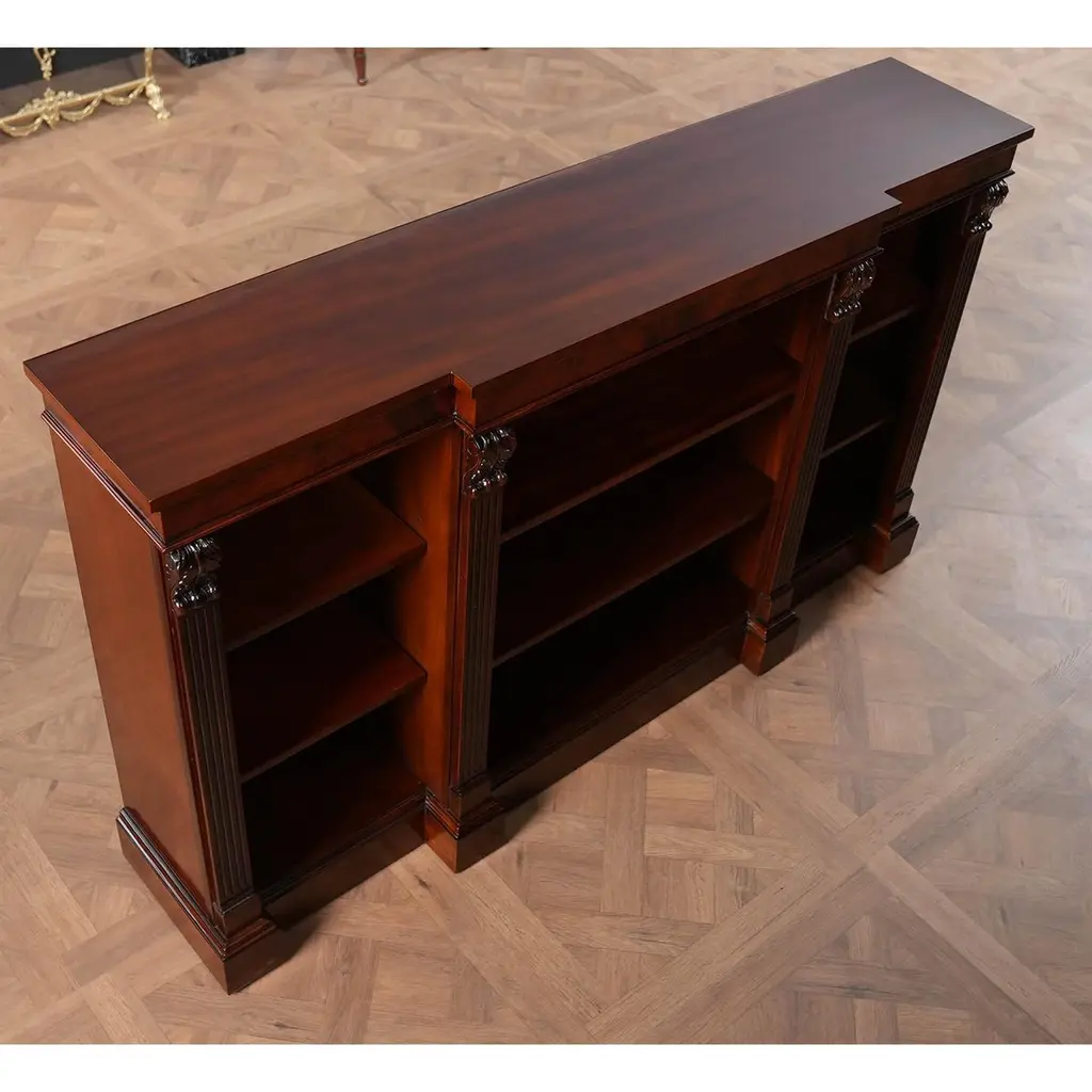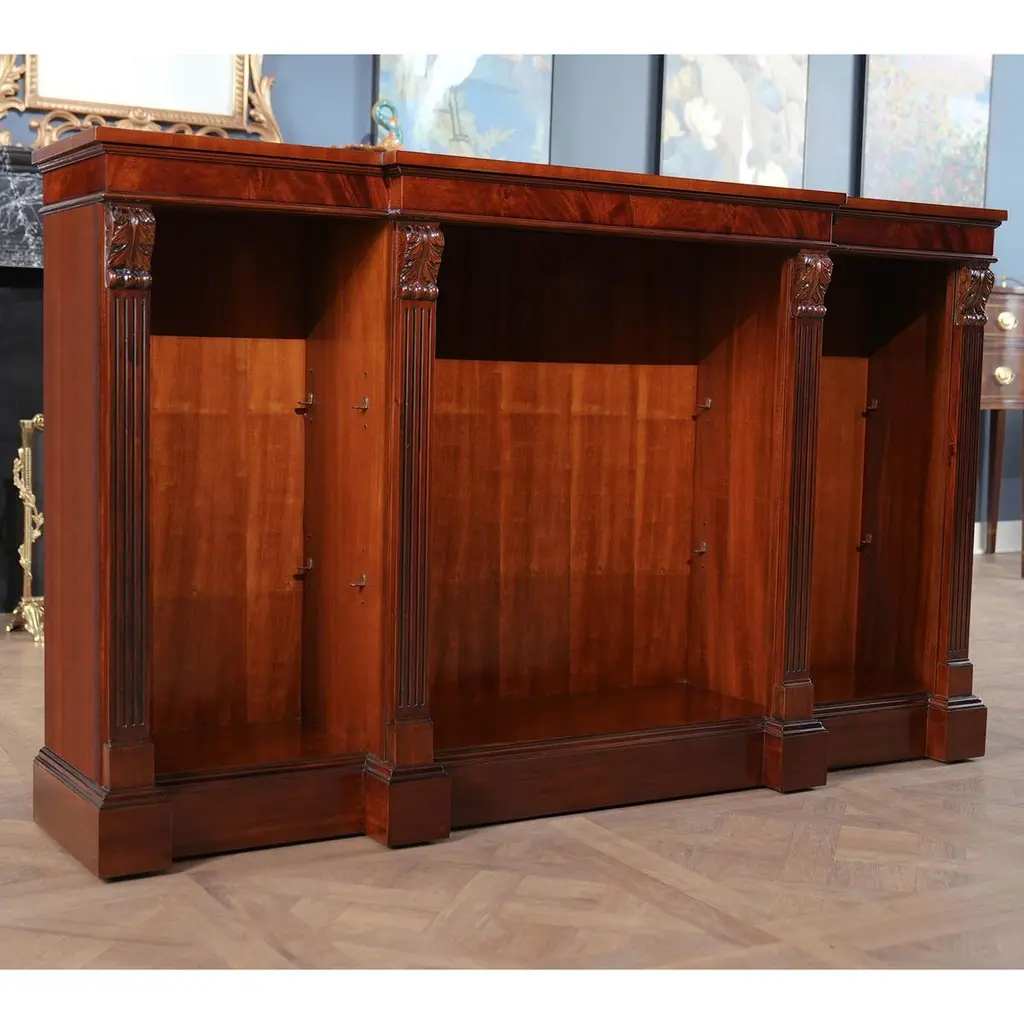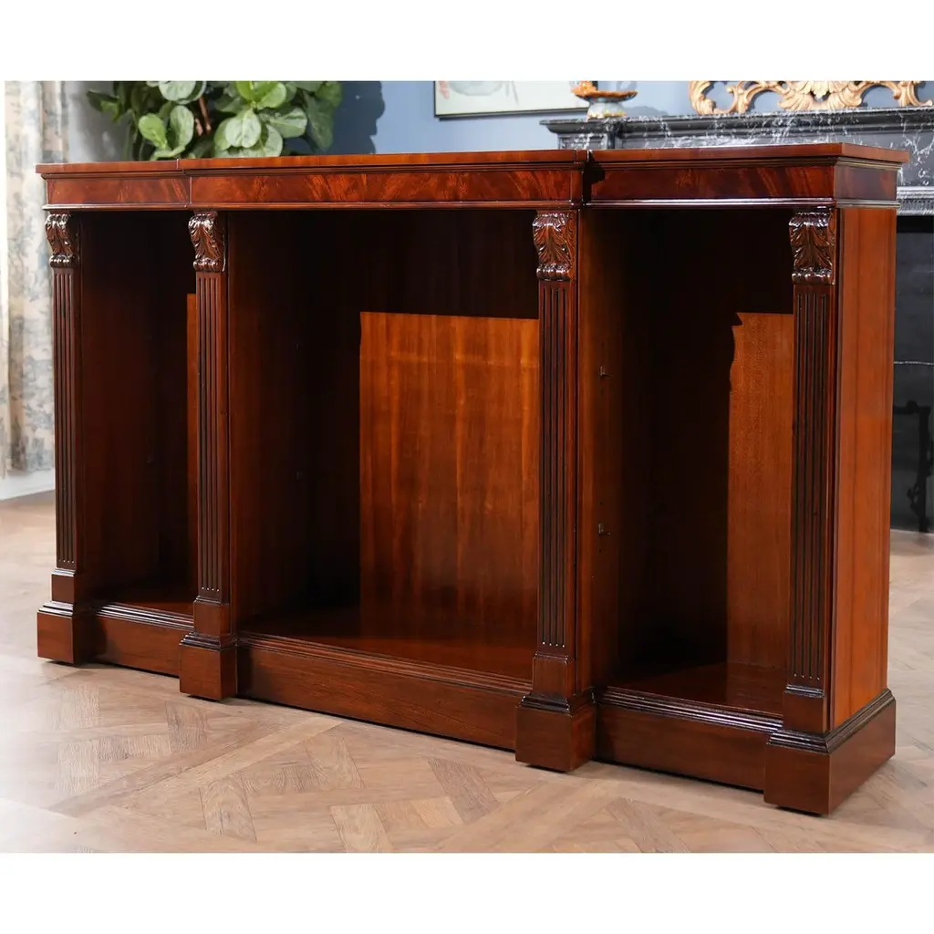 This very popular Penhurst Mahogany Bookcase from Niagara Furniture has a lot of great features. It’s overall breakfront shape separates it from other flat fronted bookcases, the figural mahogany detailed cornice is beautiful and adds a sense of depth to the upper area while hand carved acanthus style, solid mahogany brackets and reeded columns add to an overall refined appeal. Closely related to many of our other Niagara items this Penhurst Mahogany Bookcase can either be purchased alone or with enough accompanying items in to furnish an entire room. Please see our related products section below for other matching items.Measures 67″w x 15″d x 40″h metric 170 38 102Shelf spacing:Bottom to lower shelf 10.5 inchesLower shelf to middle shelf 9.75 inchesMiddle shelf to top lip is 8.5 inchesThe side shelves measure approximately 16.5 inches wide x 10 inches deep.The center shelves measure 28″ wide x 12 inches deep.