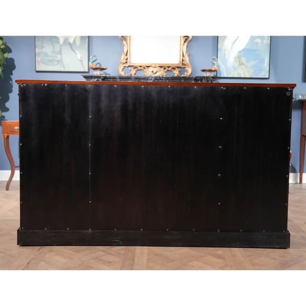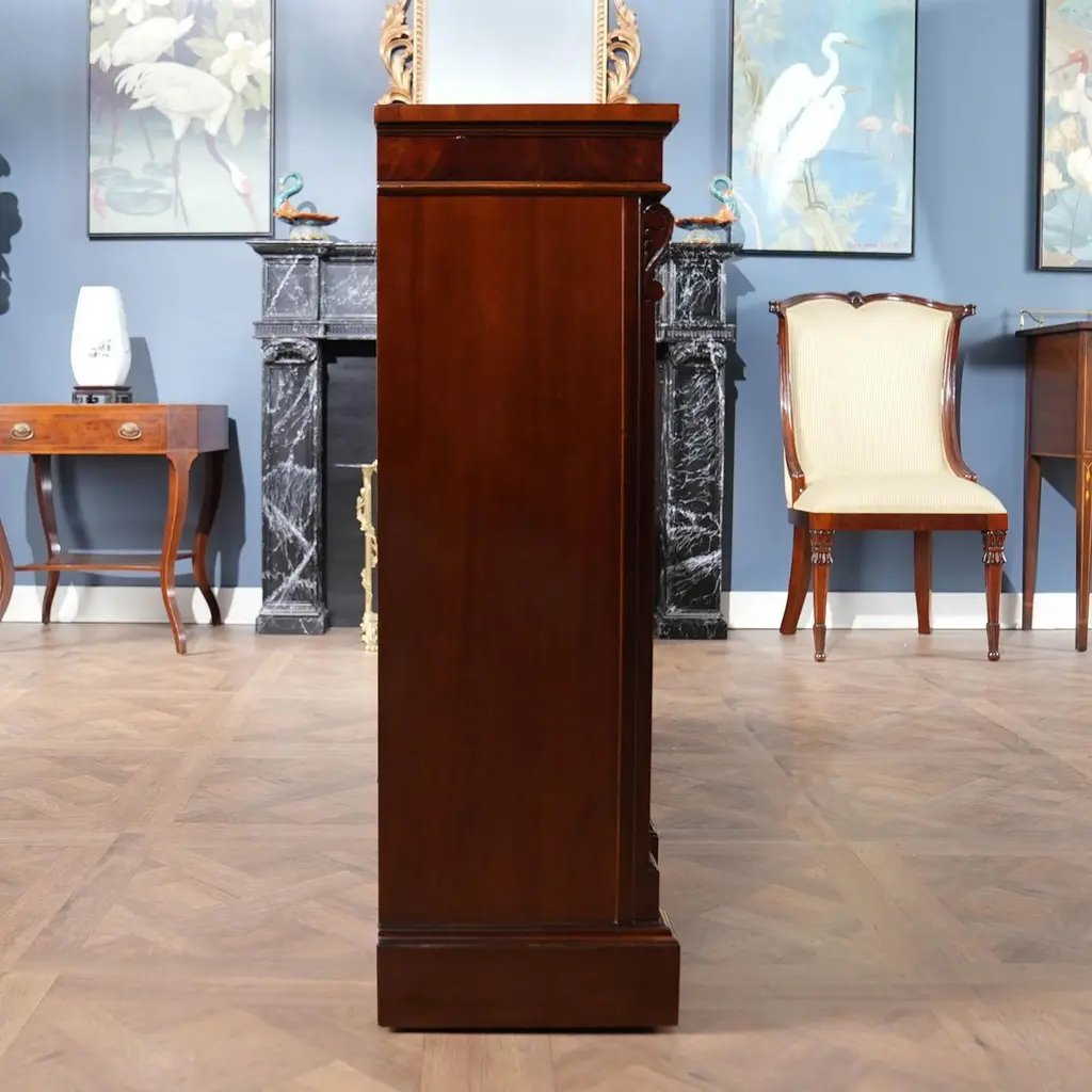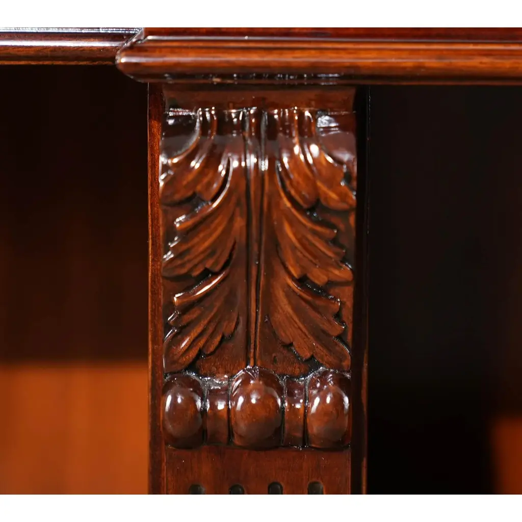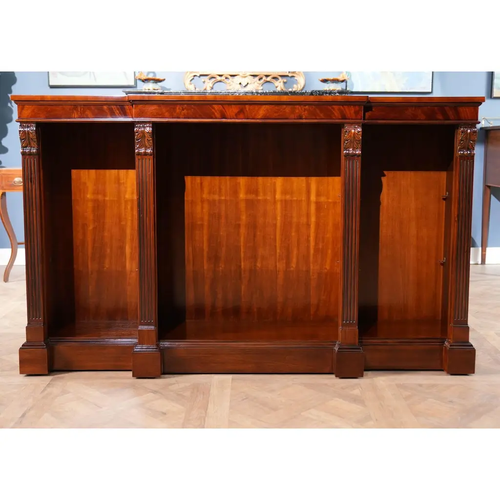 This very popular Penhurst Mahogany Bookcase from Niagara Furniture has a lot of great features. It’s overall breakfront shape separates it from other flat fronted bookcases, the figural mahogany detailed cornice is beautiful and adds a sense of depth to the upper area while hand carved acanthus style, solid mahogany brackets and reeded columns add to an overall refined appeal. Closely related to many of our other Niagara items this Penhurst Mahogany Bookcase can either be purchased alone or with enough accompanying items in to furnish an entire room. Please see our related products section below for other matching items.Measures 67″w x 15″d x 40″h metric 170 38 102Shelf spacing:Bottom to lower shelf 10.5 inchesLower shelf to middle shelf 9.75 inchesMiddle shelf to top lip is 8.5 inchesThe side shelves measure approximately 16.5 inches wide x 10 inches deep.The center shelves measure 28″ wide x 12 inches deep.