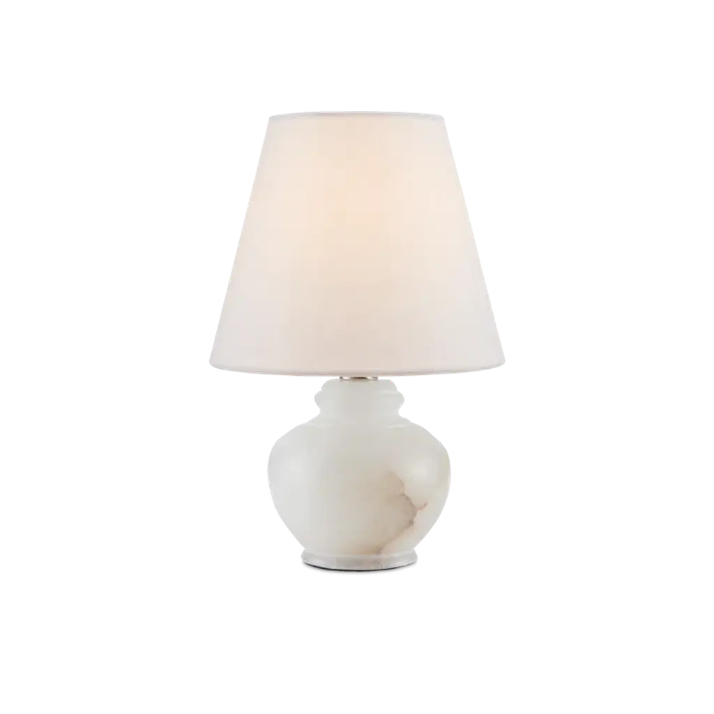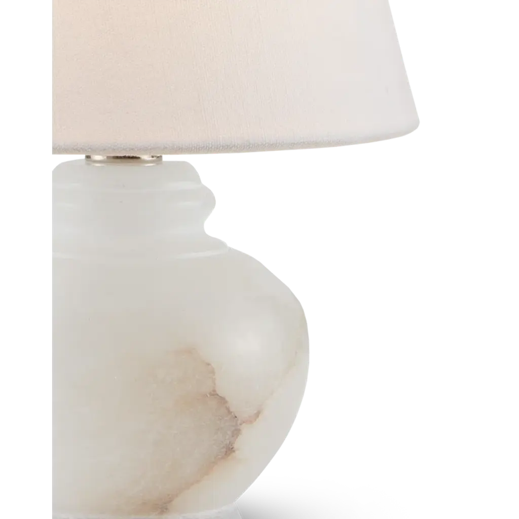The Piccolo Mini Table Lamp is a very petite lamp made of marble that was modeled after a vintage design owned by a member of the Currey & Company product development team. At 4.5 inches high to the shade, the tiny little lamp is perfect for sliding into a bookcase. But it is so beautifully luminous when lit that it will hold its own in decorative arrangements. The lovely little lamp is fitted with an off-white linen shade.