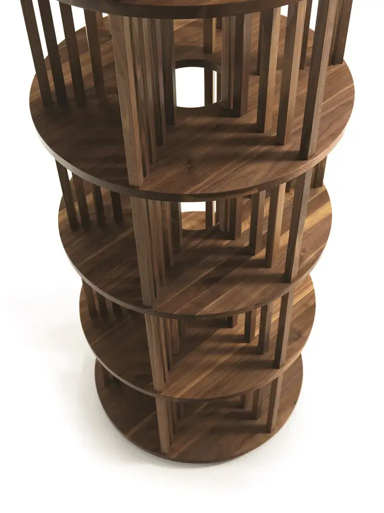 Pillar is a bookshelf completely in solid wood. Linear column design with 5 difference levels made of pinned vertical slats that slot in the circular shelves. The base has a rotating plate to enable 360° use.STANDARD VERSION: PILLAR 2 AND PILLAR 3 WITH WOODEN TRAYAVAILABLE FINISHES:A1: walnut without knotsA2: oak without knots, cherry
