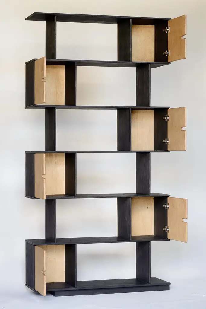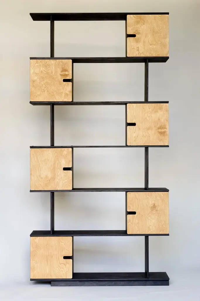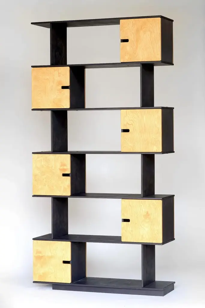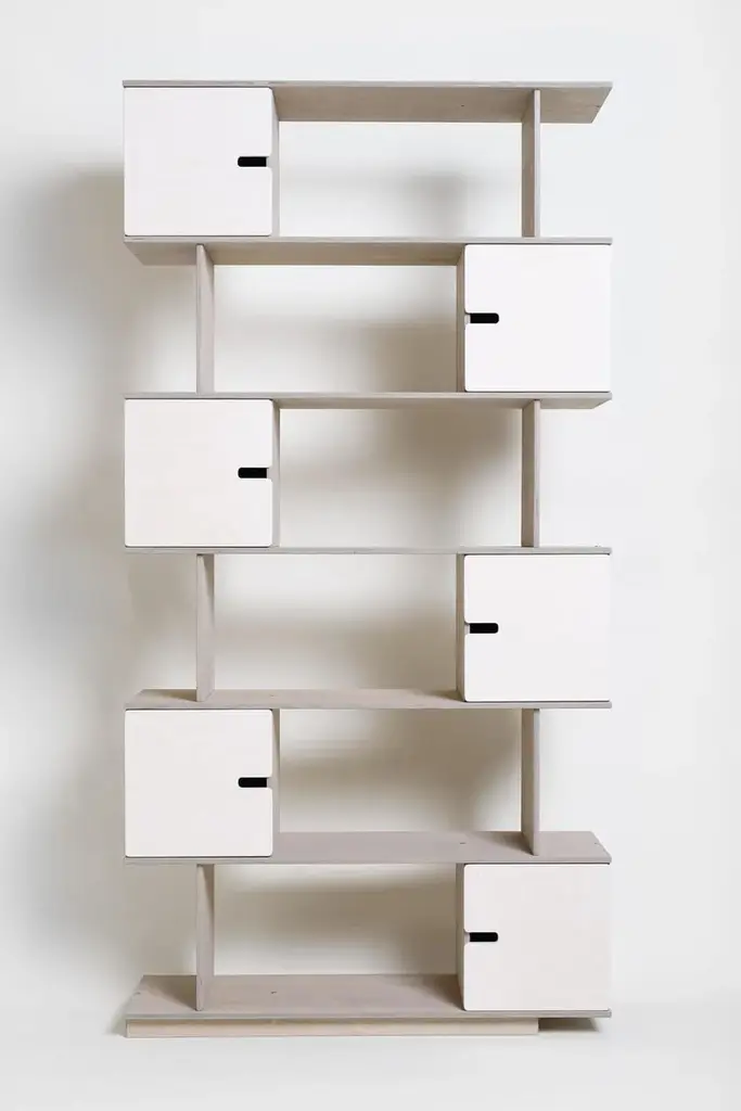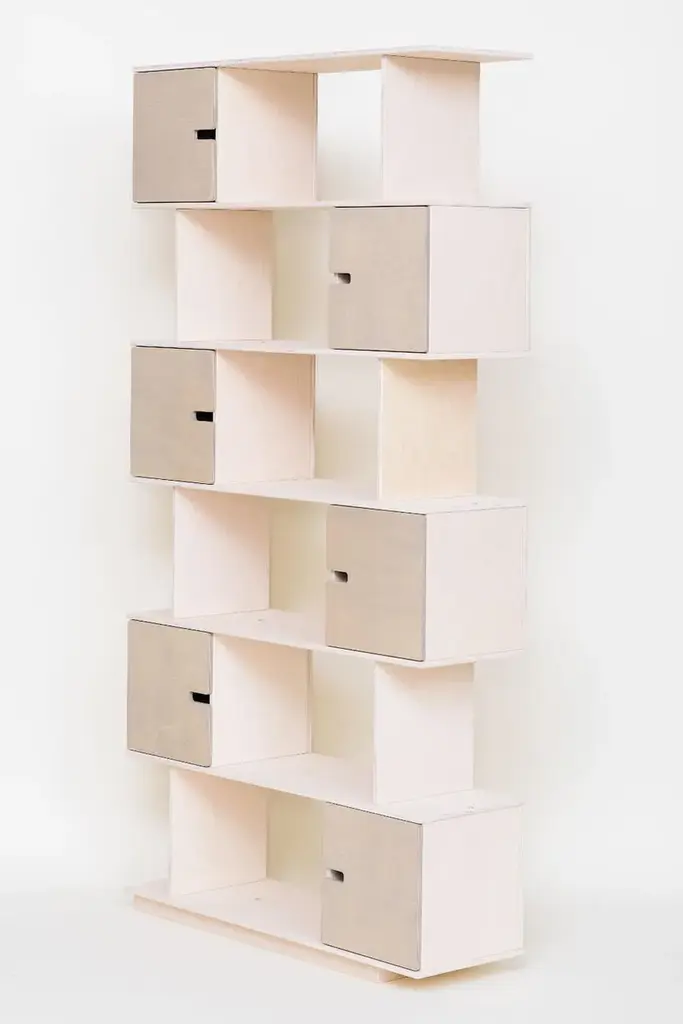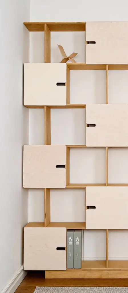 Shelf in custom size. You choose the number of rows, cabinets and select colours according to emotion desired.There is cabinet between each shelf and by deciding the location of the divider you choose the opening direction.The shelf inner height is 33 cm allowing easy accommodation of larger books and binders. The inner width of cabinets is 31,5 cm. The shelf depth is 24 or 36 cm.Made of birch plywood or oak veneered, oilwaxed. Soft close door hinges.Flat-packed, easy assembly.You decide what to hide, what to show. It is a game of pixels where combinations are suited to the study and the child’s room. How many pixels and in what colour do you need? Challenge us!