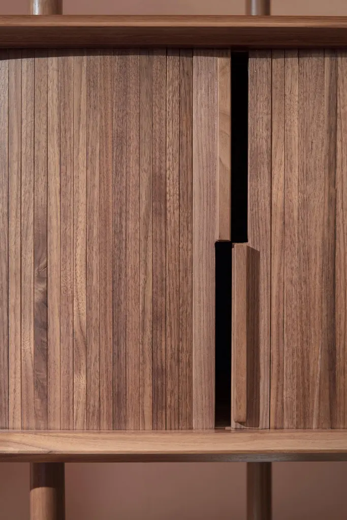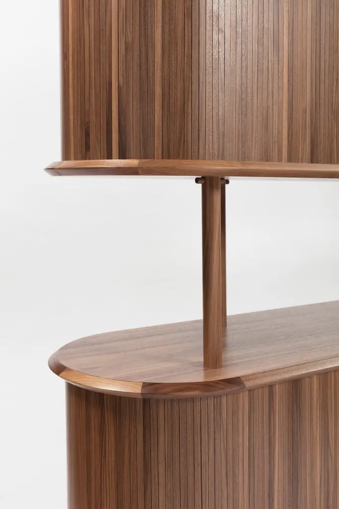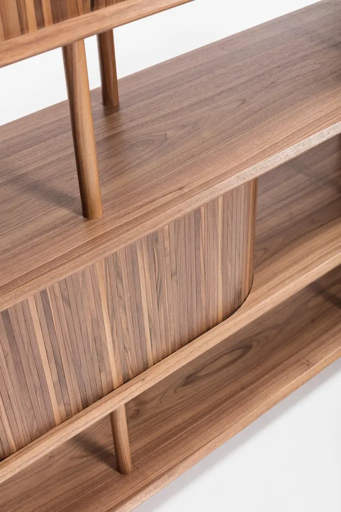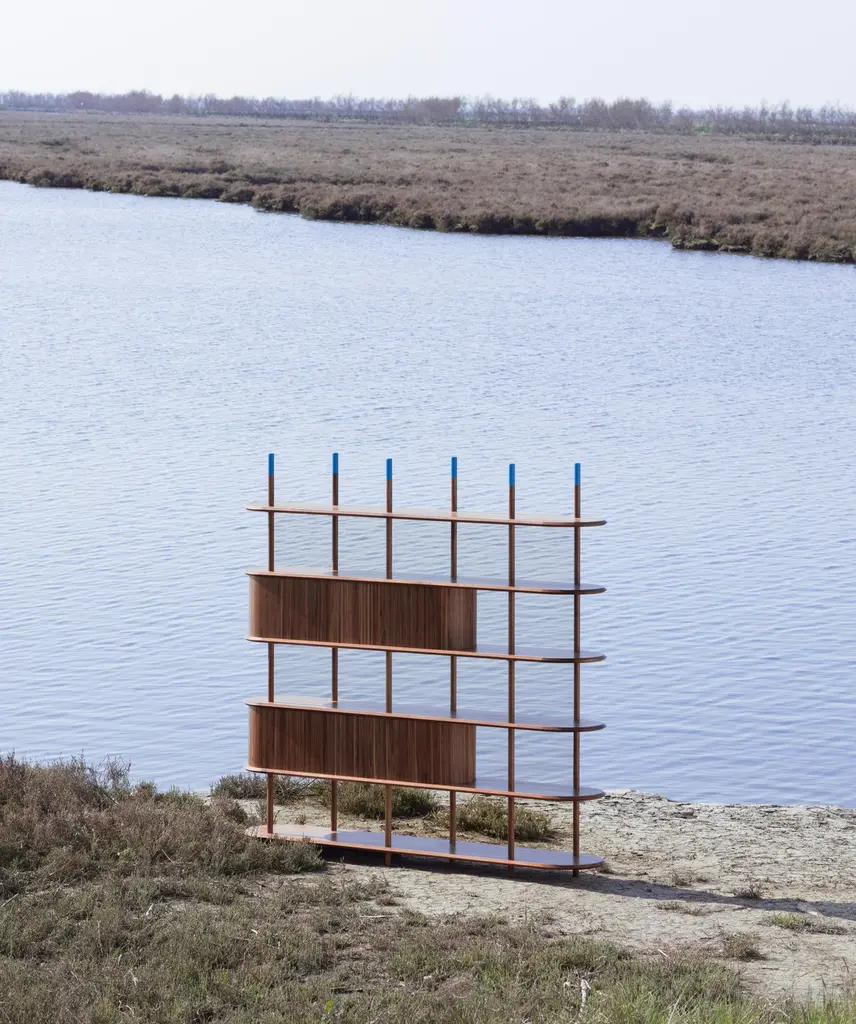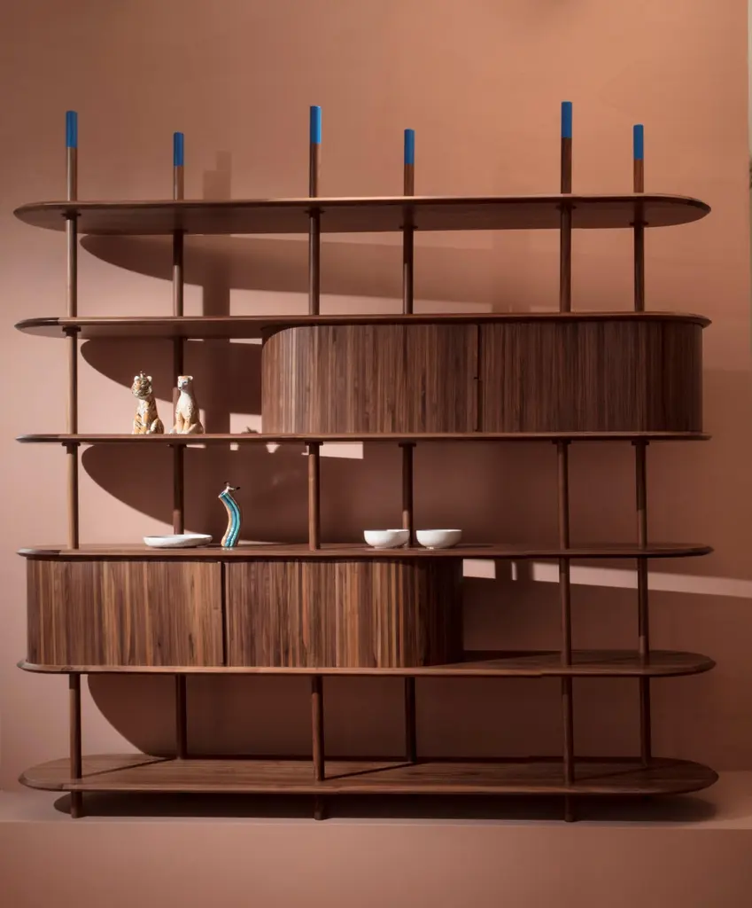 Bookcase made of a series of solid wood poles with circular section, veneered shelves with solid wood edging, all made of Canaletto walnut finished with transparent paint. The head of the poles is coated with a blue protective paint.The system is completed by two storage compartments that feature sliding doors with integrated handle.The library is shipped semi assembled.Libreria costituita da pali continui a sezione circolare in legno massello. Ripiani impiallacciati con bordatura in massello. Il tutto realizzato in noce canaletto finito con vernice trasparente. La testa dei pali è finita con una vernice protettiva di colore blu. Completano il sistema due vani contenitori, caratterizzati da ante scorrevoli a serrandina con maniglia integrata.La libreria viene spedita semi montata.