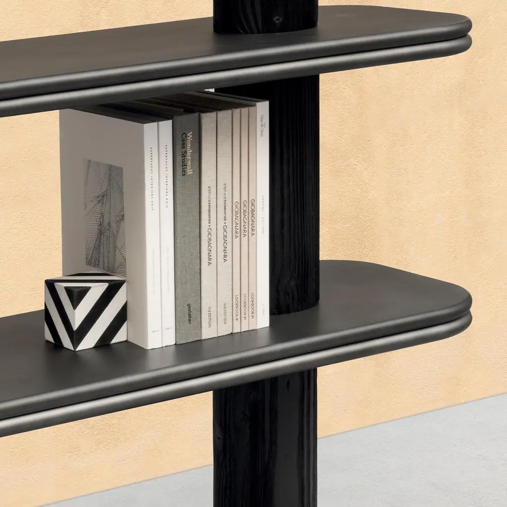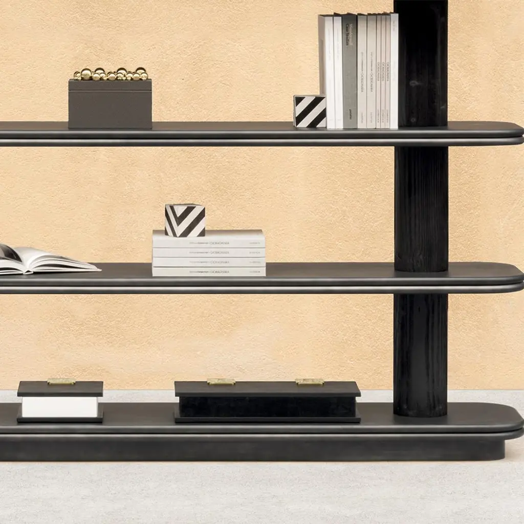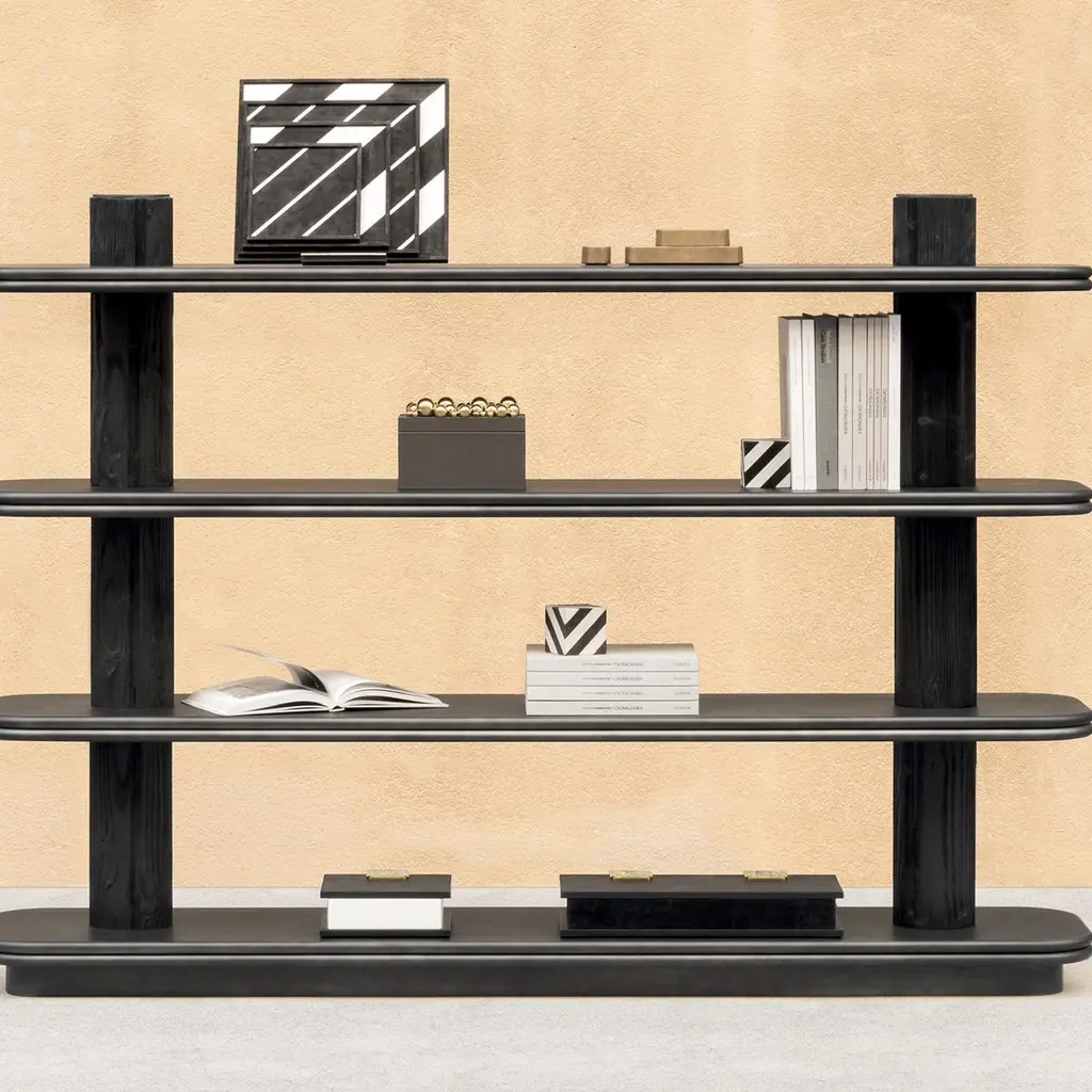Bookcase Positano black with 2 poles structure in solid wood in dark lacquered finish and solidwooden shelves and base covered with dark bronzed genuine leather.Also available with other leather colors on request.