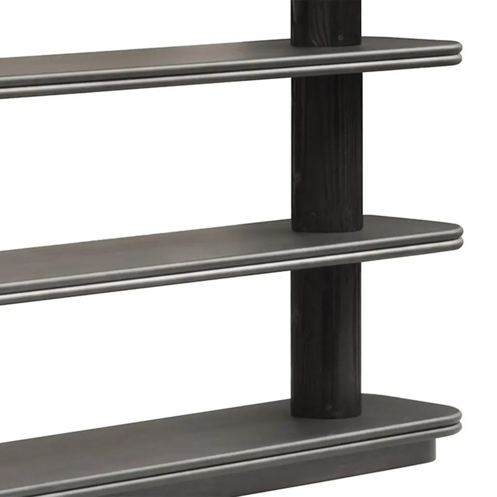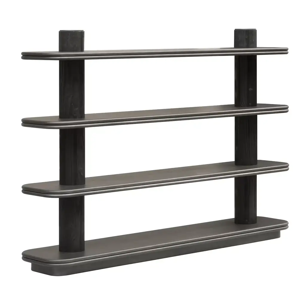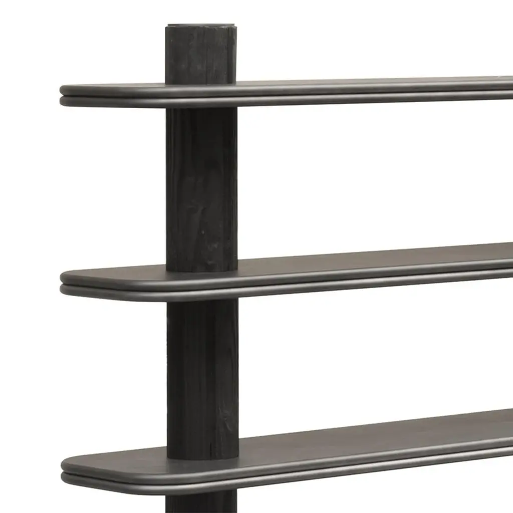 Bookcase Positano black with 2 poles structure in solid wood in dark lacquered finish and solidwooden shelves and base covered with dark bronzed genuine leather.Also available with other leather colors on request.