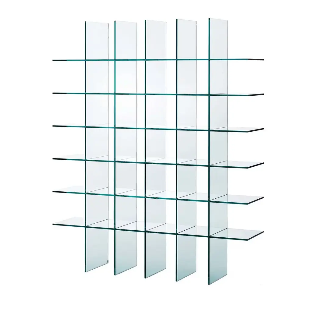 Bookshelf made of six 15mm thick shelves and closed sides, to be used against a wall or also freestanding. Meant for living area or work spaces. The bookcase Quiller is made of extra clear bevelled glass and is composed of six shelves closed on the sides. It was designed by designer Uto Balmoral and is perfect to be placed against the wall or free standing in living areas or work spaces. This bookcase is synonymous with lightness and linearity, thanks to the straight shapes and the transparency of the glass, that creates light effects that give brightness to the environment and thus the illusions of greater breadth. It is meant for modern environments and is an excellent match for minimalistic furniture complements.
