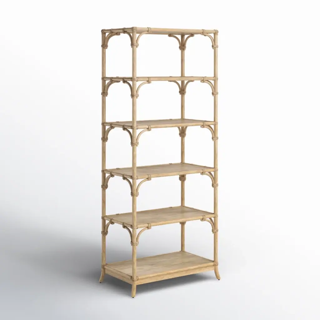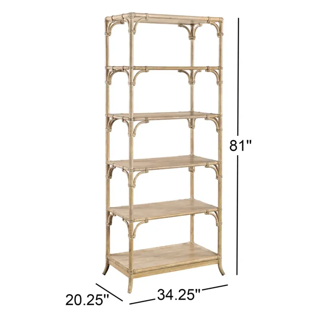 With a tropical Isla-inspired vibe and laid-back style, the Isla Pole rattan bookcase is crafted of oak veneers featuring a bamboo motif and rope accents for an organic appeal. Finished on all sides with five fixed shelves, the bookcase is finished in a sand-colored dune, transparent by design to showcase the unique grain patterns of the wood veneer.