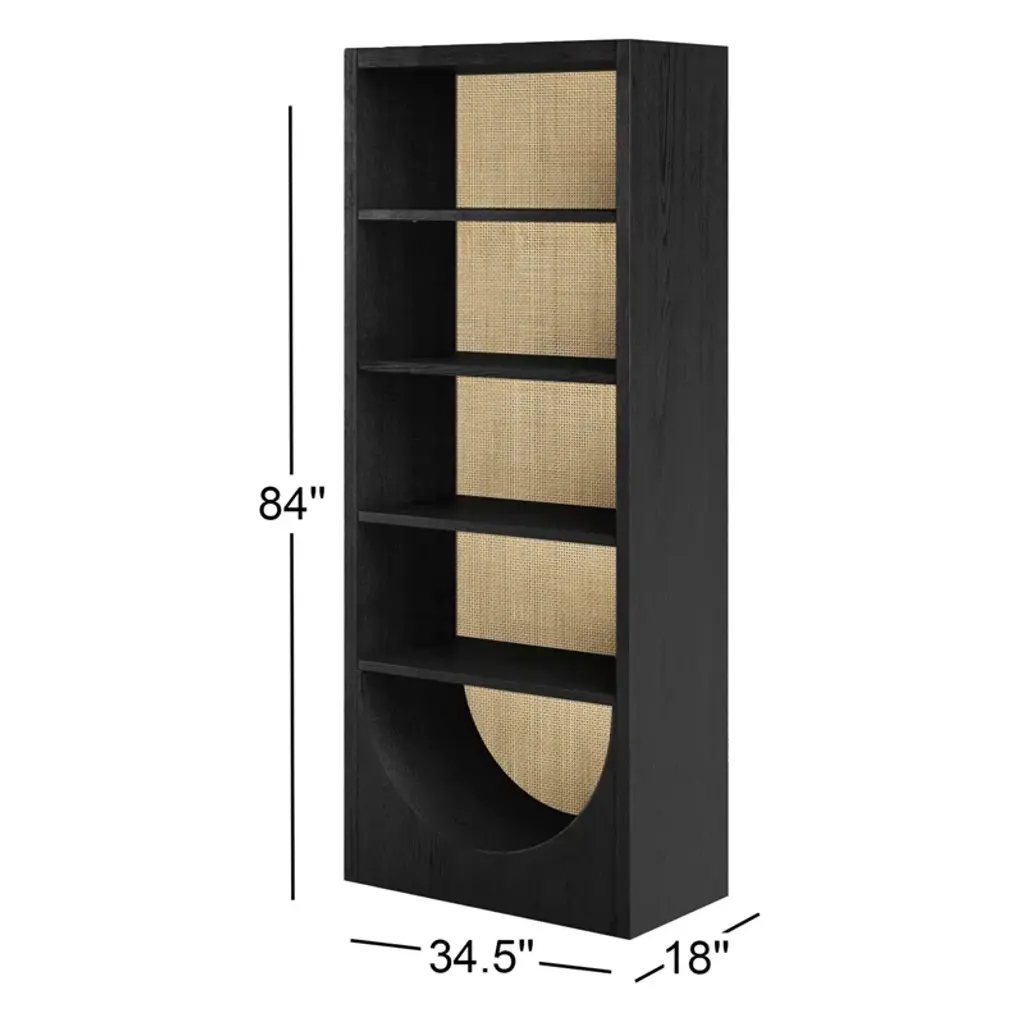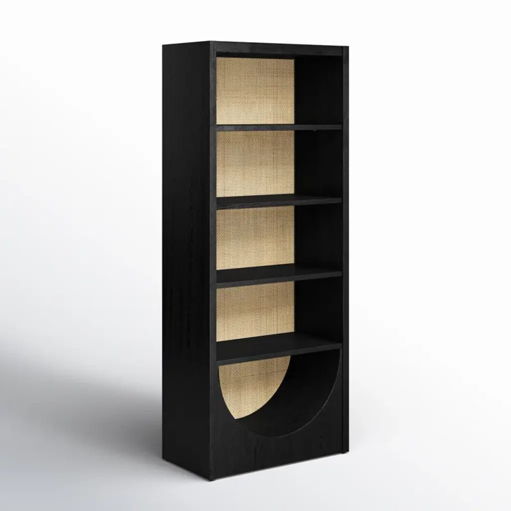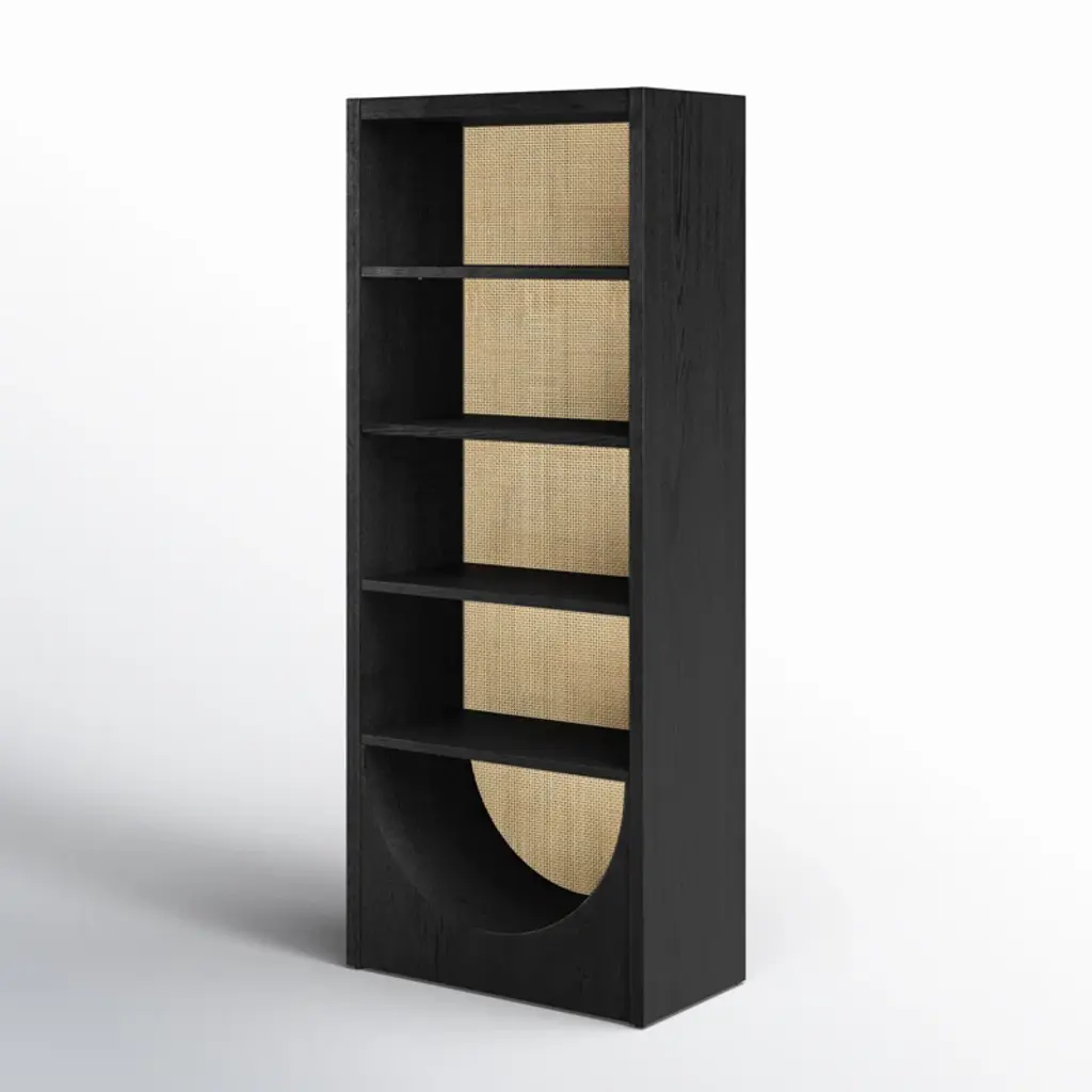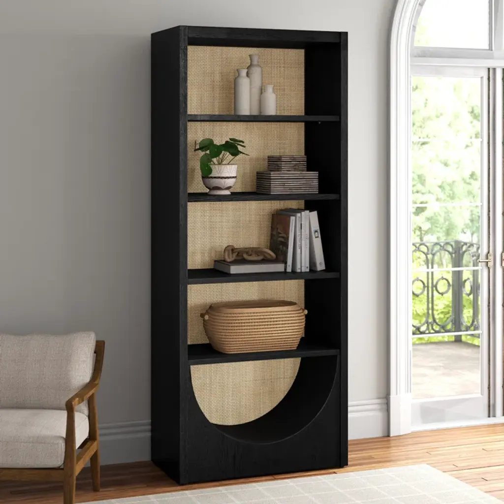 This eye-catching, 4-tiered bookcase provides storage and an elegant, coastal look. It's crafted from wood with a rattan-like background and a U-shaped cutout in the base for a modern aesthetic. The shelf material is warmly accented by the rich finish, bringing a dash of sophisticated charm to any room it graces. Plus, with adjustable features, this bookcase accommodates items of all sizes. Time to turn that room into a haven of organization, so start loading it up with your beloved novels and knick-knacks.