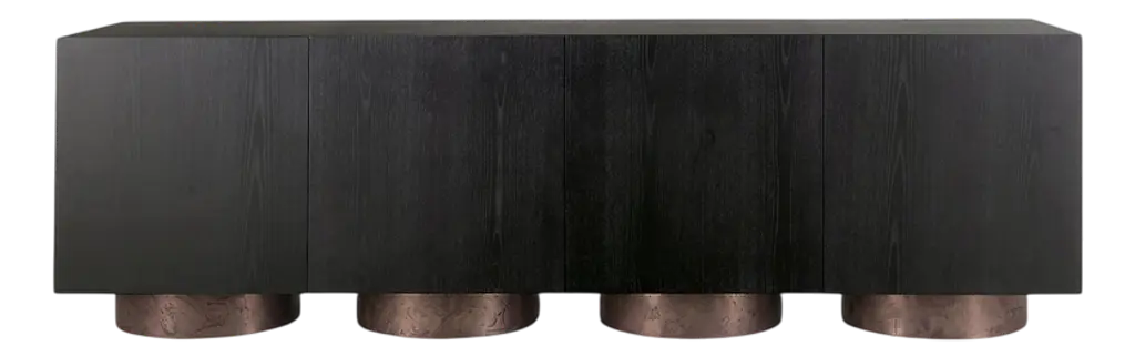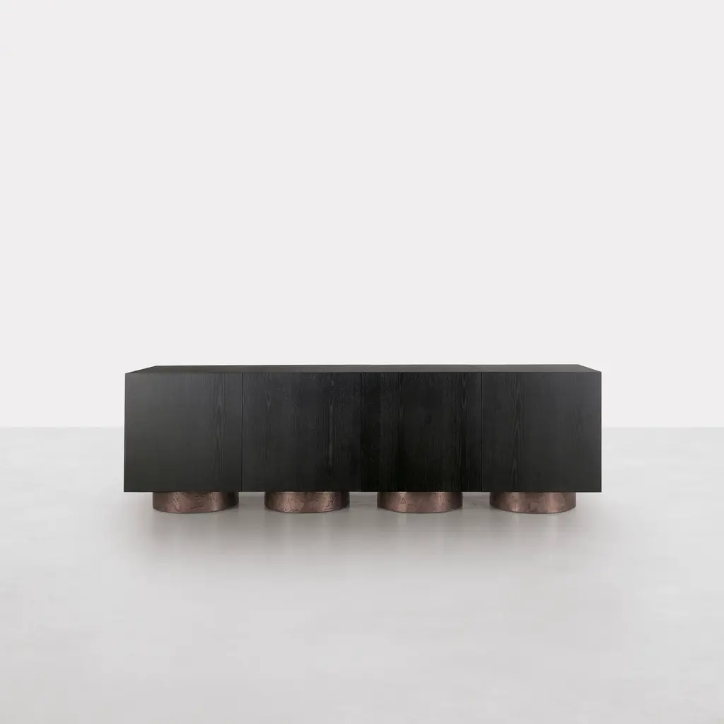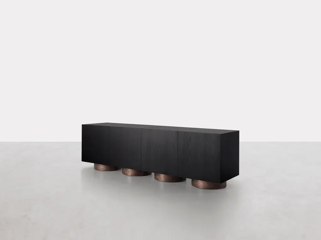 Rubik Container by SomaschiniDimensions: W 200 x D 50 x H 60 cmMaterials: Plywood structure and door with workmanship at 45 degrees. Doors with push-pull system opening. Internal compartment with bronze glass shelf. The element is modular as sideboard or bookcase.Sideboard in N.100 Black Ash veneer matt finish, base in N.131 Bronze-burnished copper pure metal finishAbout: Somaschini is a new-born brand, with a strong, innovative attitude, and rich artisan heritage in 1940s Brianza — a hard-working region of Lombardy, internationally renowned for the production of high quality design. It thrives, however, on new ideas and contemporaneity and never lapses into nostalgia but rather masters its own high craft. It shows a certain obstinacy in pursuing techniques honed over decades, preferring to make them speak through new languages. Hence it challenges tradition with a bold, intelligent, and confident approach.