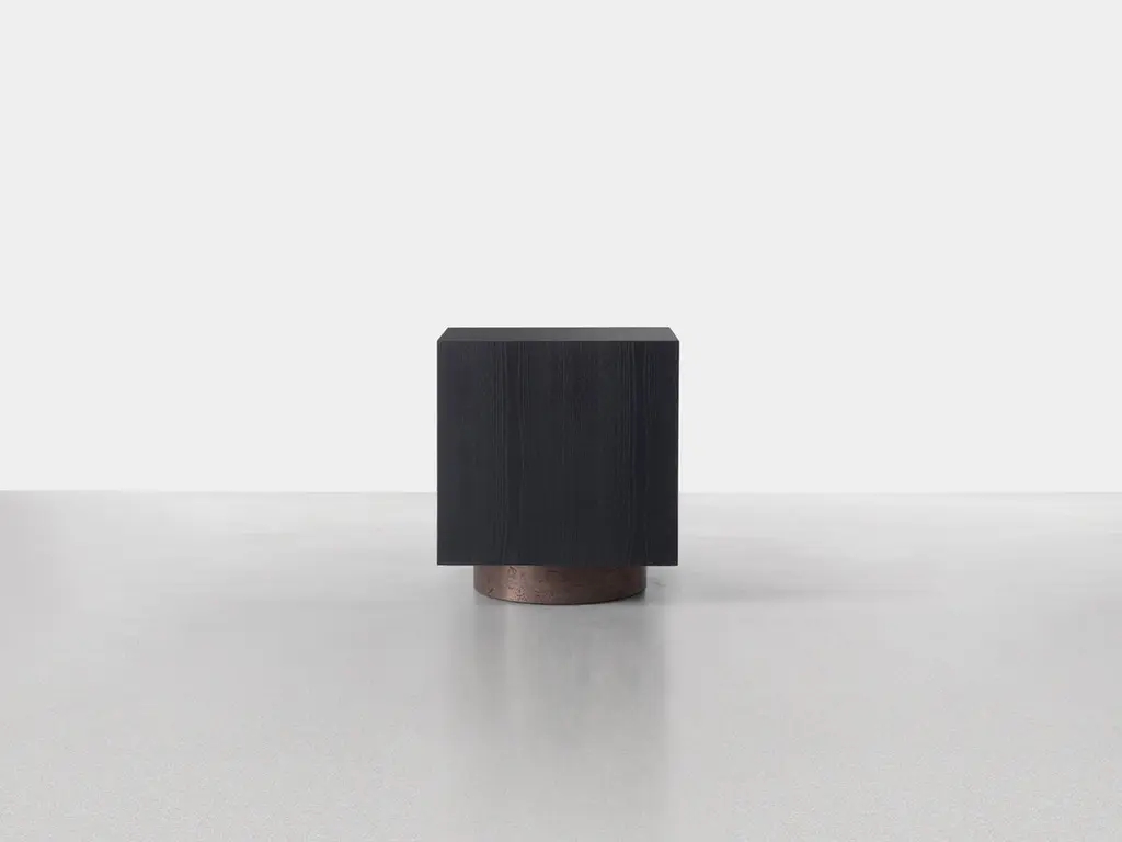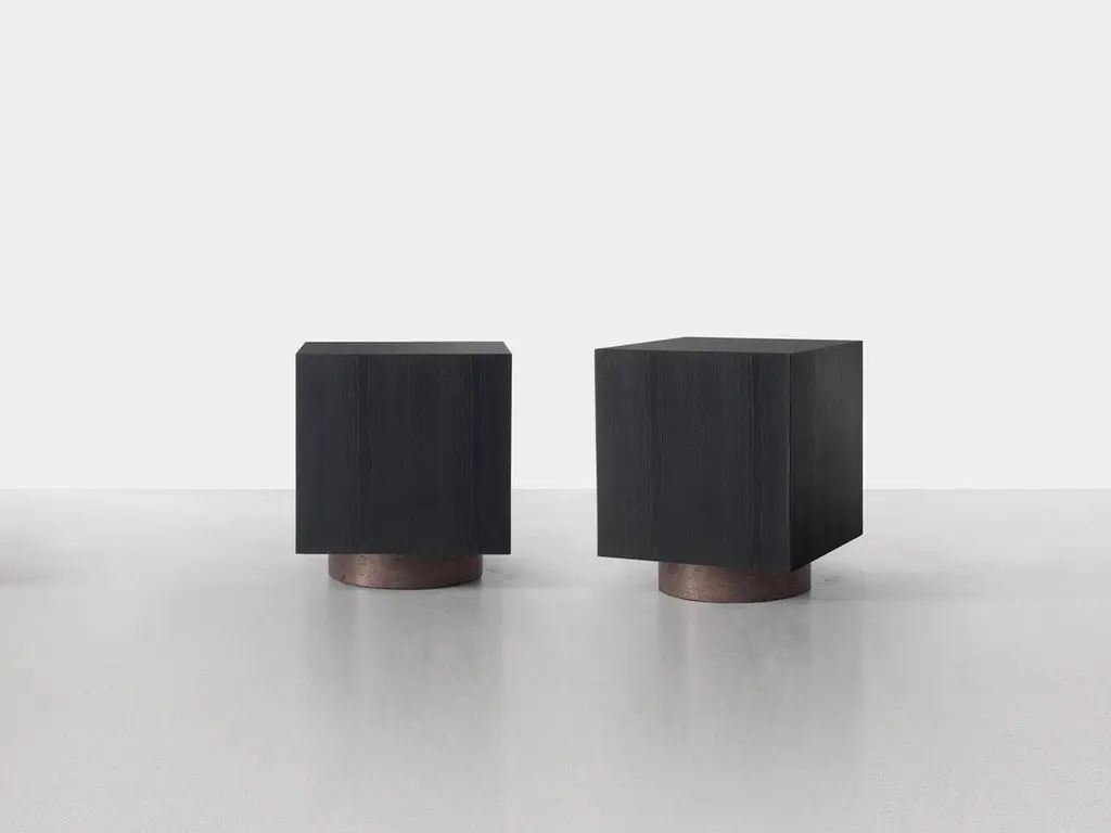 Inspired by the most famous of cubes, these volumes can be juxtaposed or stacked endlessly. Its rigid andessential appearance is inversely proportional to its compositional flexibility.Plywood structure and door with workmanship at 45 degrees. Doors with push-pull system opening.Internal compartment with bronze glass shelf. The element is modular as sideboard or bookcase. Ash woodenveneer in black open pore matt finish, mdf base with Pure metal finish in Burnished Copper-Bronze mix.More wooden veneers, lacquered finishes and Pure metal finishes are available as per sample book.Pure Metal Finish: Liquid metals, made with top quality metal alloys, allow for the creation of original three-dimensional textures with that great visual impact that is typical of artisanal castings, obtaining the brilliance and high resistance of the newly forged metals. The result is a surface where lights and shadows come to life, created by use of the spatula then sanding.