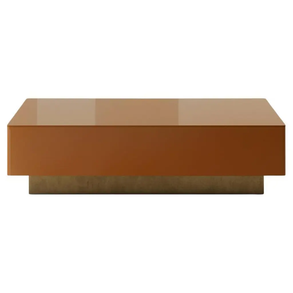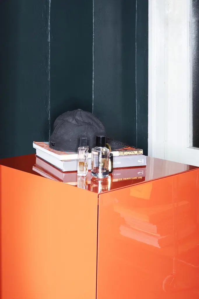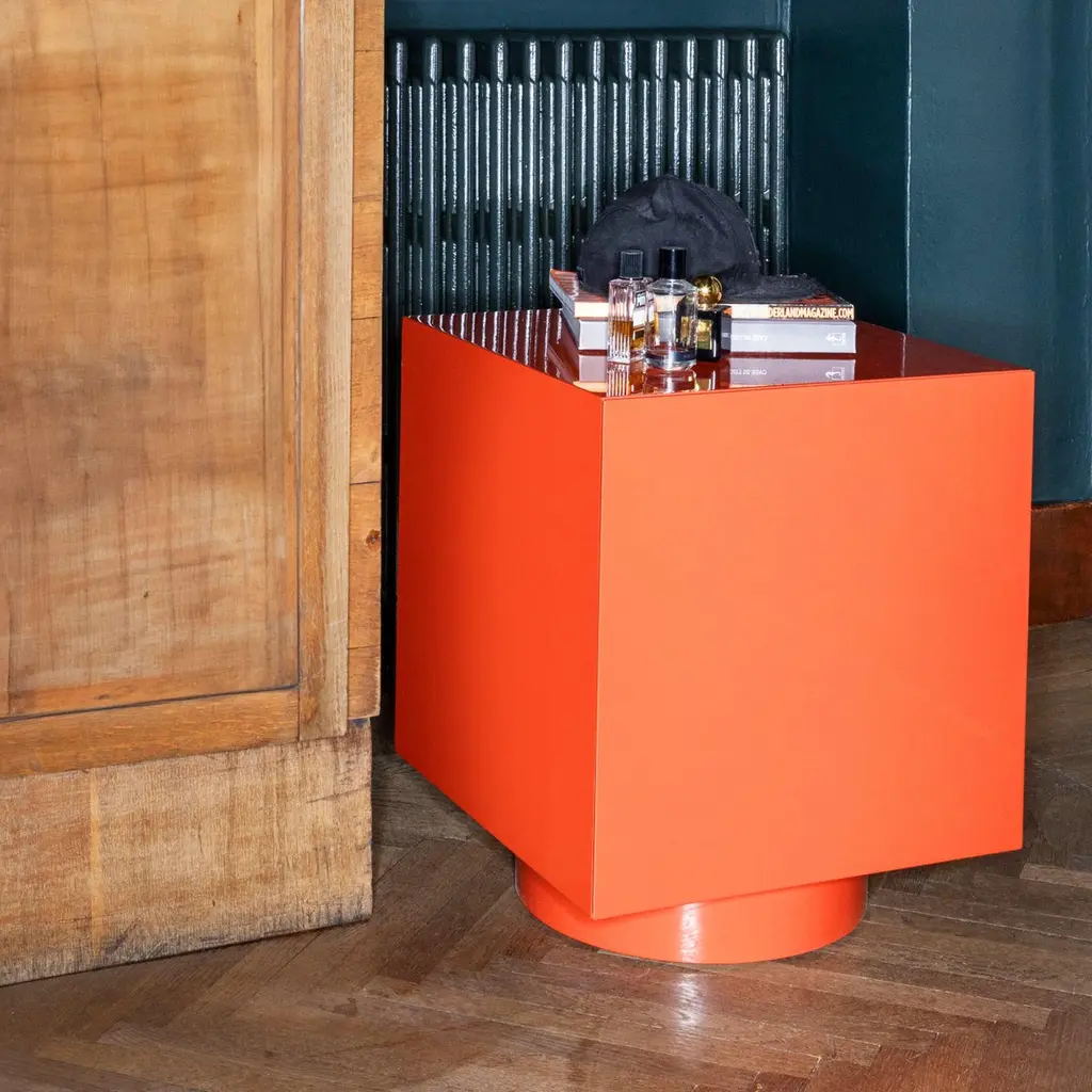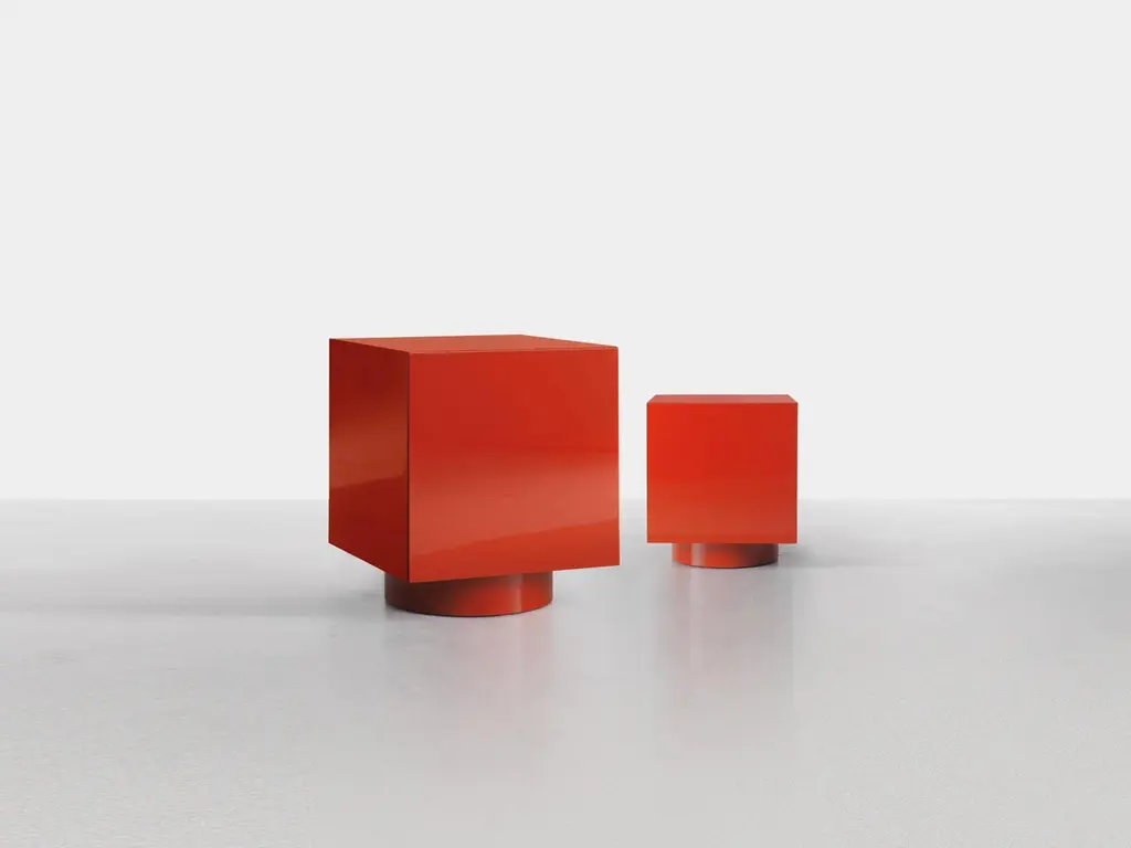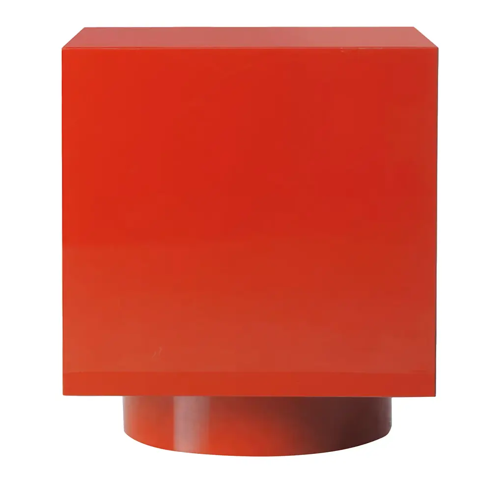 Inspired by the most famous of cubes, these volumes can be juxtaposed or stacked endlessly. Its rigid andessential appearance is inversely proportional to its compositional flexibility.Plywood structure and door with workmanship at 45 degrees. Doors with push-pull system opening.Internal compartment with bronze glass shelf. The element is modular as sideboard or bookcase. Coral redhigh gloss polyester lacquered finish.More wooden veneers, lacquered finishes and Pure metal finishes are available as per sample book.The 100 gloss shiny polyester lacquers, with machine and manual brushing, are obtained thanks to a process that requires up to eight different paint coats. A range of colors specially designed for this collection is also available in matt finish.