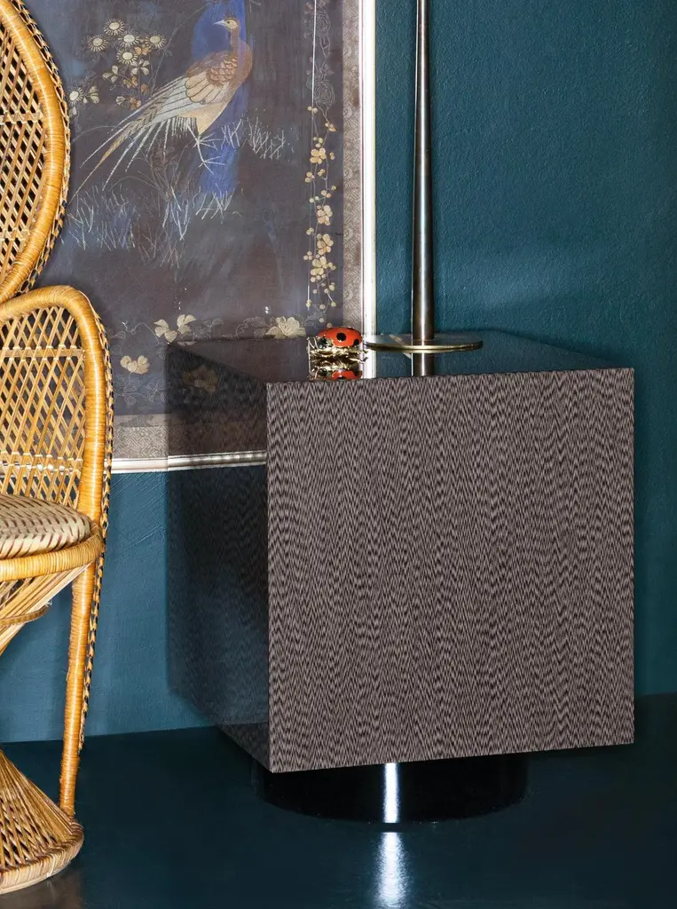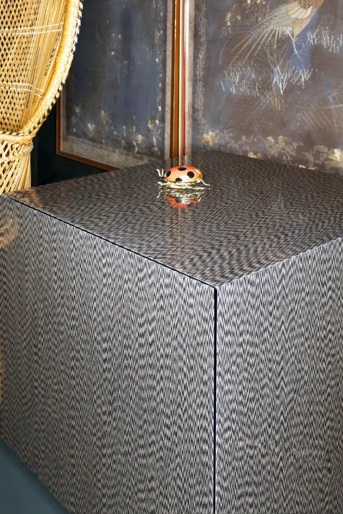 Inspired by the most famous of cubes, these volumes can be juxtaposed or stacked endlessly. Its rigid andessential appearance is inversely proportional to its compositional flexibility.Plywood structure and door with workmanship at 45 degrees. Doors with push-pull system opening.Internal compartment with bronze glass shelf. The element is modular as sideboard or bookcase. Zebra veneer with polyester high gloss finish, base in black high gloss polyester lacquered finish.More wooden veneers, lacquered finishes and Pure metal finishes are available as per sample book.Multi-laminar veneer Zebra wood is treated in a glossy finish to better appreciate its kaleidoscopic effect.