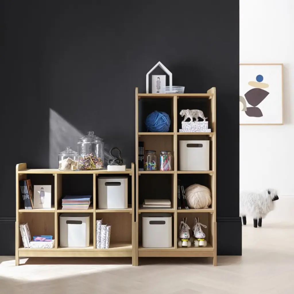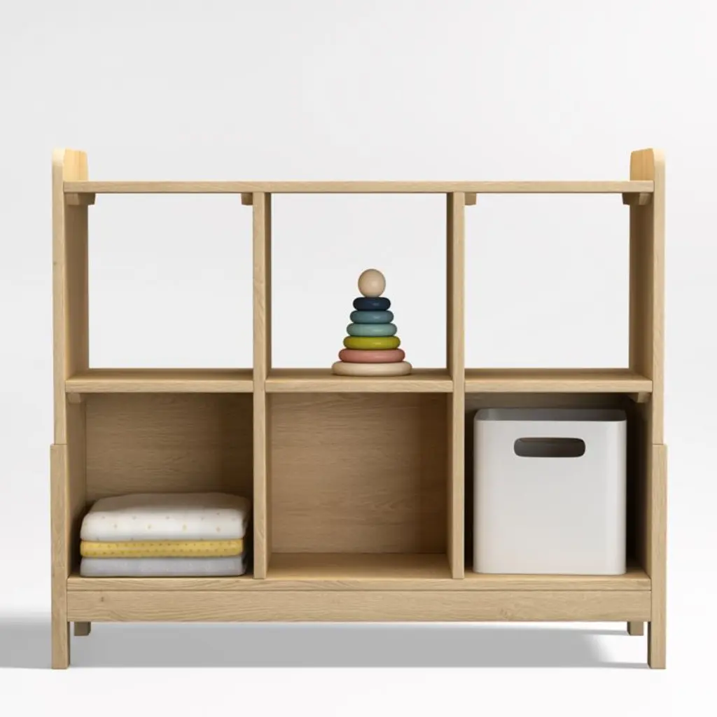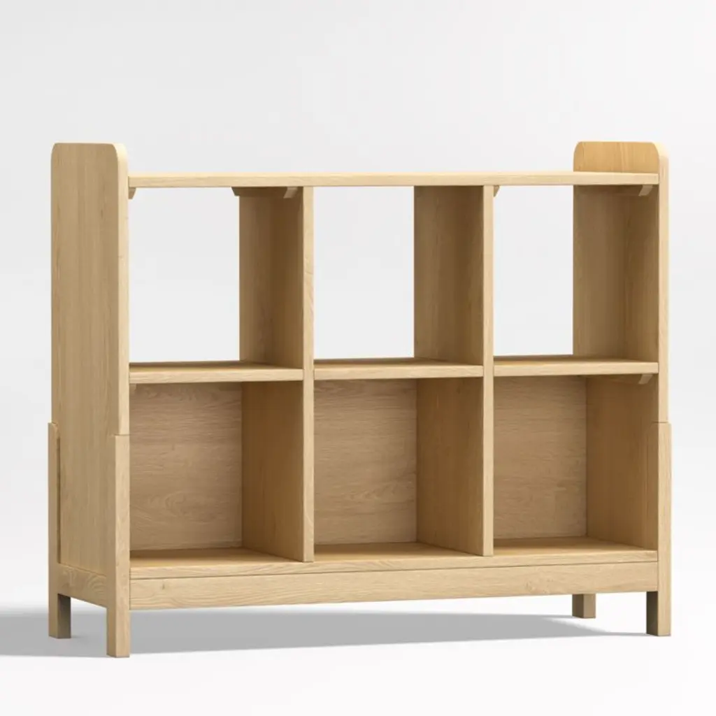With a compact horizontal design and modern mix of opened and closed storage, our Rue 6-Cube Low Bookcase is a versatile decluttering essential. The neutral hue is perfect for nurseries and kids rooms, and the natural oak graining adds warmth and texture. Situate the bookcase against a wall or in a corner, or fit it into kid nooks and alcoves. The six compartments are designed to accommodate our cube storage containers (sold separately), allowing for easy organization and quicker clean-up times. Plus, you can display their favorite toys, kids decor and books along the top.