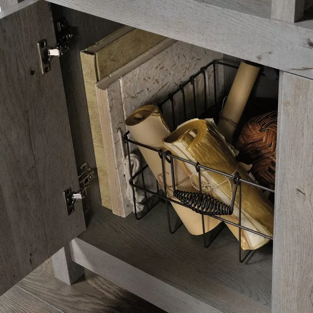 Is the clutter and chaos in your home beginning to get a little out of hand? Not to worry. Become the master of storing and organizing with this storage wall from the Cannery Bridge collection. It features nine cubbyhole storage areas for you to store items like your collection of novels, bins full of crafting supplies, photo albums and much more! Switch it up and display your favorite home décor items too – knick-knacks, decorative plants, and picture frames. You can find room for it all! It includes six adjustable shelves that you can move to different heights to create flexible options for items of all shapes and sizes. Behind each of the lower doors is a hidden storage area for additional storage space of miscellaneous items that you prefer remain unseen. Its simplistic industrial age inspired style and versatile design make this organizer cabinet a perfect fit for any room in your home – living room, entryway, down the hallway or even in the bedroom. Finished in Mystic Oak, this beautiful storage wall is everything you need and more.