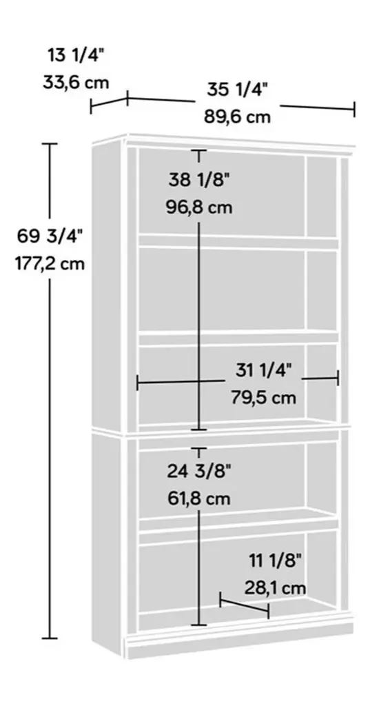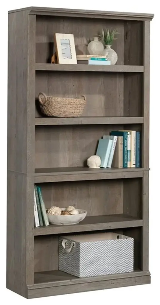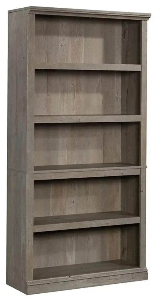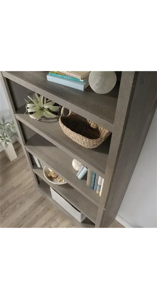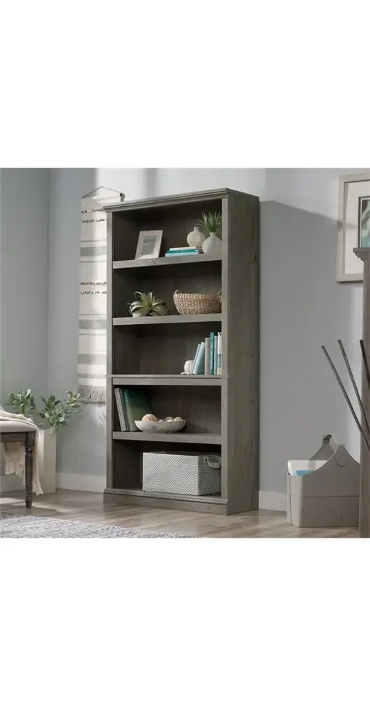 There is no such thing as too much storage space. Add the versatile storage options that your home needs while adding the beautiful style and design that you want with this transitional 5-shelf bookcase from the Sauder Select collection. This tall bookcase features five spacious shelves that provide you with all the room you need to store a variety of different items like your collection of novels, stacks of magazines, and organizing bins. These large shelves also make a great place to display home décor items like your array of knick-knacks, decorative plants and wireless speakers. This storage bookcase includes three adjustable shelves that have the ability to move to different heights to create flexible storage options for items of all shapes and sizes. Its simple charm and attractive good looks make it a perfect fit for any room in your home. Finished in Mystic Oak®, this handsome 5-shelf bookshelf is everything your home needs and more.Features:Finish: Mystic OakMaterial: Engineered WoodFeatures Five (5) spacious shelves that provides room to store a variety of different itemsThree (3) of these shelves can move to different heights to create flexible storage and display for items of all shapes and sizesA great place to display home décor items like decorative plants, your array of collectibles and potteryBeautiful style and versatile designQuick and easy assembly with patented slide-on moldings to save you timeDetailed instruction book for easy assemblySpecifications:Product Dimensions: 69.76"H x 35.27"W x 13.23" DProduct Weight: 91 lbsWeight Capacity: 50 lbs