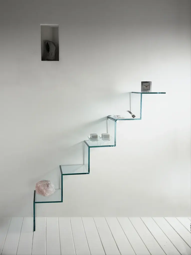 The wall shelf Scala del Cielo is an original furnishing element, studied by designer D’Urbino & Lomazzi. It has a structure in transparent or extra clear glass and can be positioned in two ways, thanks to the presence of one or two supports.Functional and decorative, the wall shelf Scala del Cielo grants several surfaces for storage resulting versatile and suited to furnish different areas of the house.Mod. A:Object holder with 1 wall support.Mod.B: - Object holder with 2 wall support.