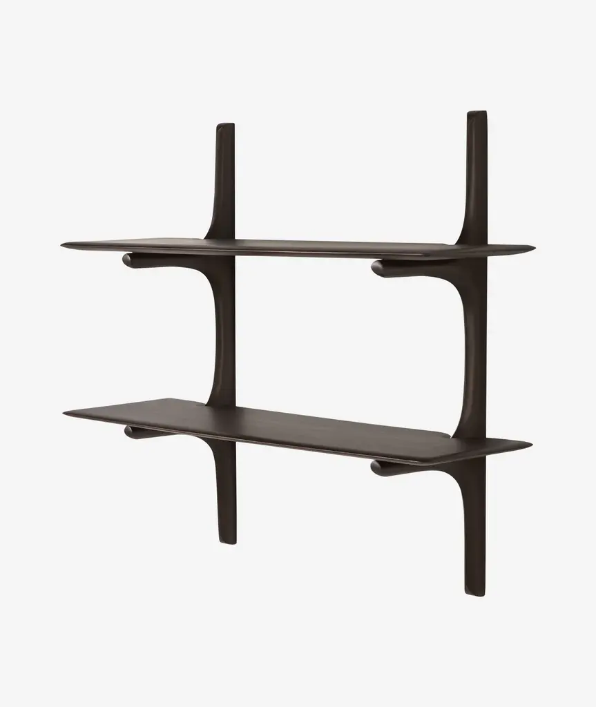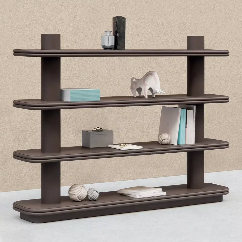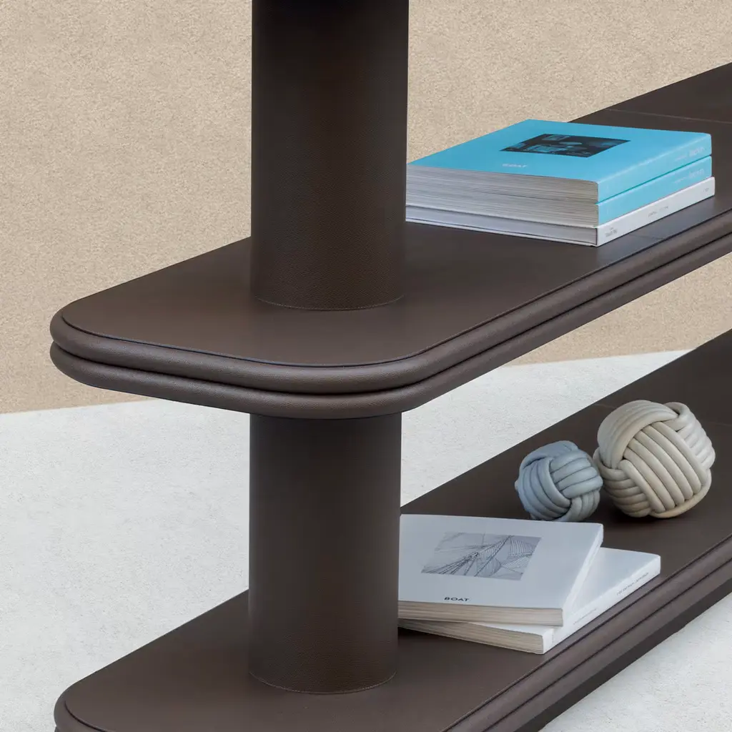 Entirely wrapped in soft brown nappa leather, this sophisticated bookcase is an exercise in balanced volumes and geometric harmony. The perfect place to showcase your favorite books and prized collectibles while adding visual interest to the interior, this freestanding bookcase stands tall on a plinth base and features a grid design with two vertical supporting poles intersecting three shelves. Available only in printed calfskin, nappa, and suede.