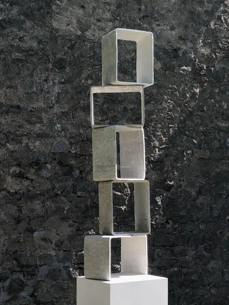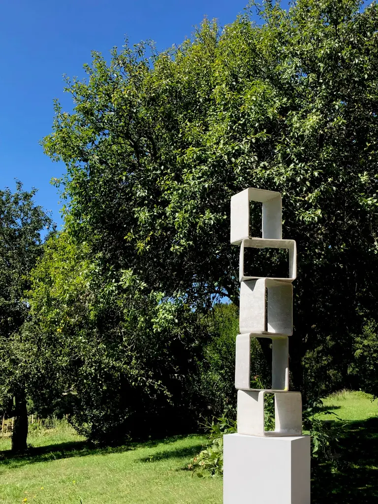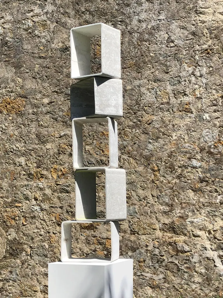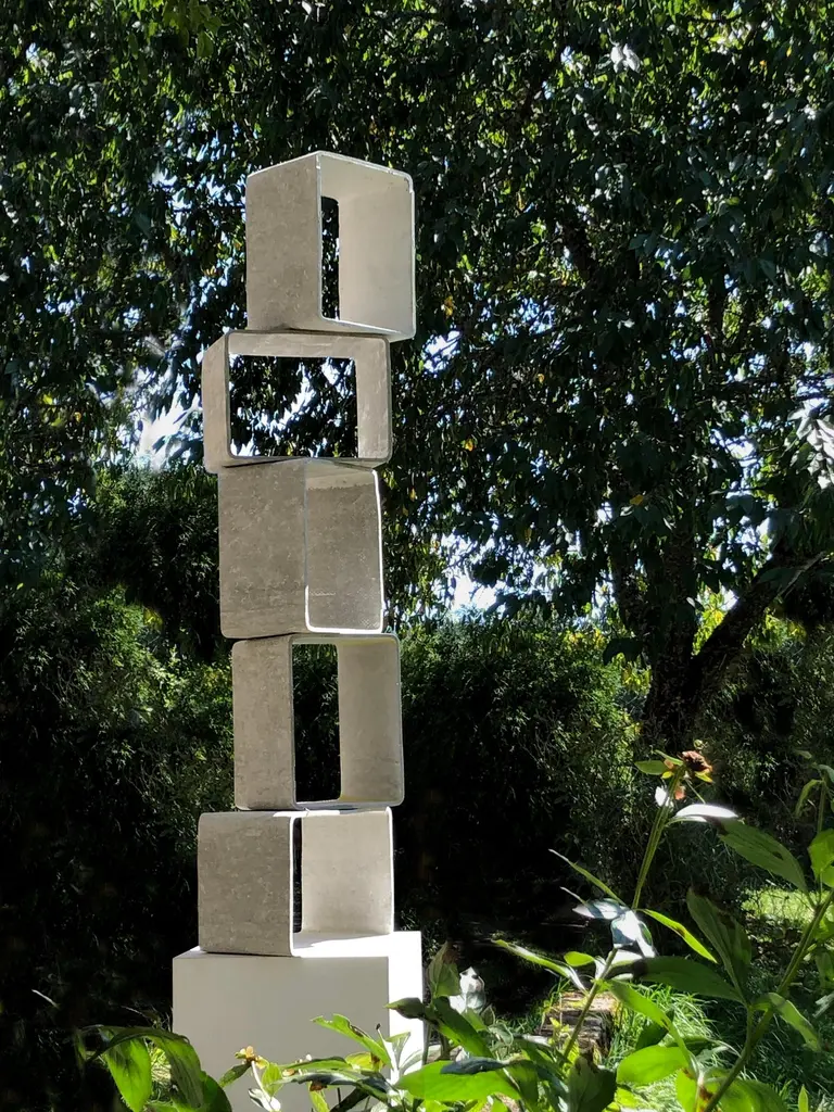 A set of 5 (on a total of 20 identical pieces!!!) modular concrete bookcases, Modernist, Free Form, Brutalist, rectangular loop cases with rounded edges, with a great grey patina with subtle white paint residues, by Willy Guhl for Eternit, Swiss 1970. These rectangular pieces can be placed horizontally or vertically, to create various combinations from low cabinet to vertical columns as here on picture. 4 sets of 5 bookcases (so a total of 20 pieces!) are available on sale, allowing to create a potentially major wall bookcase or storage.These pieces can be used indoor as well as outdoor.DIMENSIONS : H 32 x L 41.7 x P 27 cm per pieceThis set of 5 pieces allows a line of about 2 meters, horizontally or vertically.