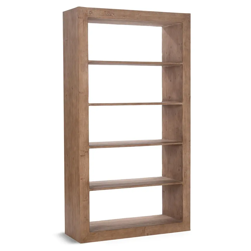 Simple modern rustic pine wood bookcase / display shelves. Natural finish and each may vary in exact coloring, wood grain, and inherent imperfections. Weighs approx. 230 lbs.