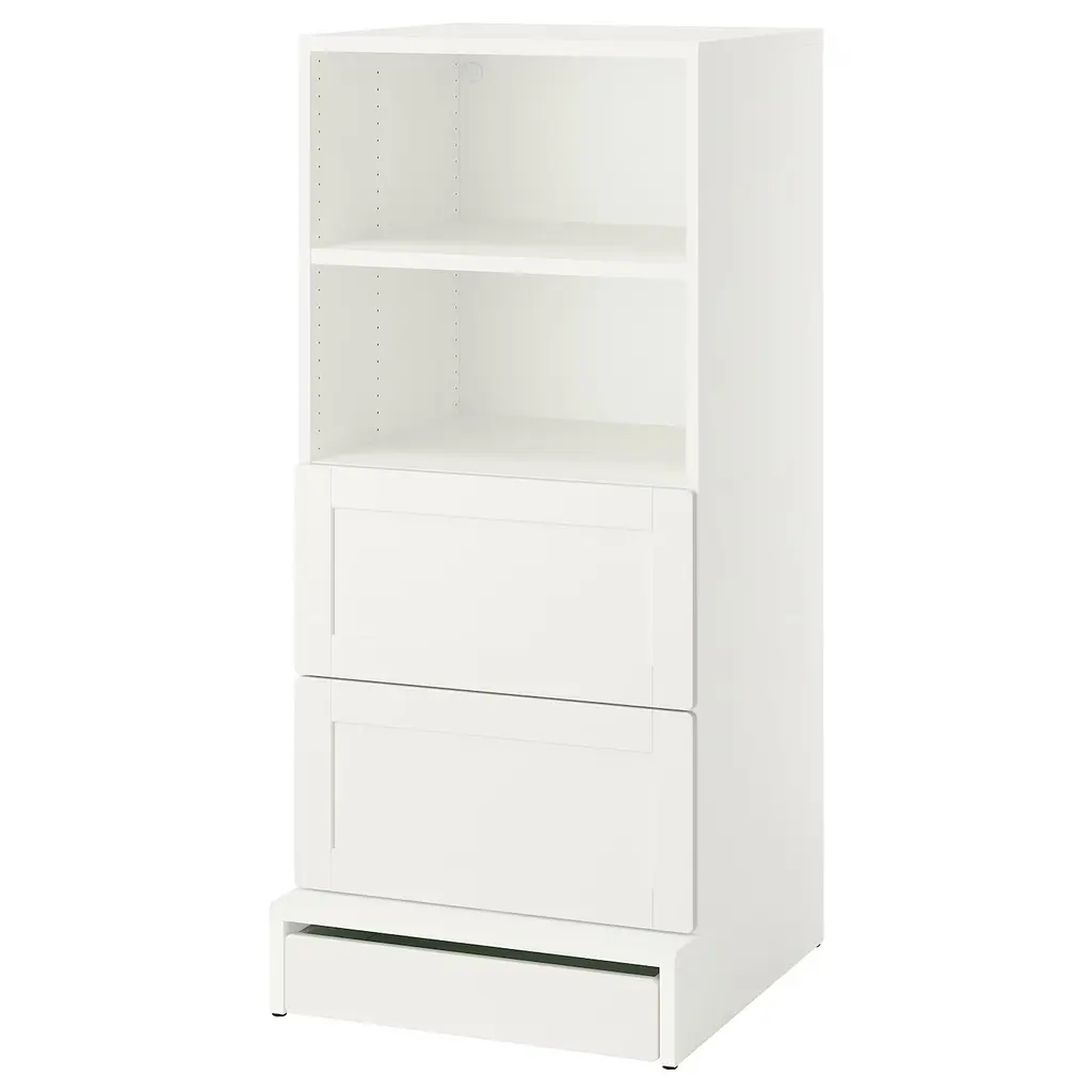 SMÅSTAD / UPPFÖRA Bookcase - white with frame/with 2 drawers 23 5/8x25 5/8x53 1/2 ". The open shelves are perfect for books and collectables, or to display the latest arts and crafts project – and since your child can see them, their desire to play is stimulated.