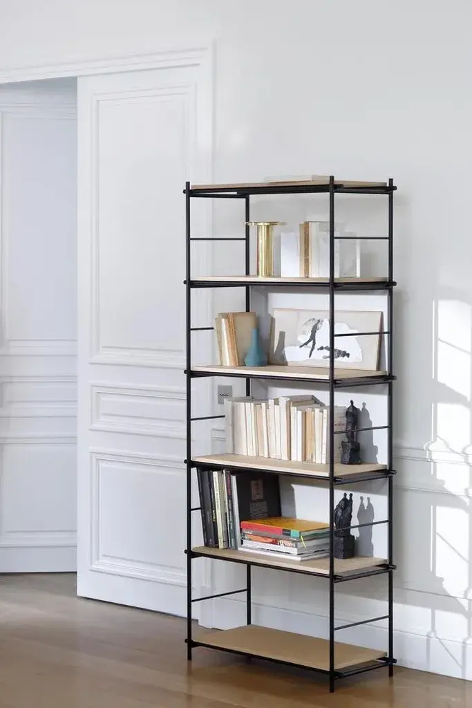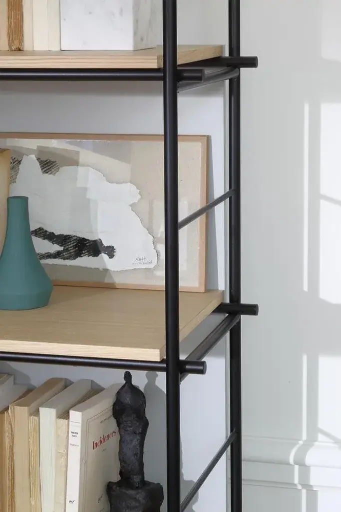 Solferino bookcase by marcos zanuso jr materials: bookcase in matt black epoxy metal. Matt lacquered natural oak veneer shelves gray lacquered backrest on mdf technique: lacquered metal. Dimensions: d 35 x w 80 x h 183 cm