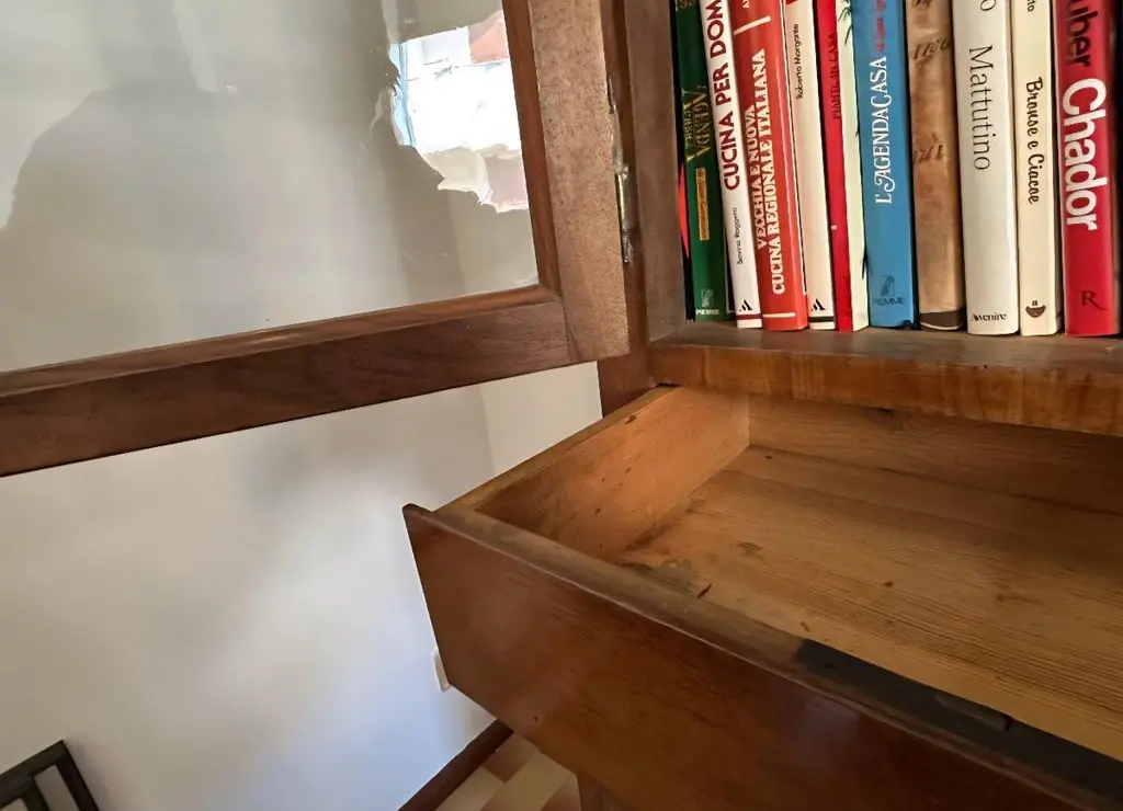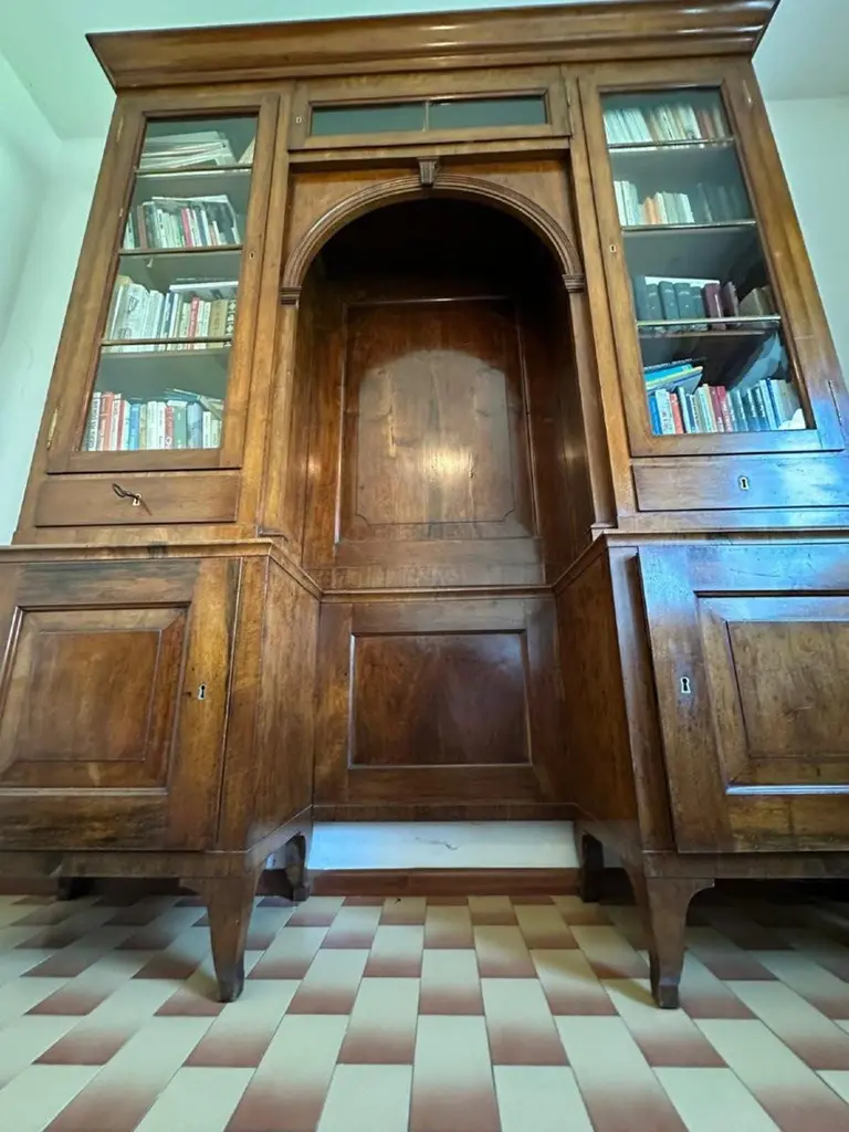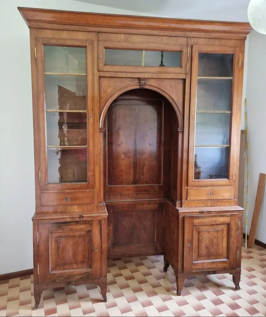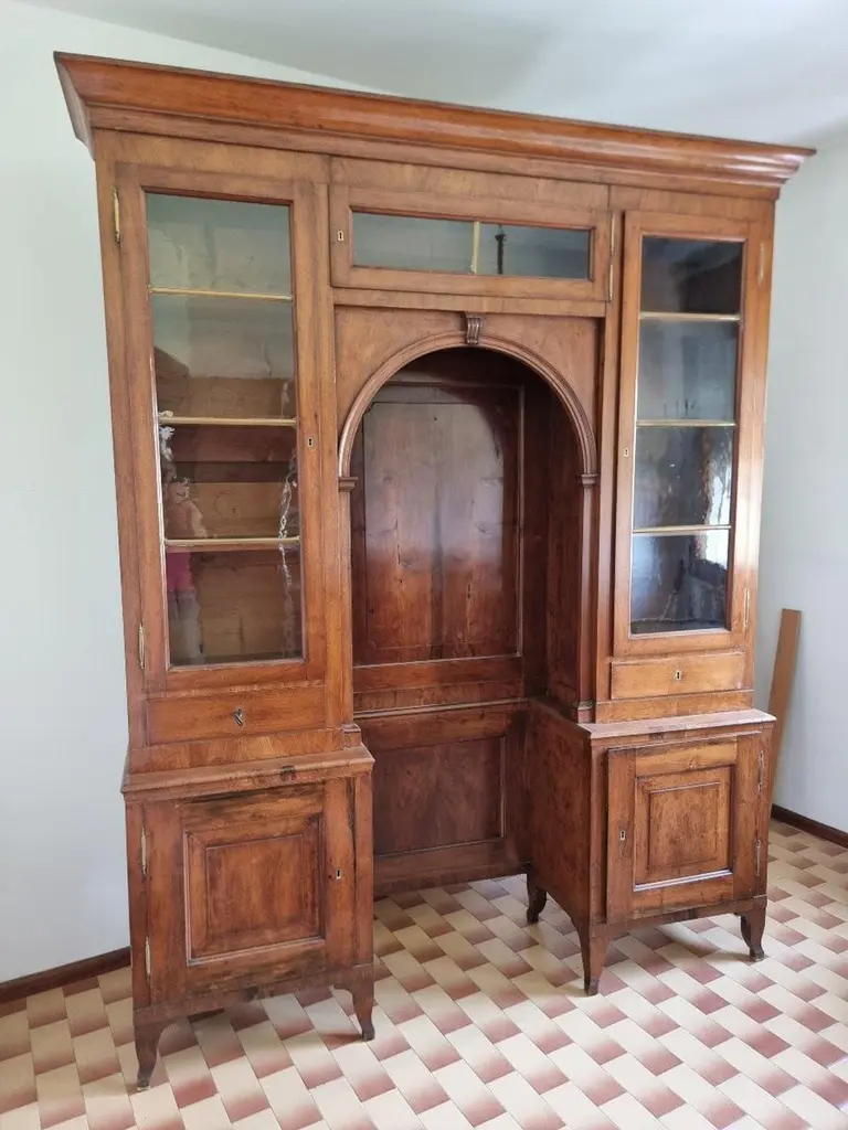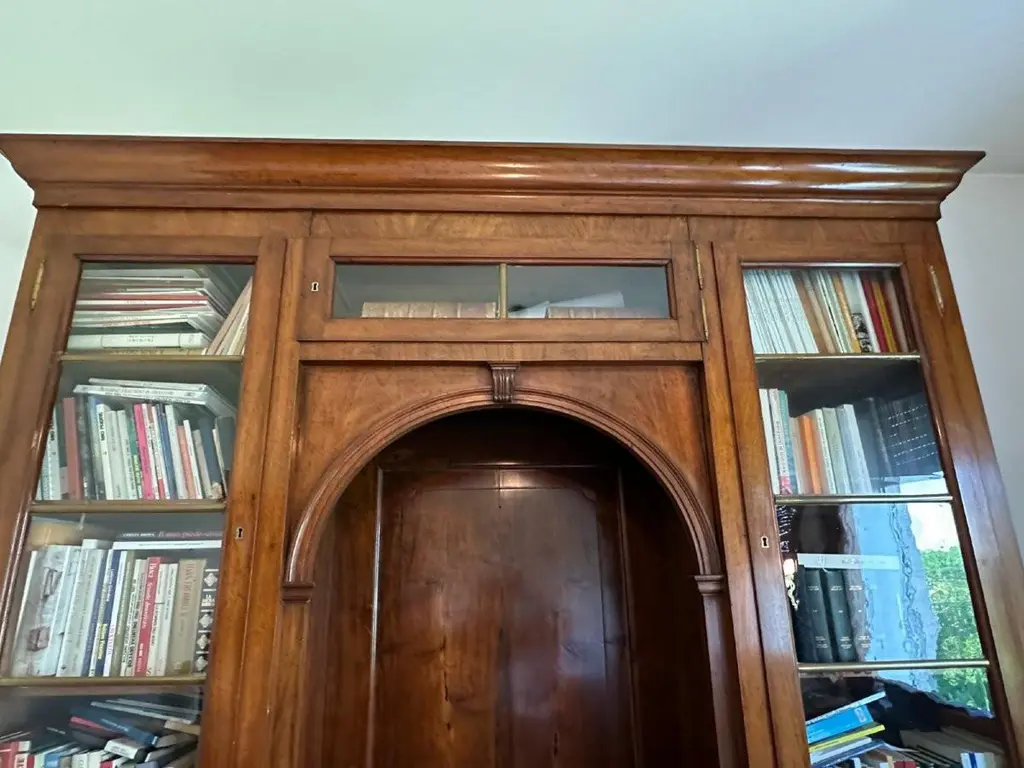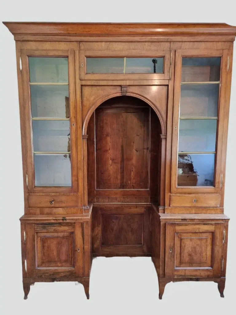 Important Venetian bookcase from the early decades of the 19th century, made entirely of solid walnut. The solid and well-proportioned structure features a distinctive "bridge" configuration, with an elegant central arch framed by two glazed side bodies. The balanced and harmonious furniture architecture is embellished with sober lines of neoclassical taste and fine construction details, visible both in the woodwork and in the arrangement of compartments. The two glass side doors, punctuated by interior shelves, are developed above a lower body enclosed by doors and drawers. The lower central part creates a dramatic niche topped by a framed arch, with smooth paneling at the bottom and useful space for display or decorative furniture. The warm patina of walnut, with its natural grain, helps give the furniture an authentic and understated character. Measures:Height:- 250cmWidth:- 205cmDepth: 45 cm Item in good condition.For more information or pictures, please feel free to contact us. Worldwide shipping possible.