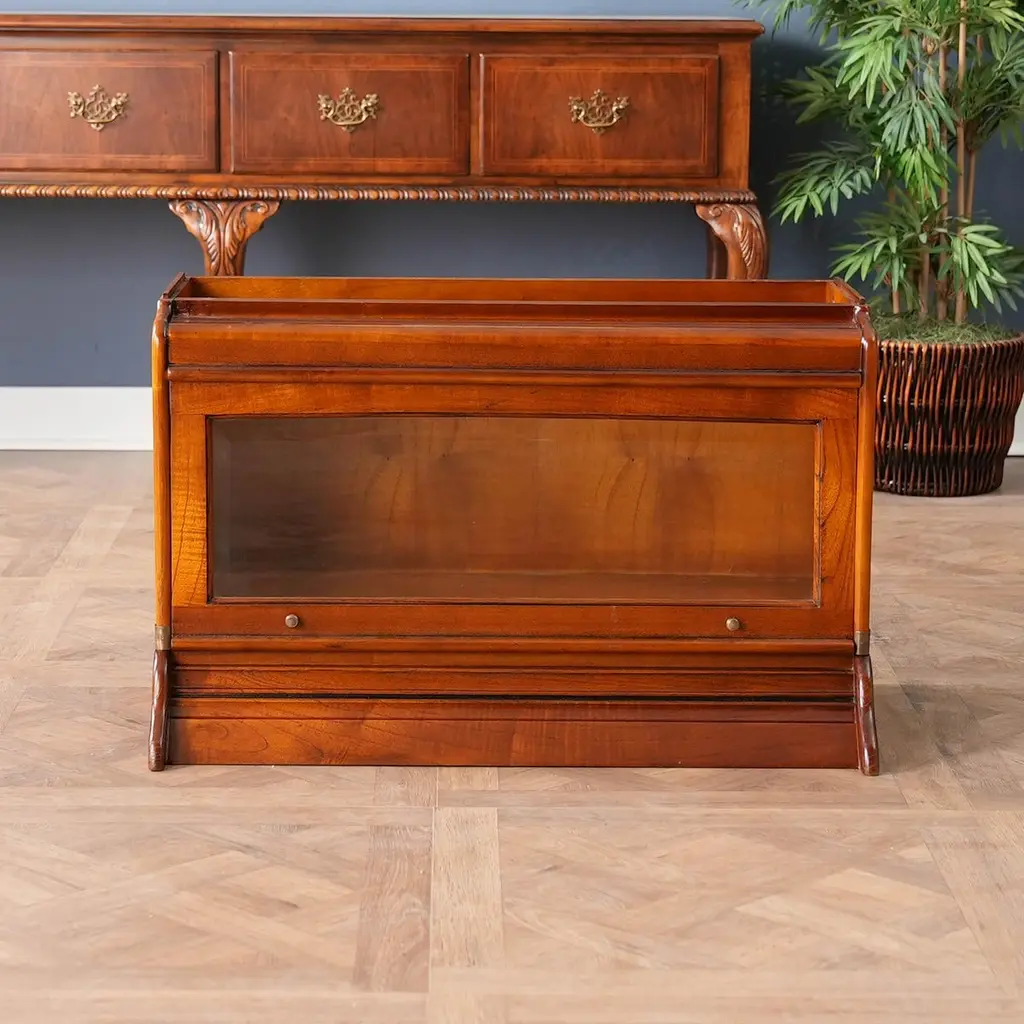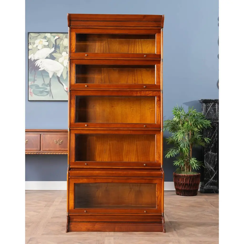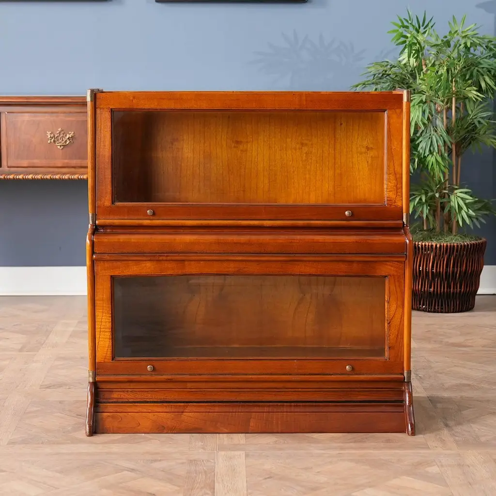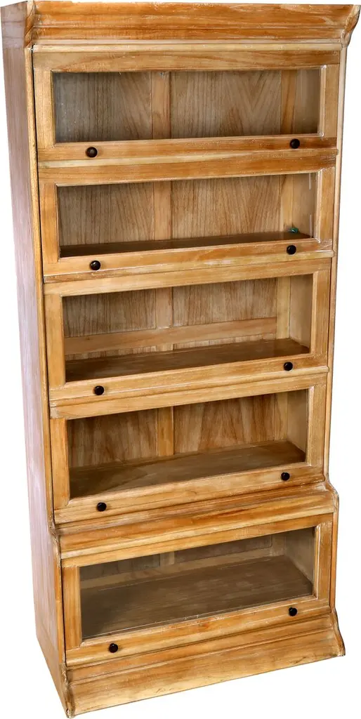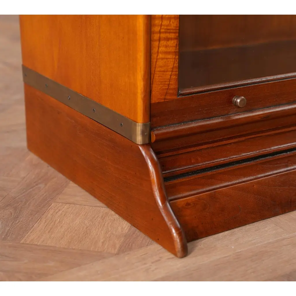This great quality Stacking Bookcase from Niagara Furniture consists of seven separate pieces: a cap, a base and five glass sections. Beginning at the bottom; the oversized atlas sized base glass fronted section is a real bonus for all the larger texts in your collection. The next 2 stacking sections will accommodate larger books as well and the top two sections hold paperbacks and smaller size books. Each section has a glass front door which lifts up and slides back for easy access to your books, this feature helps to keep your books dust free. The side of each section in the Niagara Furniture Stacking Bookcase is fitted with a brass strap which gives the overall piece a finished and refined appearance. Useable Interior Sizes:Small Size 31″ and 1/2″ wide x 9″ deep x 8″ highLarge Size 31″ and 1/2″ wide x 9″ deep x 10 and 1/2″ highAtlas Size 31″ and 1/2″ wide x 12″ deep x 9 and 1/2″ highOverall Measurements 33″w x 17″d x 73″h metric 84 43 185