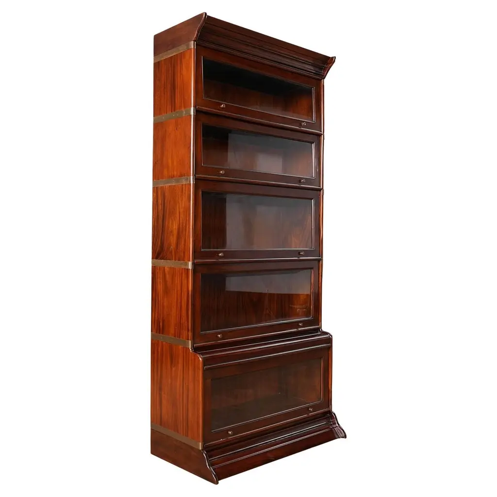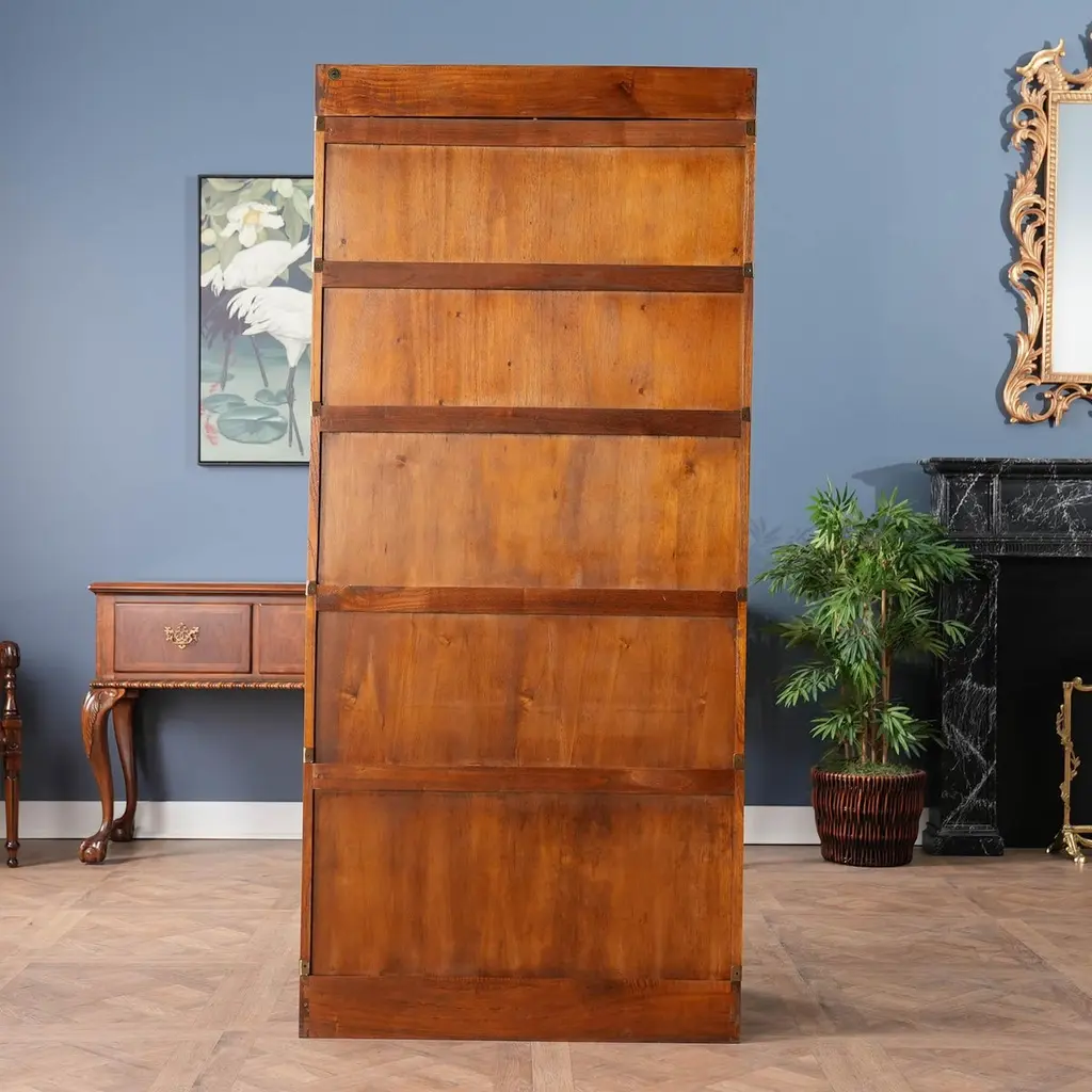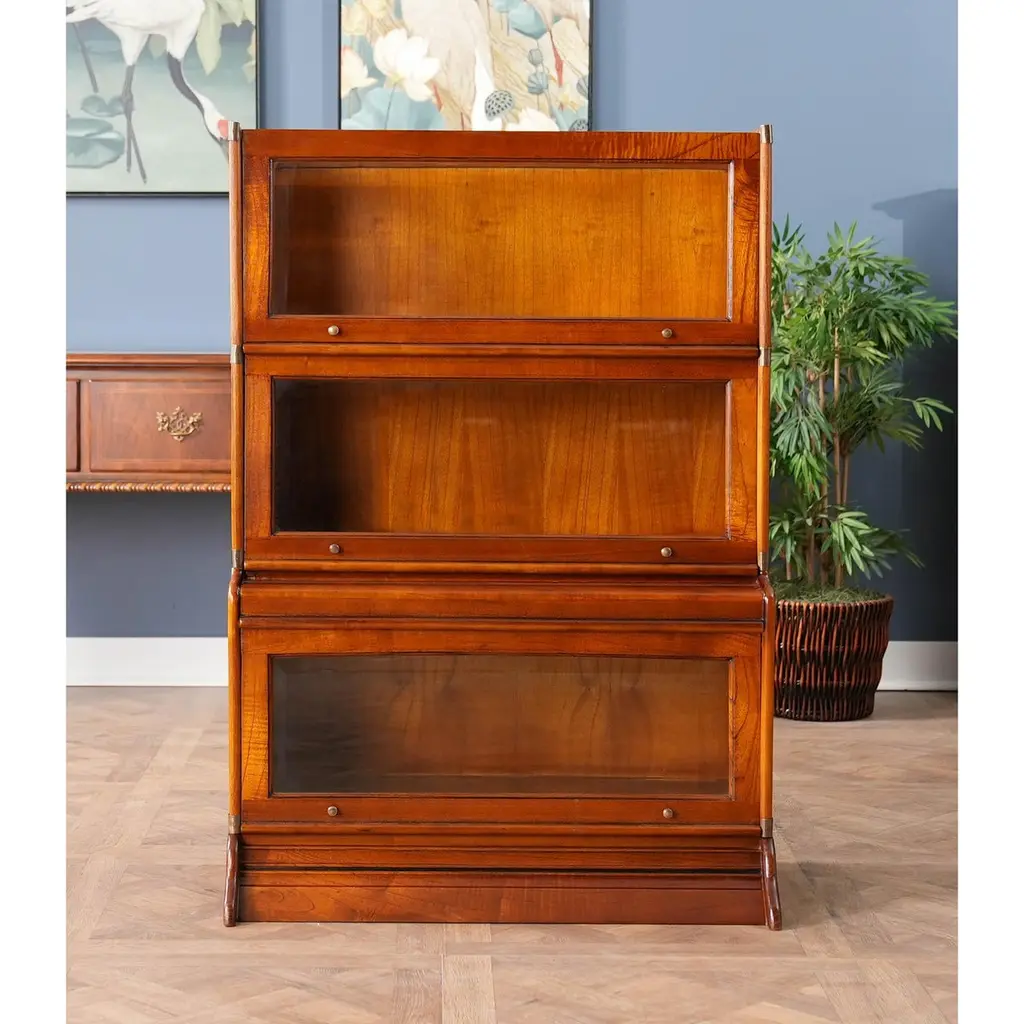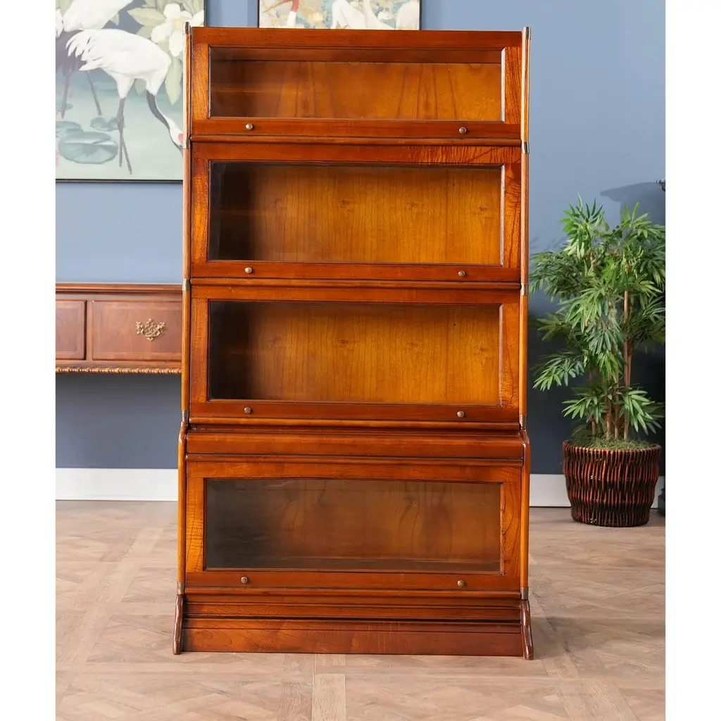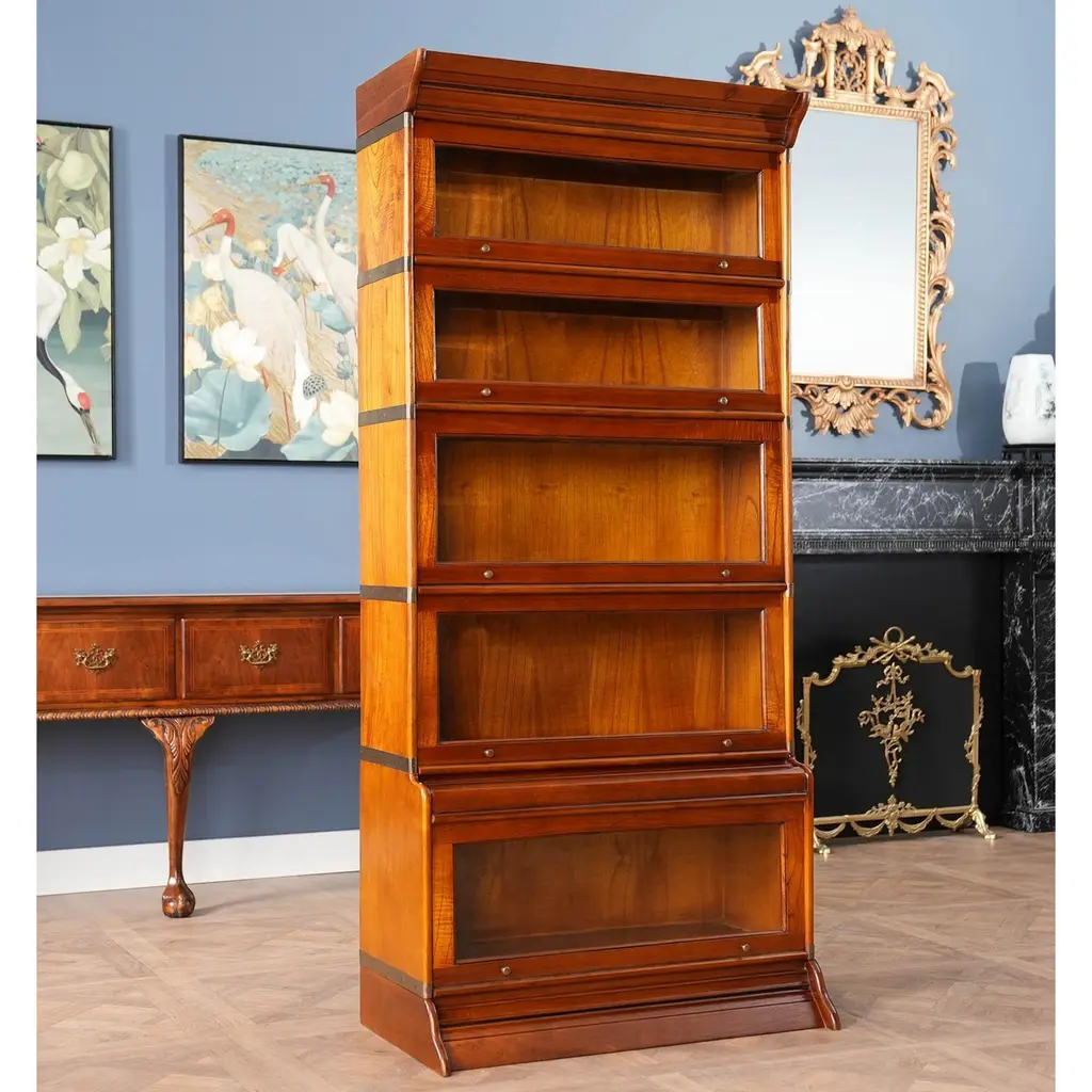 This great quality Stacking Bookcase from Niagara Furniture consists of seven separate pieces: a cap, a base and five glass sections. Beginning at the bottom; the oversized atlas sized base glass fronted section is a real bonus for all the larger texts in your collection. The next 2 stacking sections will accommodate larger books as well and the top two sections hold paperbacks and smaller size books. Each section has a glass front door which lifts up and slides back for easy access to your books, this feature helps to keep your books dust free. The side of each section in the Niagara Furniture Stacking Bookcase is fitted with a brass strap which gives the overall piece a finished and refined appearance. Useable Interior Sizes:Small Size 31″ and 1/2″ wide x 9″ deep x 8″ highLarge Size 31″ and 1/2″ wide x 9″ deep x 10 and 1/2″ highAtlas Size 31″ and 1/2″ wide x 12″ deep x 9 and 1/2″ highOverall Measurements 33″w x 17″d x 73″h metric 84 43 185