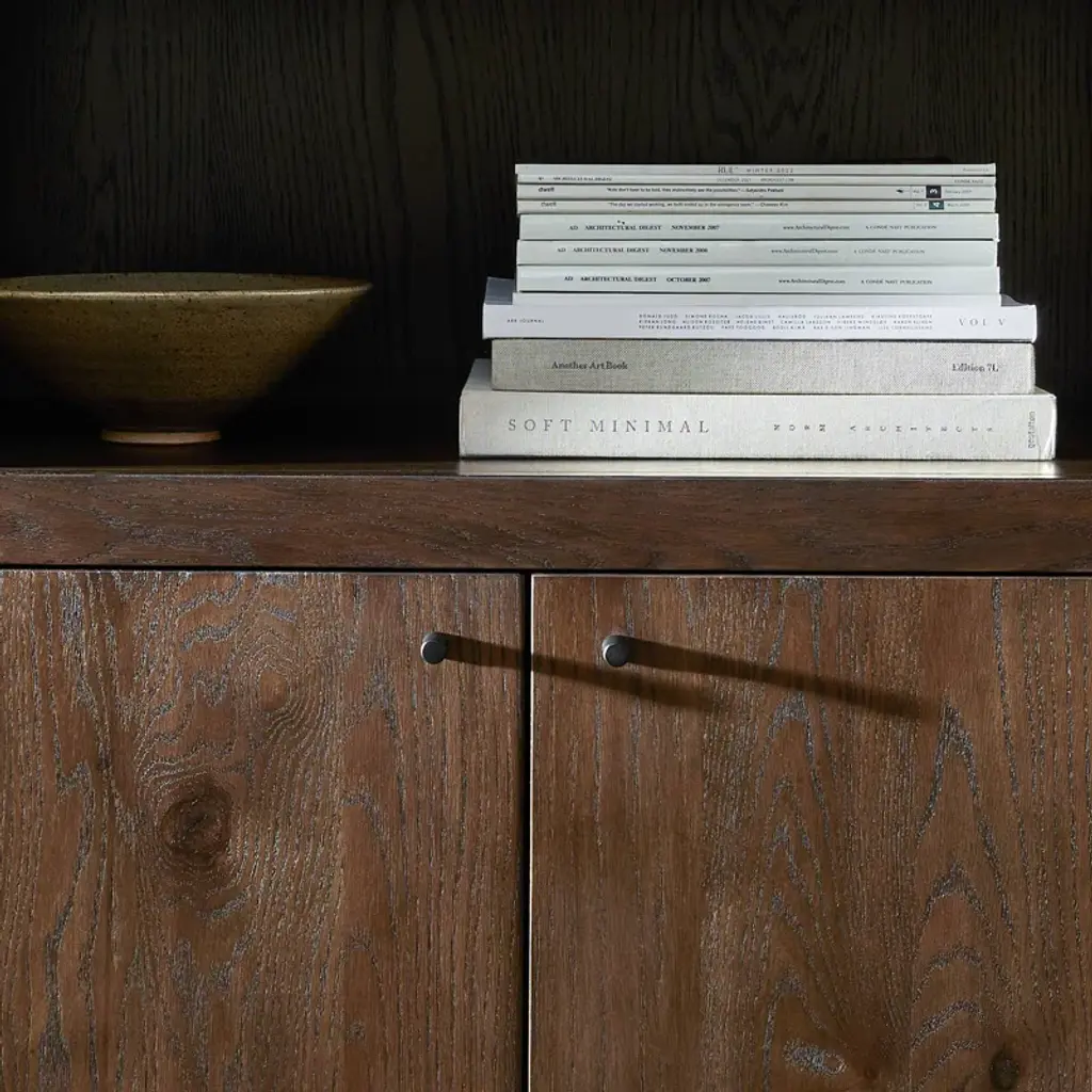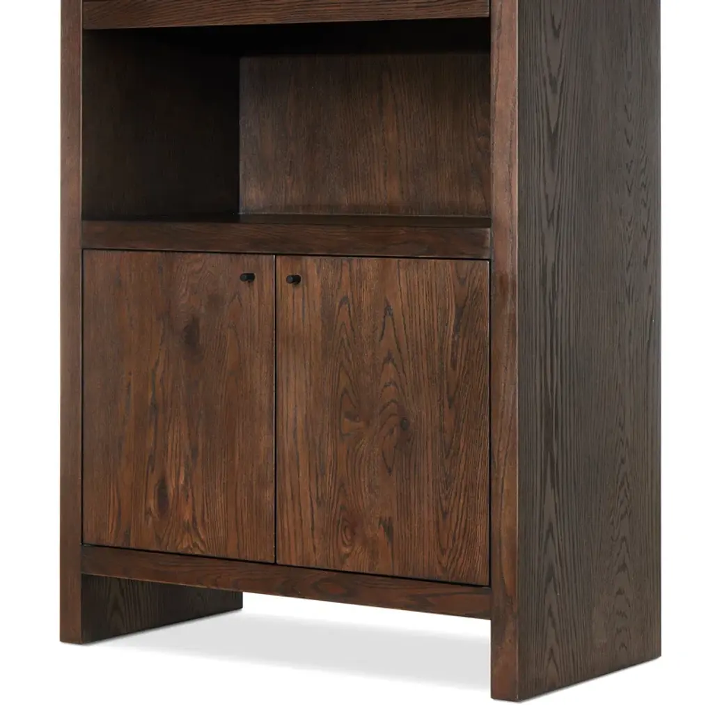 Dark-finished oak shape four clean, spacious shelves, complemented by a two-door cabinet below, bringing bonus storage to your space.