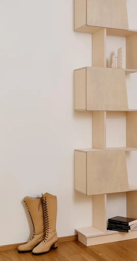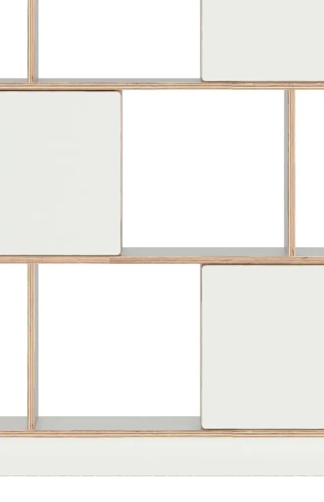 Step into the future with STEP shelf. Diagonal angles give it a real futuristic feel. The intermittent shelves and doors make a great geometric play and give you options – you can show some things but leave some out of sight. STEP comes in four different widths and several different heights. Find your perfect STEP!In this bookcase STEP there is cabinet between each shelf and by deciding the location of the divider you choose the opening direction for each of the cabinet.The shelf inner height is 33 cm allowing easy accommodation of larger books and binders. The inner width of cabinets is 33 cm. An 8 cm high plinth that fits well with all skirting boards.Made of 15mm birch plywood or oak veneered, oilwaxed, also Forescolor-Valchromat (Organic Coloured Throught Wood Fibre Board). Soft close door hinges.