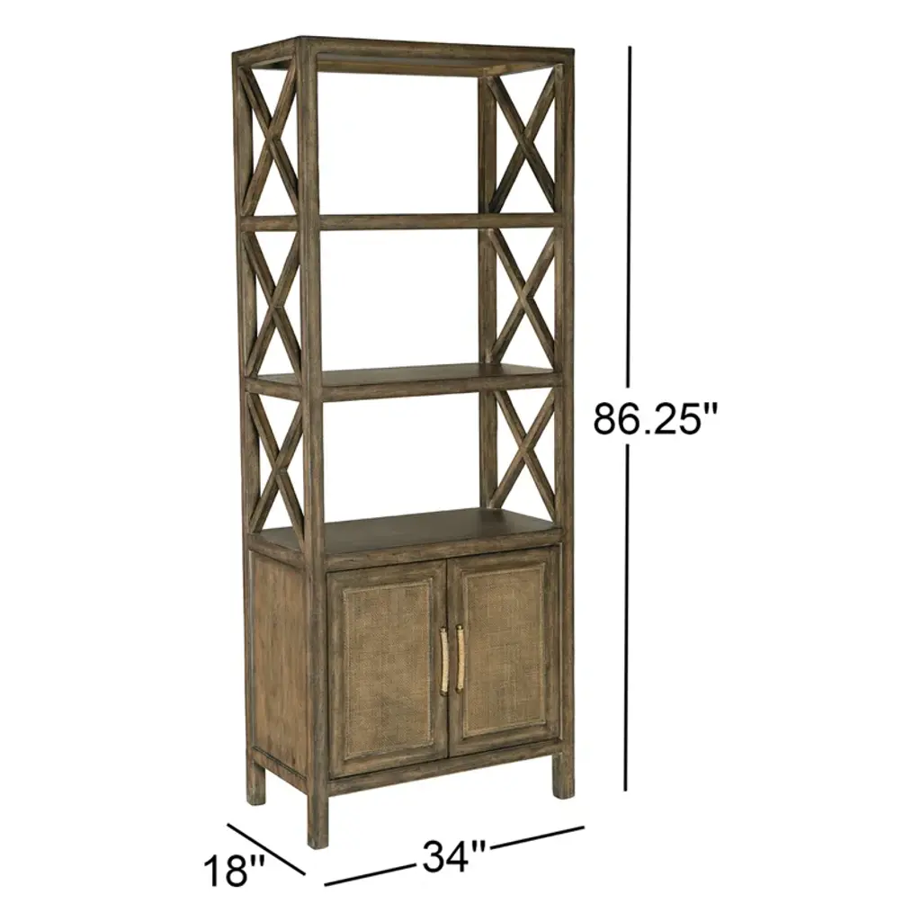 Create a resort-inspired retreat with the Sundance Entertainment Pier, featuring 2 rattan-front doors complementing a wood frame crafted of Pecan Veneers finished in the rich brown Cliffside with light burnishing on the edges. The laid-back vibe of this California casual-inspired piece is enhanced by X motifs on the sides of the shelves. Behind the doors is one adjustable vented shelf, and two fixed shelves. This piece is designed to bunch with coordinating with the 6015-55465-89 Sundance Entertainment Console full entertainment wall and can be used alone. Calling on inspiration from the iconic Pacific Coast Highway and the picturesque Malibu landscape, Sundance presents a clearly California casual aesthetic. Featured in Cliffside, a rich, dynamic brown finish with light burnishing on the edges, the collection combines a variety of natural materials including rattan, jute rope, stone, gypsum, bamboo, and driftwood motifs to present a sophisticated style that can instantly create a calming resort-inspired retreat in your very own home.