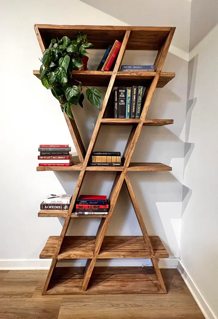 Salvaged teak wood bookcase/display shelves. Unique modern geometric hourglass a-frame design. Each will vary in natural teak wood tones, grain, and inherent imperfections. Weighs approx. 150 lbs.