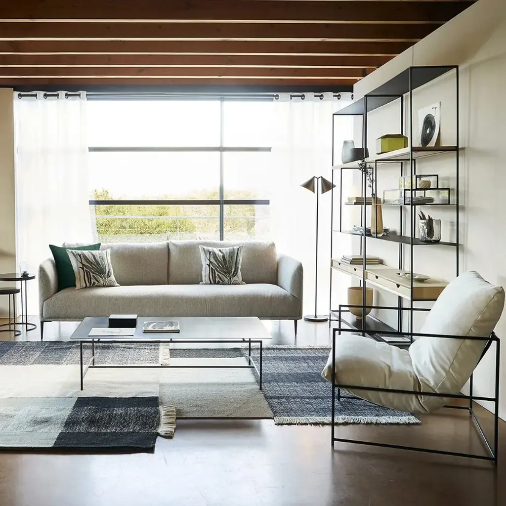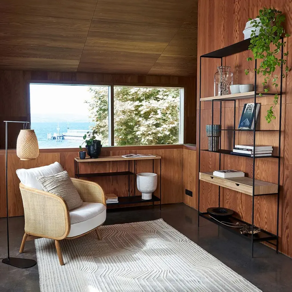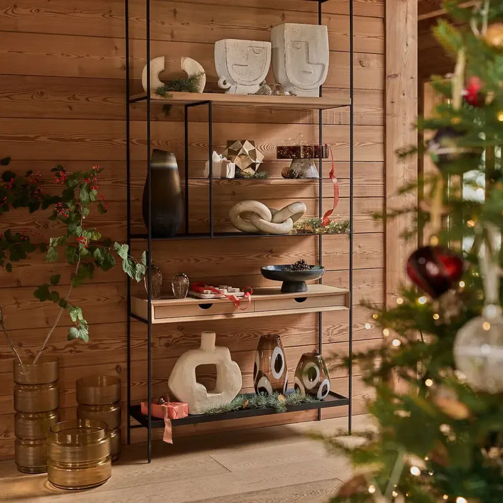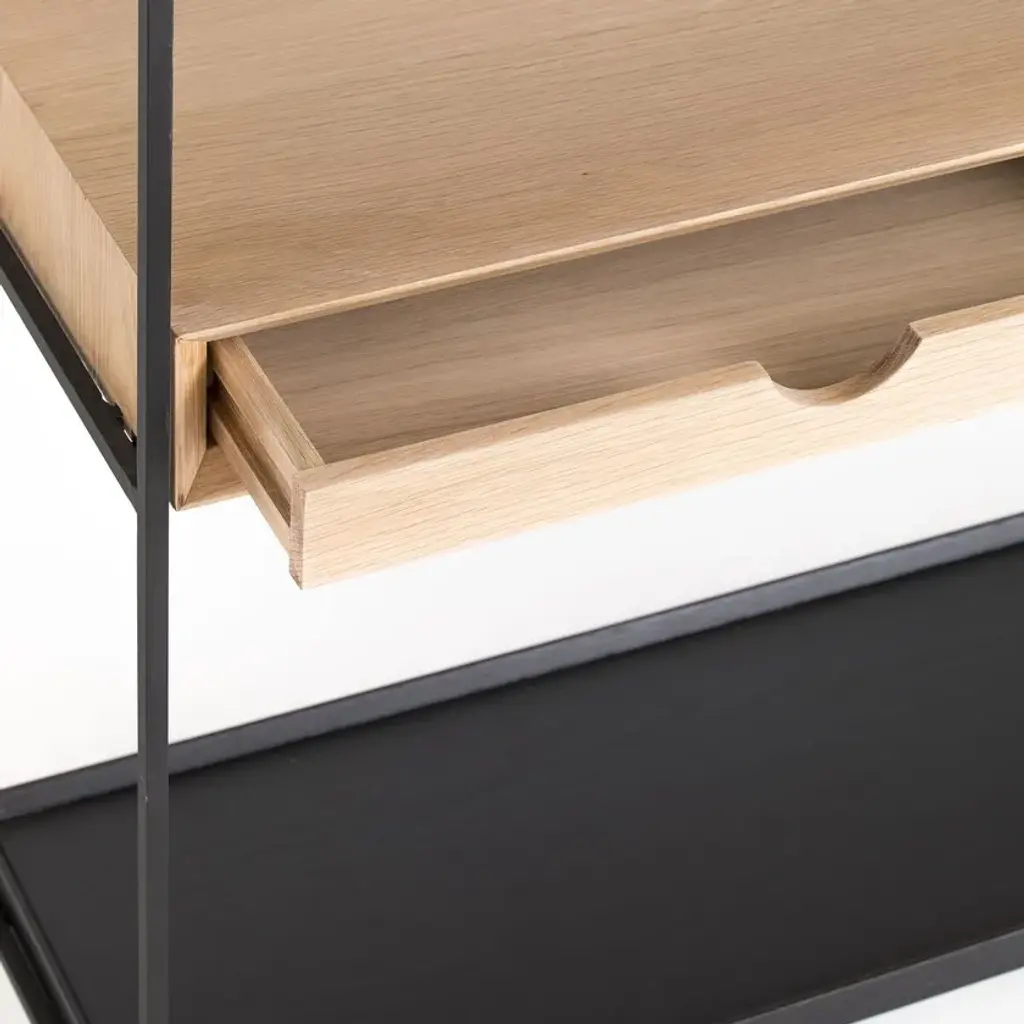 Designed and planned with bold proportions, the Tidder bookcase is inspired by a Nordic design enriched with industrial touches. Its refined shape and airy design give free rein to your favourite decoration.Metal structure, matt black epoxy finish2 oak veneered MDF shelves, FSC*, nitrocellulose varnish finish, 1 black, 3 cm thick2 metal shelves, matt black epoxy lacquer finish, 3 mm thick1 tray with 2 countersunk drawers (useful dimensions L47 x H5 x D25 cm)Delivered assembled