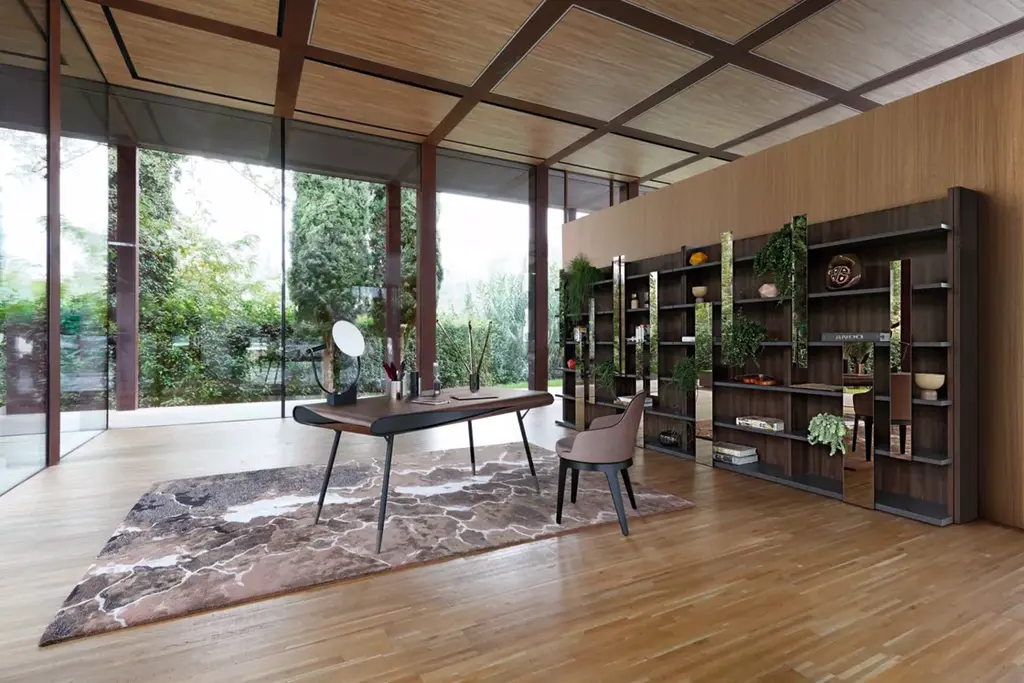 Reminiscent of a pipe organ, the mirrors arranged along the front appear as musical notes on a score of shelves. They instill this chic and decidedly contemporary bookcase with originality.