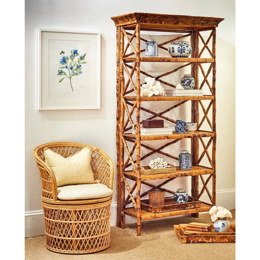 From the tropics to the mountains, this 5-shelf rattan bookcase features a tonal-rich tortoise finish. Crown molding frames the top, embracing a classic finishing touch.. Whether placed in a living area or office ... style versatility rules.
