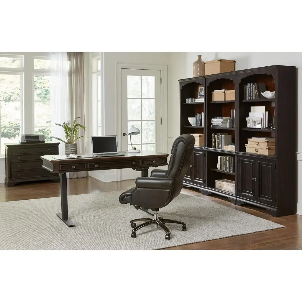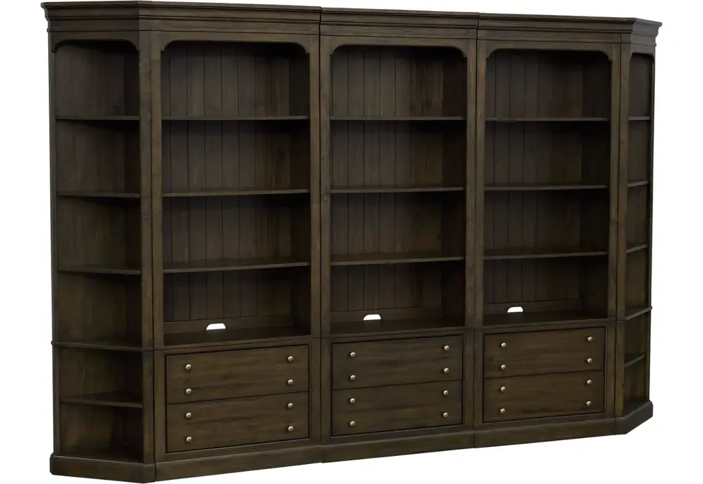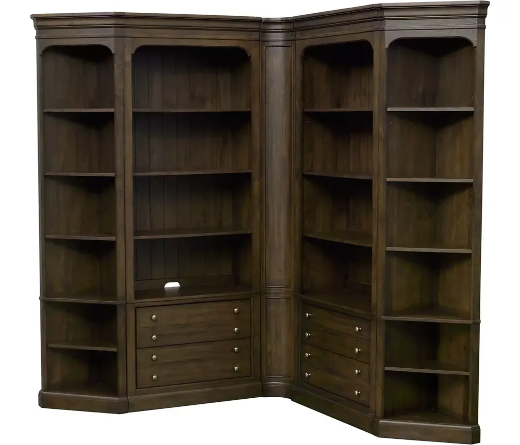 Perfect in a den, office, or living room, this impressive bookcase wall brings a sleek transitional flair wherever it goes. The beautiful black cherry finish juxtaposes with the lighter wood finish behind the shelves. Straight lines, sharp curves, and shiny antique gunmetal hardware further exemplify the sophisticated style. Additionally, the wide, spacious adjustable/removable exterior shelves are perfect for showing off displays or storing items. Interior storage options are also available behind the bottom doors.