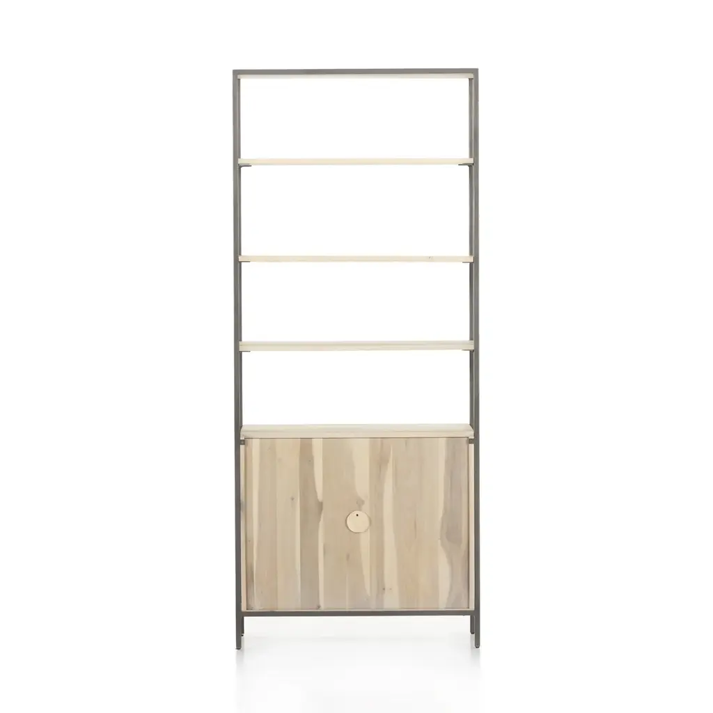 Make a sophisticated statement in any room with the Trey Modular Wide Bookcase from Four Hands. This elegant piece features a unique mixed material construction, with unexpected leather door pulls, dovetail joinery, and a high-low finish for a modern, stylish look. With ample storage options, this bookcase is perfect for adding a touch of luxury to any room. Highlights