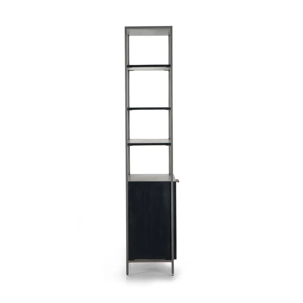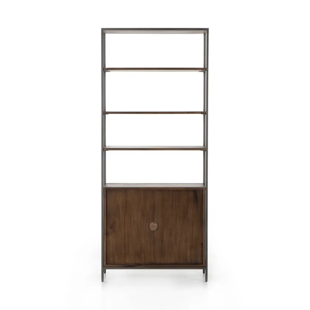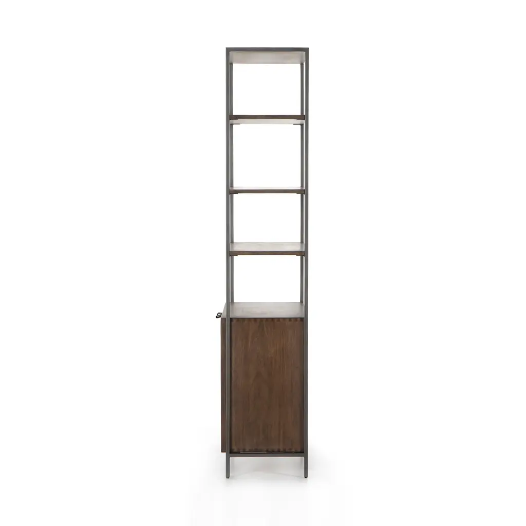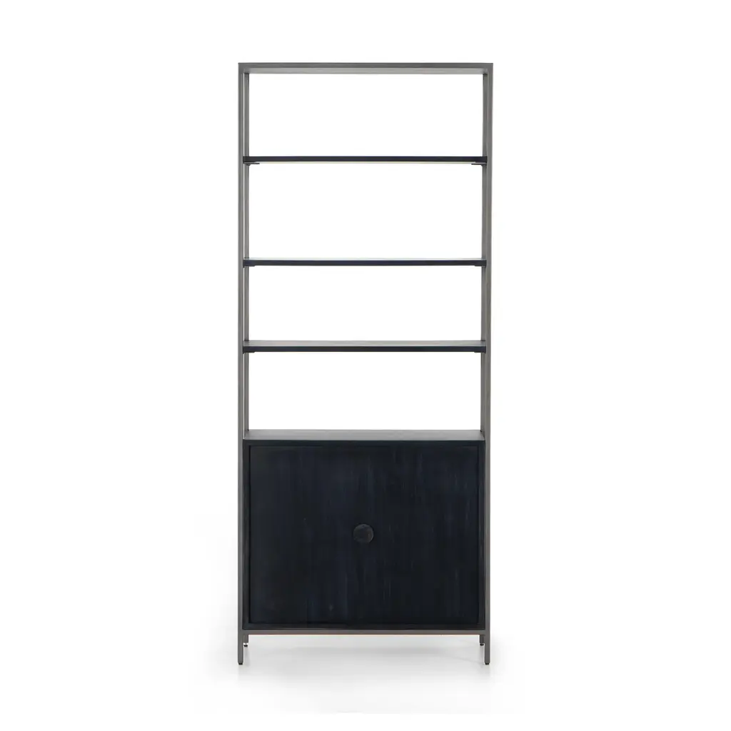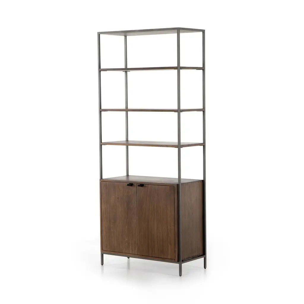 Make a sophisticated statement in any room with the Trey Modular Wide Bookcase from Four Hands. This elegant piece features a unique mixed material construction, with unexpected leather door pulls, dovetail joinery, and a high-low finish for a modern, stylish look. With ample storage options, this bookcase is perfect for adding a touch of luxury to any room. Highlights