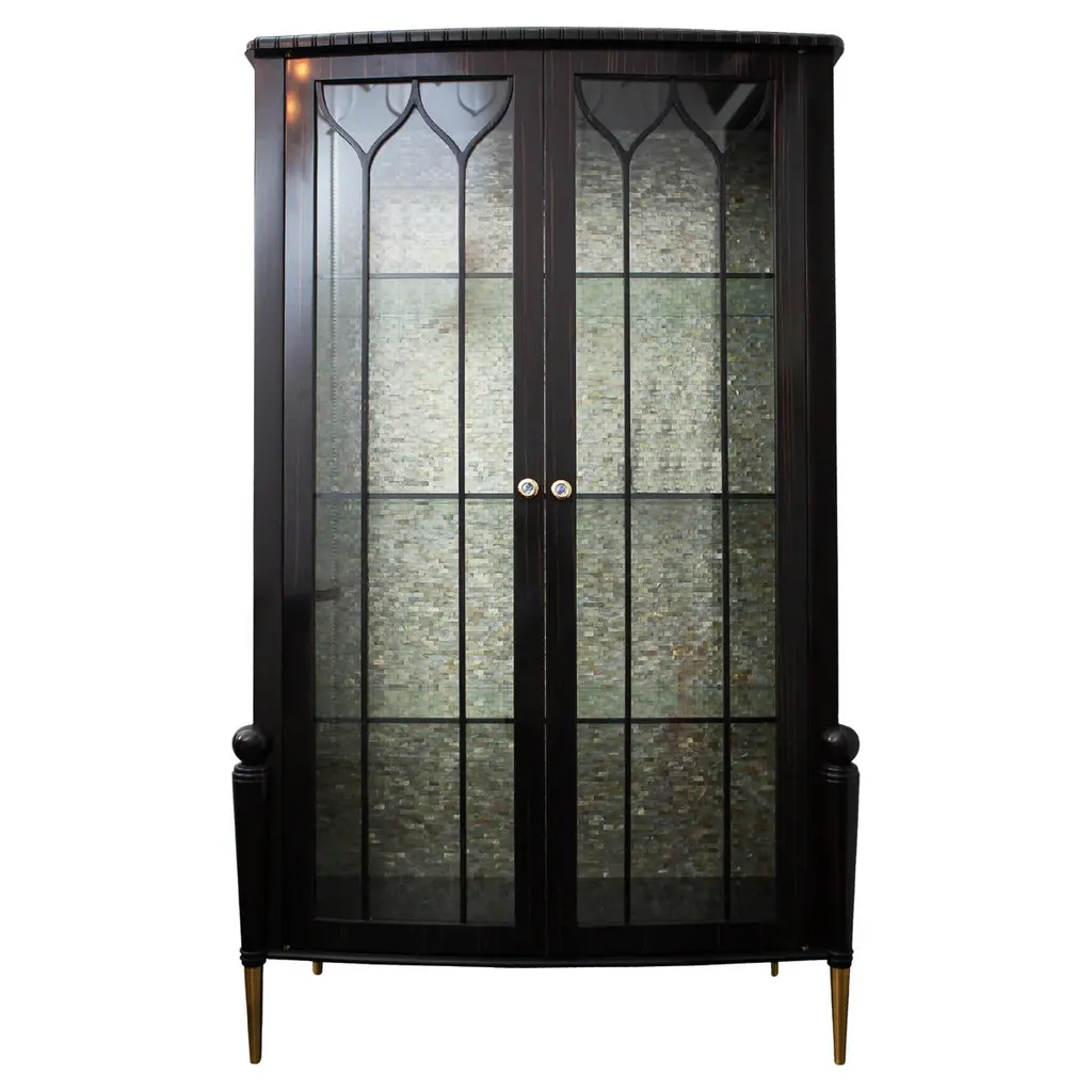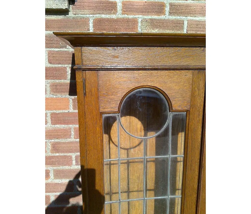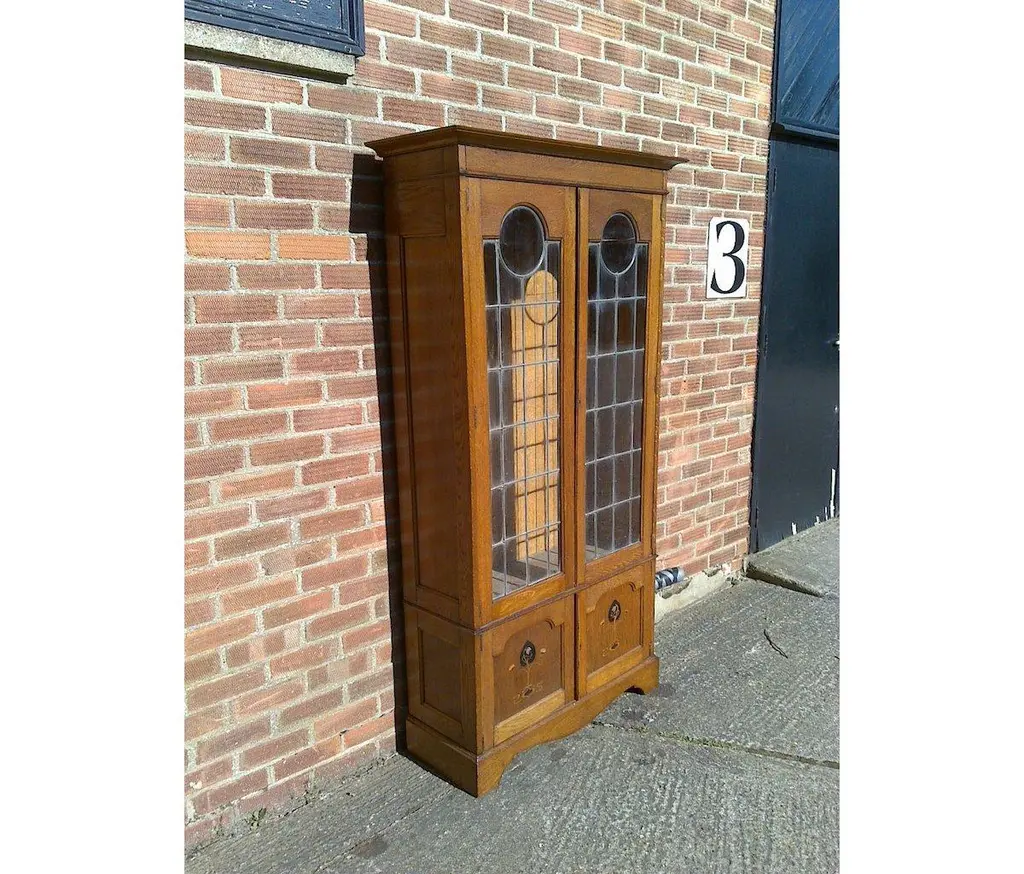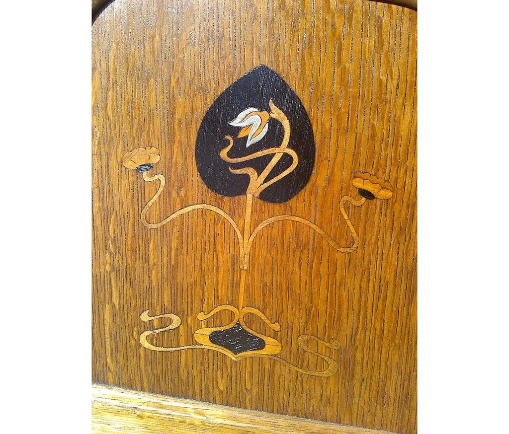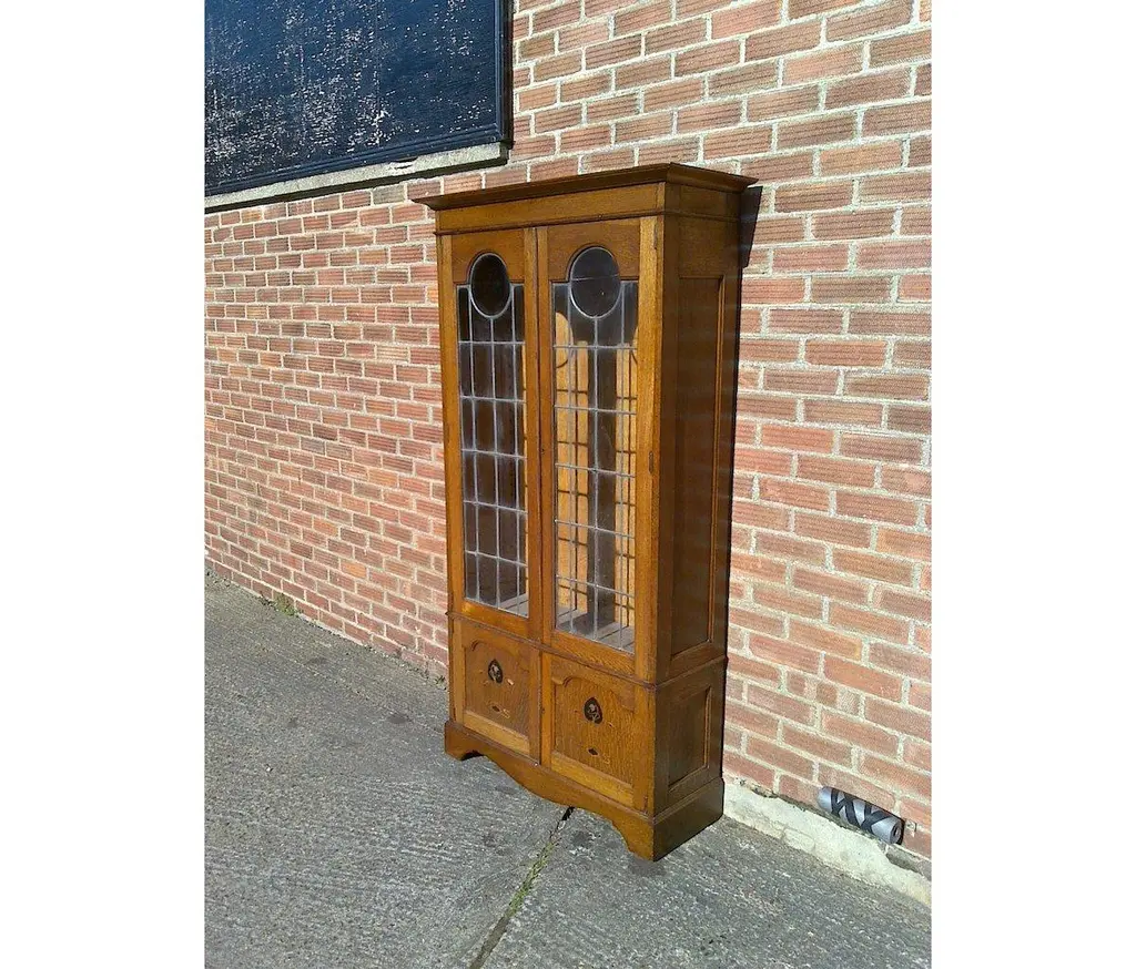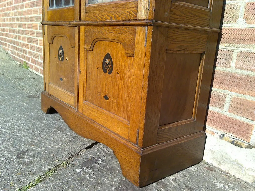 An Arts & Crafts oak bookcase with a flaring cornice, leaded glazed doors with circular details to the tops, the lower cupboard with stylized floral inlays using a combination of pewter, ebonized, and stained sycamore, the whole standing on a double sweeping arch-shaped base.Measures: Height 73 1/2", width of cornice 40", depth of cornice 15 1/2".
