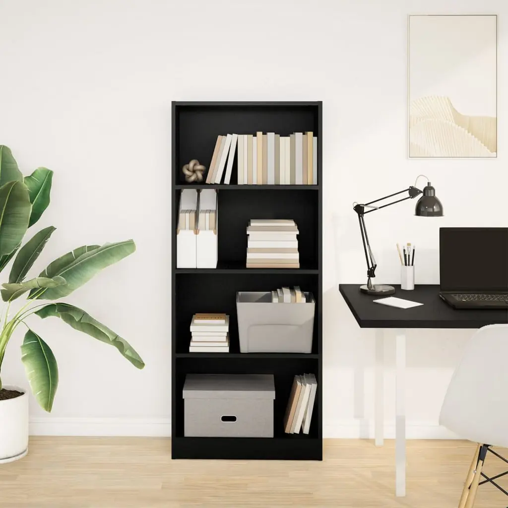 This Modern Black Engineered Wood Bookcase is a stylish piece that combines good looks with practicality, perfect for any living room, office, or bedroom. The smooth matte finish and rectangular shape not only provide a storage solution but also enhance your decor while offering plenty of space for books and other items. Modern Design: This bookcase brings a contemporary vibe with its clean lines and polished finish.Ample Storage: With four roomy shelves, it's perfect for books, decorative items, or framed photos—easy to organize and reach.Durable Material: Made from engineered wood, this bookcase is built to endure while keeping everything dry and in perfect condition.Easy Maintenance: Its sleek surface means a simple wipe with a damp cloth keeps it looking fresh with minimal effort.Versatile Usage: Fits smoothly in any living room, home office, or bedroom, letting your personal style shine.