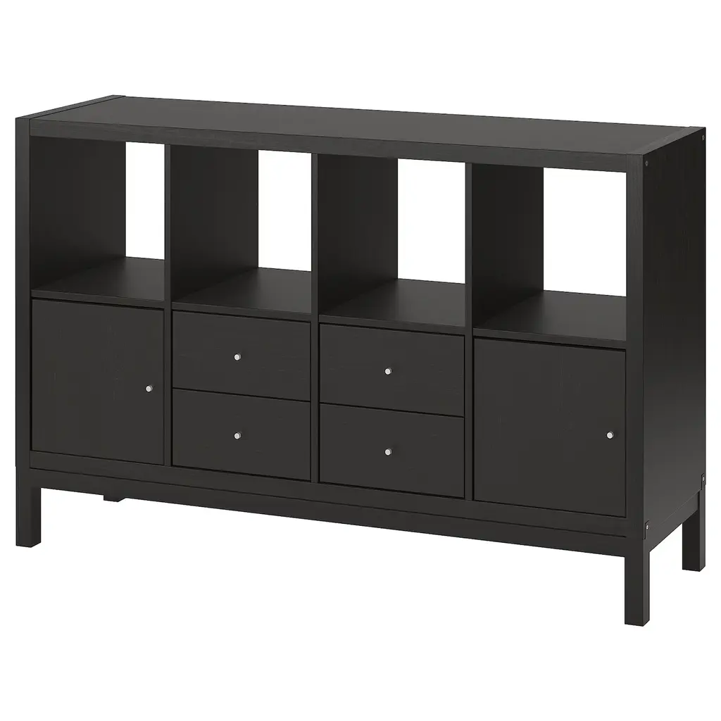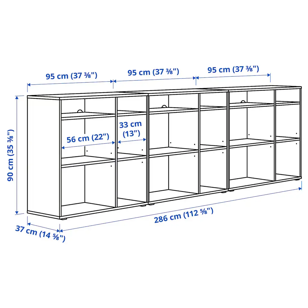 VIHALS Shelving combination - dark gray 112 5/8x14 5/8x35 3/8 ". You get a seamless look when combining 2 or more VIHALS units as the fixed shelves align. Hide messy cables from chargers, devices and decorative lighting by leading them through the outlets in the back.