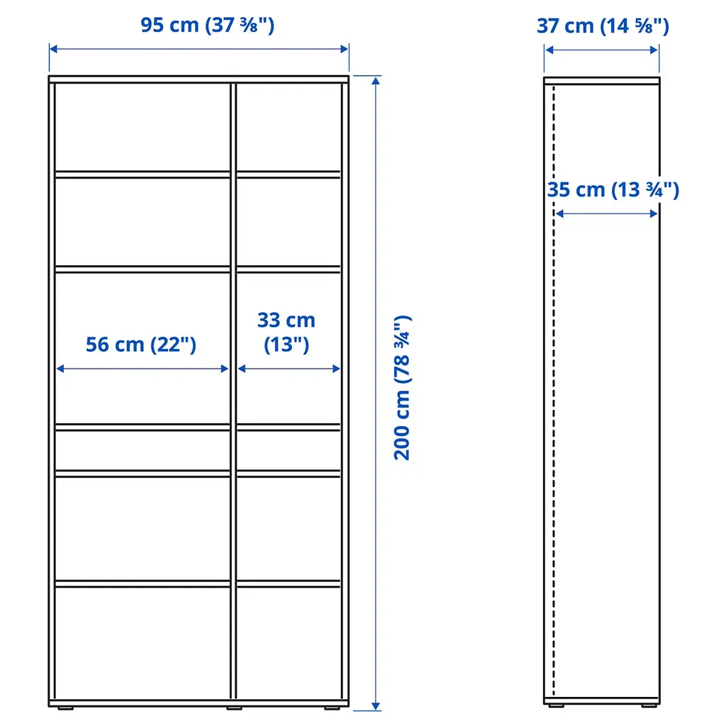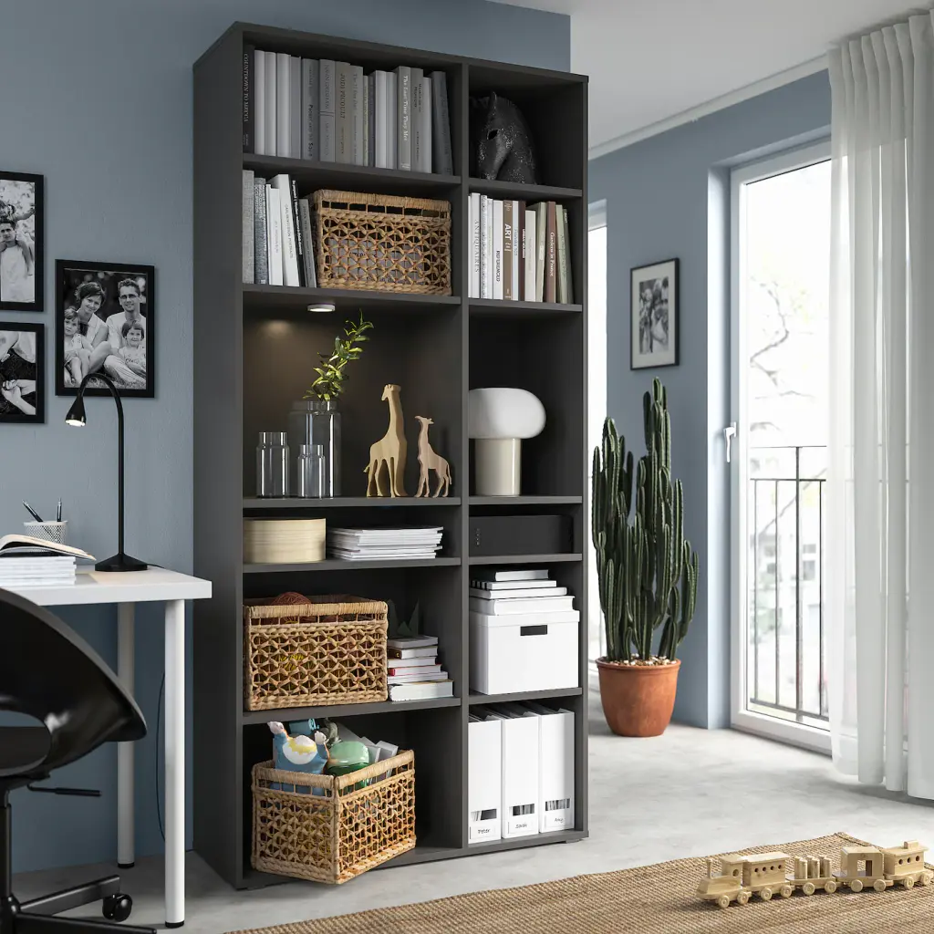 VIHALS Shelving unit with 10 shelves - dark gray 37 3/8x14 5/8x78 3/4 ". You get a seamless look when combining 2 or more VIHALS units as the fixed shelves align. Hide messy cables from chargers, devices and decorative lighting by leading them through the outlets in the back.