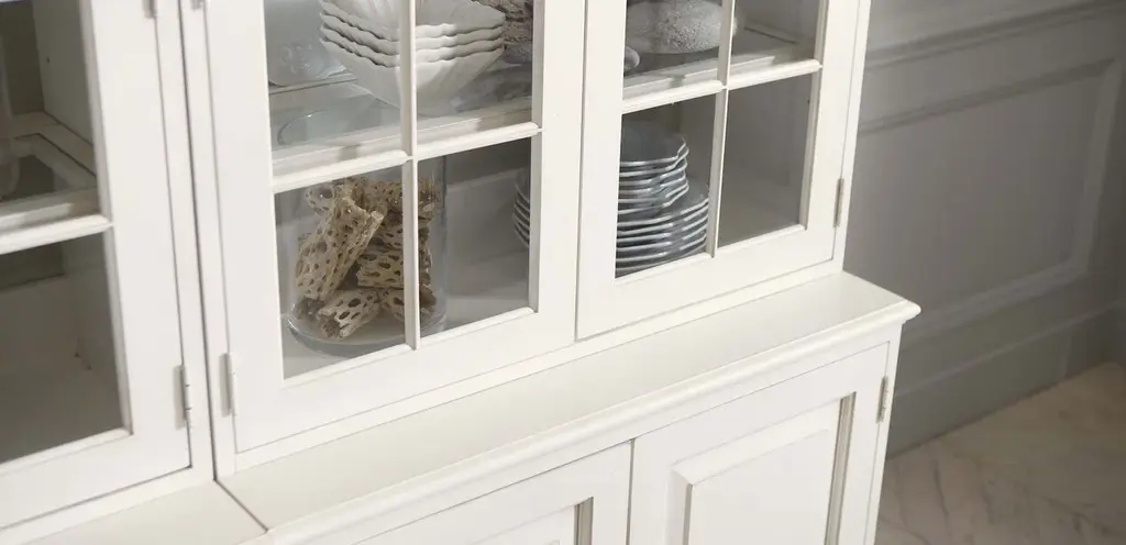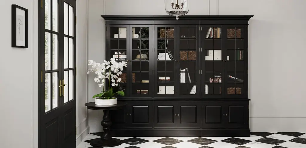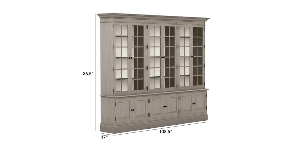 Display trophies and awards, wedding china, keepsakes, or anything else you please behind the sparkling glass doors of our Villa triple library bookcase. Tuck necessities away behind the discreet raised-panel wood doors of the lower cabinets and voila!—a beautiful all-in-one home storage solution.