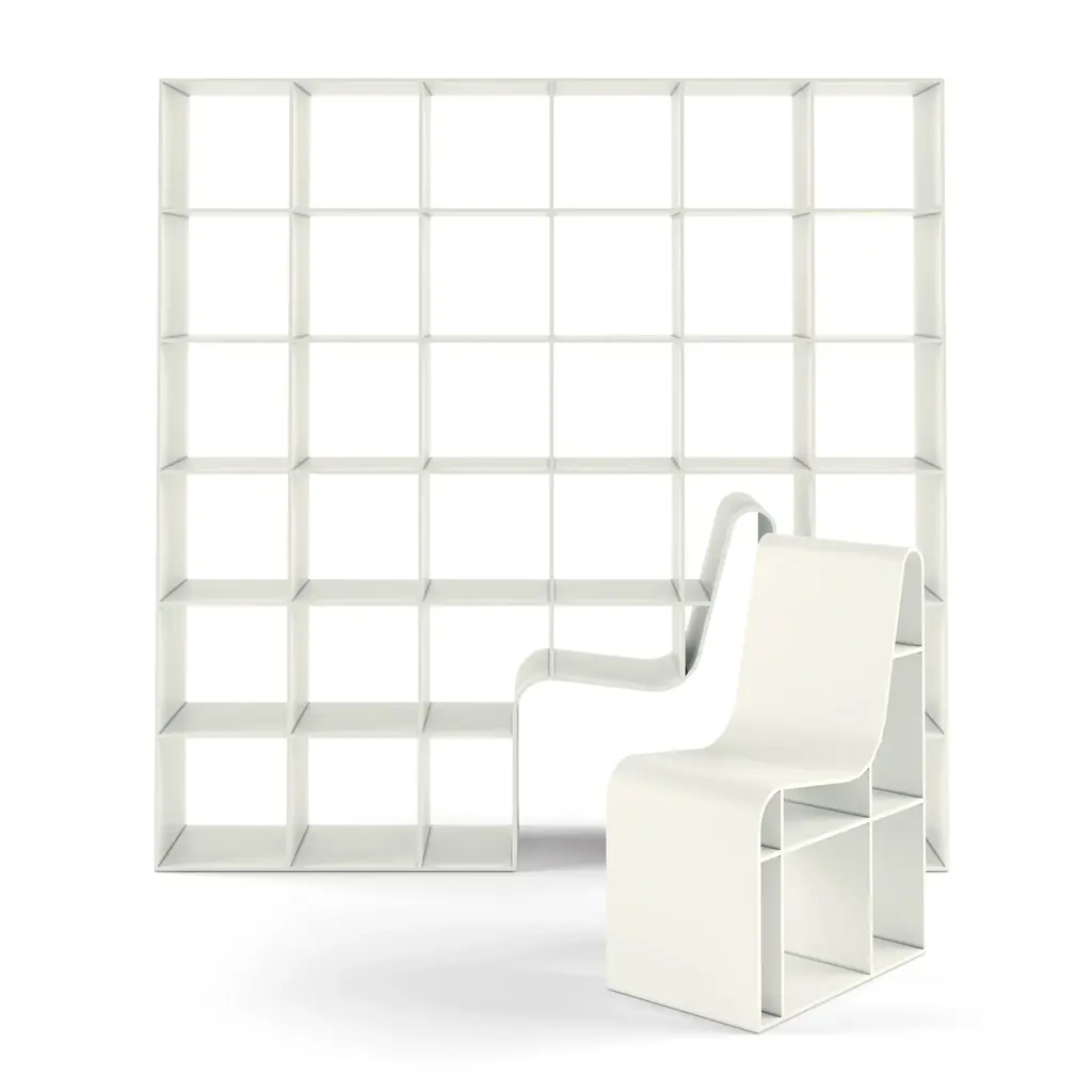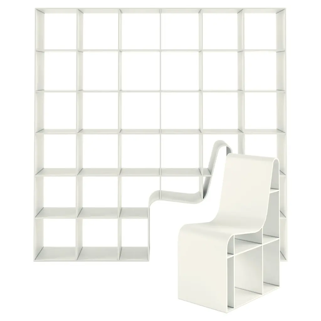 Introducing the White Lacquered Chair Bookcase, also known as the Alias Bookchair. This multipurpose piece combines the sleek design of a chair with the functionality of a bookcase. Keep your favorite books at arm's reach while adding a touch of elegance to any room. A must-have for the sophisticated and literary-minded.