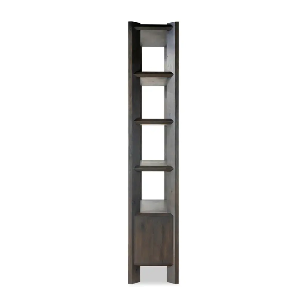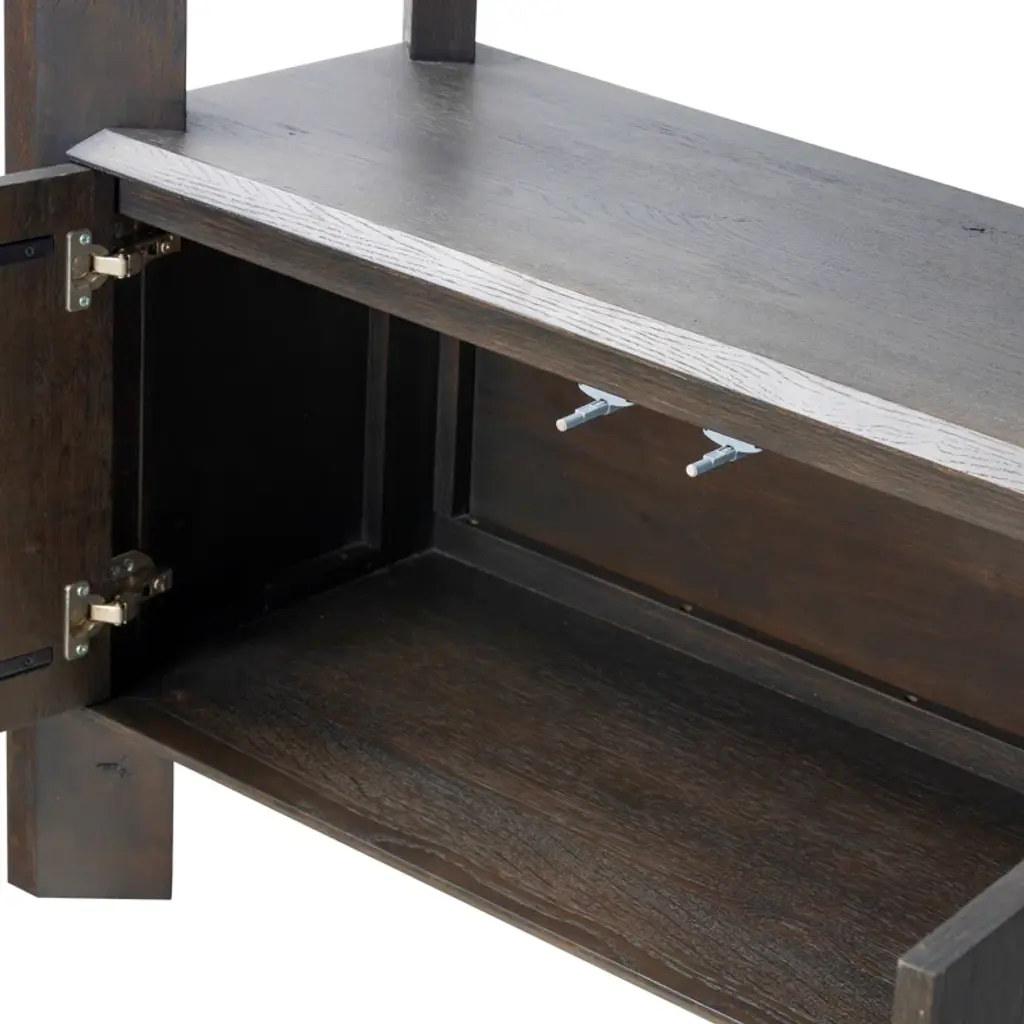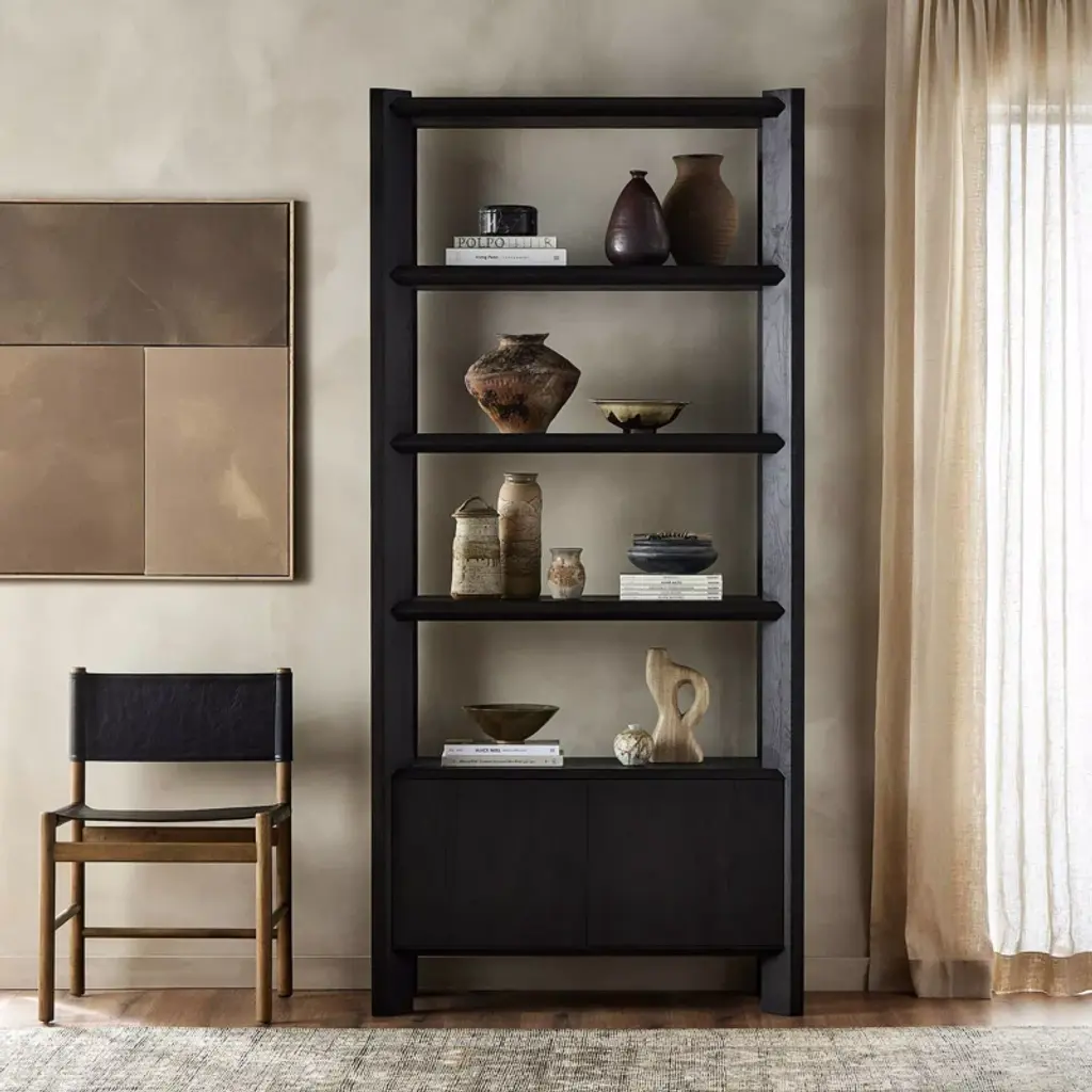 A stunner from every angle. Here, we have a freestanding bookcase that features chamfered edges along the shelves and angled outer legs for bold dimension. It's crafted from solid and engineered wood with a smoky black finish that goes with various styles and color schemes. Four shelf tiers and a lower cabinet with two doors provide a spot to show off books and photos while keeping albums and other accessories tucked neatly away. Best of all, a wall anchor is included for additional stability.